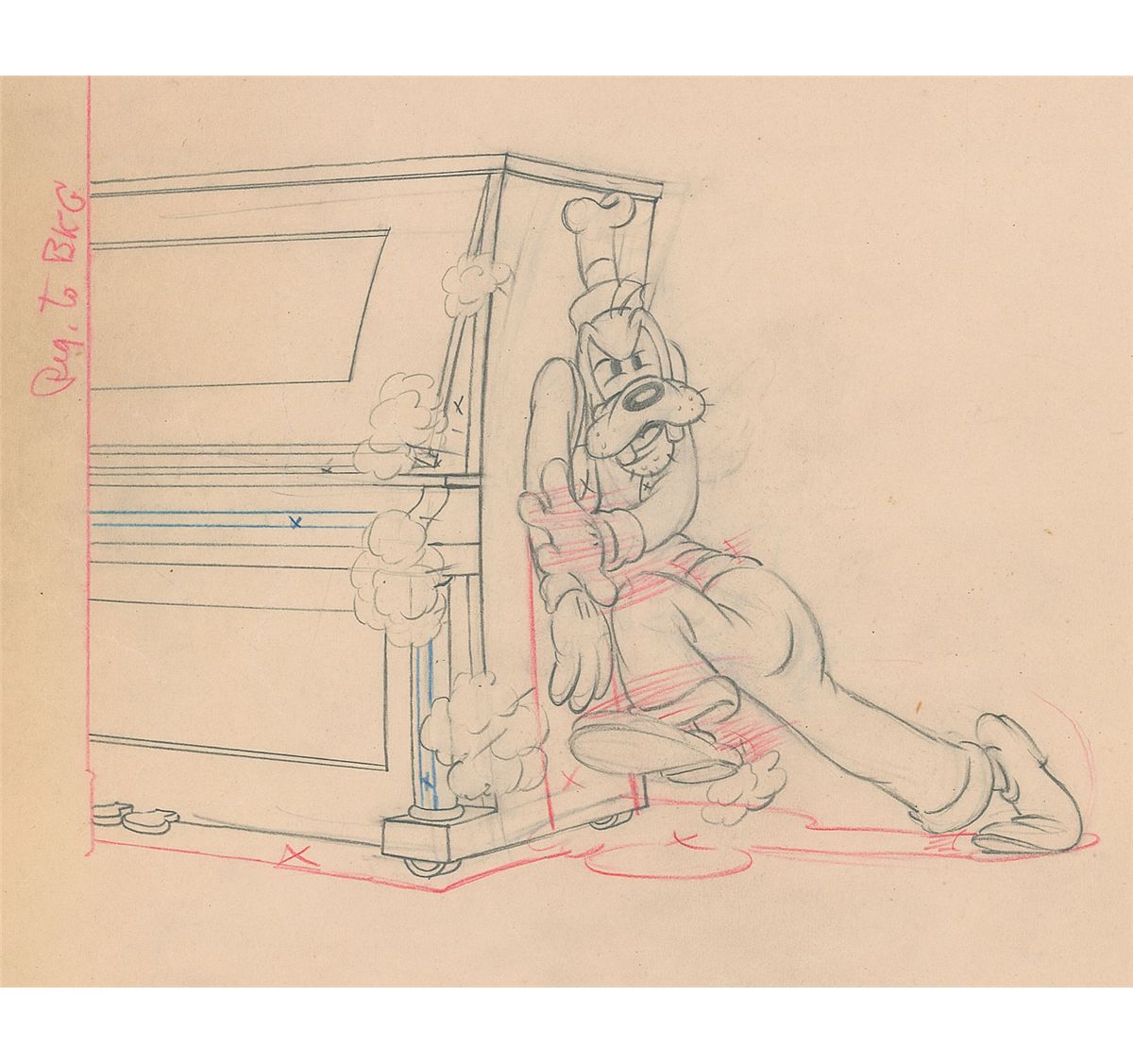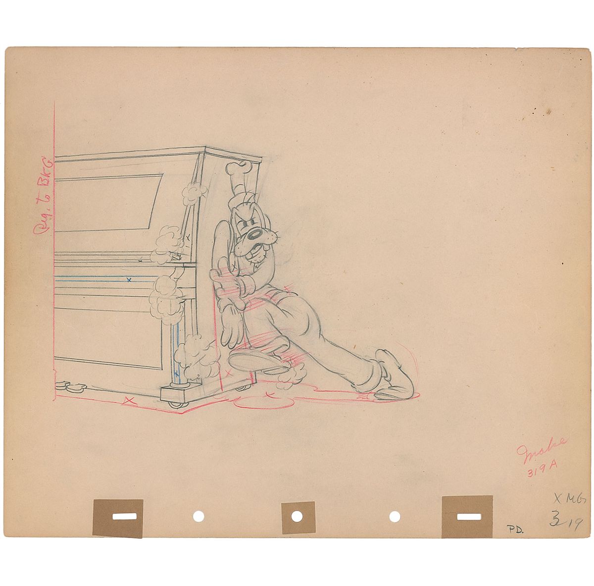 (Walt Disney Studios, 1936) Original production drawing featuring Goofy and a piano from Moving Day. Accomplished in graphite and colored pencil on untrimmed 12 x 10 animation paper. Image of Goofy pushing a piano measures 7.5 x 5.5. In fine condition, with some mild toning to edges.