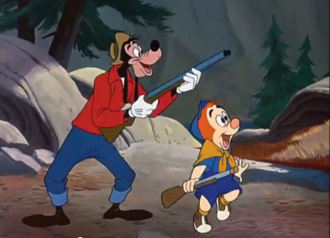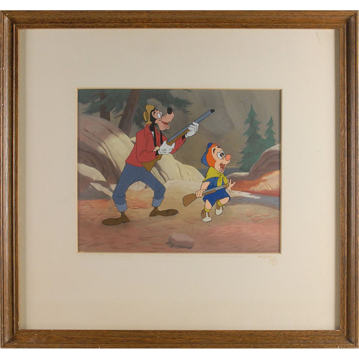 (Walt Disney Studios, 1952) Original production key master cel and background setup featuring Goofy and Son from Father’s Lion, showing both characters joyfully holding shotguns in the woods. The cels have been trimmed and applied to a hand-painted matching production background as prepared by the Art Props Department at Disney Studios. Images measure 5.5 x 6 and 2.75 x 4, with a mat opening of 9.75 x 8. This piece is also framed to an overall size of 17.5 x 16.25. The piece has the original Disney label on the reverse. In fine condition. When Courvoisier galleries closed in 1947, the Disney Art Props Department took over creating these setups, and although they did not sell their art to the public, they were given away to generate good publicity or gifted to VIPs visiting the studio. The scene can be found about two minutes into the short, which was produced in Technicolor and tells the story of Goofy taking his son camping and teaching him how to hunt.