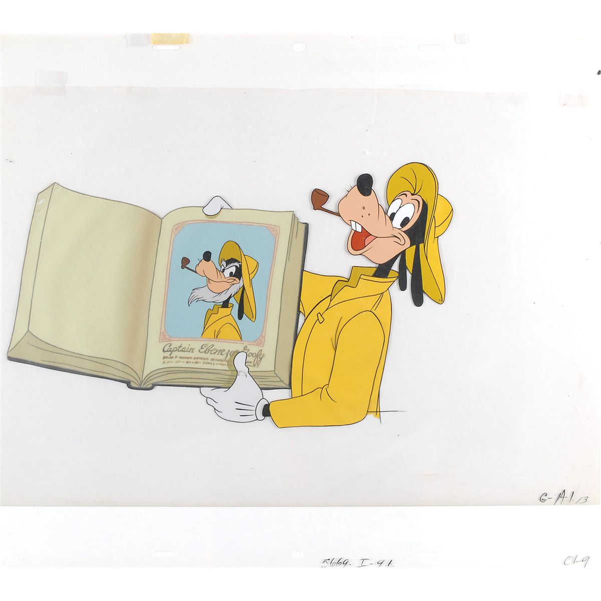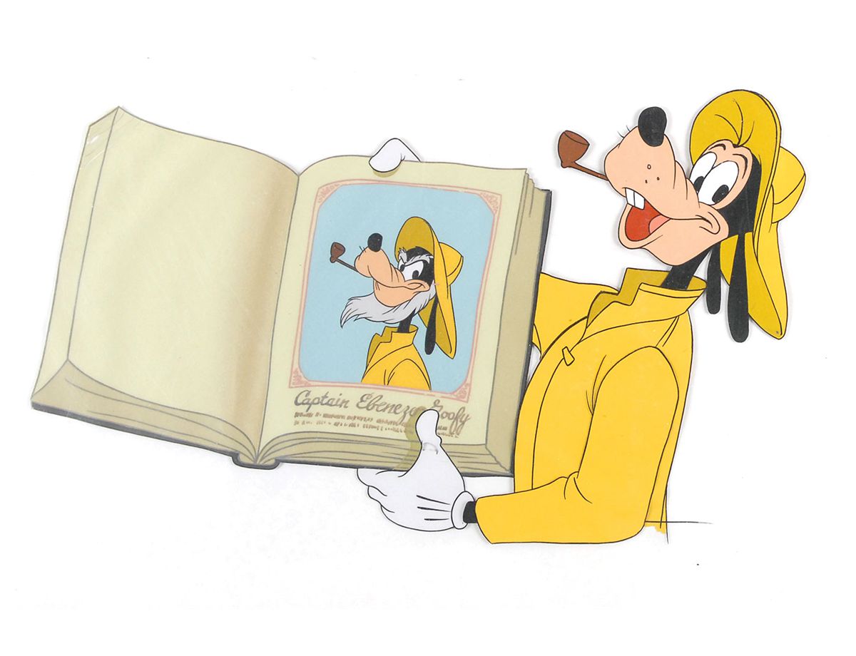 (Walt Disney Studios, Circa 1950s) Original production cel featuring Goofy from The Goofy Adventure Story, showing him wearing a yellow sailor’s raincoat and holding a book open to a page depicting Captain Ebenezer Goofy. Image measures 12 x 7, with overall dimensions of 16 x 14.25. Small chips and cracks to his left thumb and the upper corner of the book, otherwise overall fine condition.
