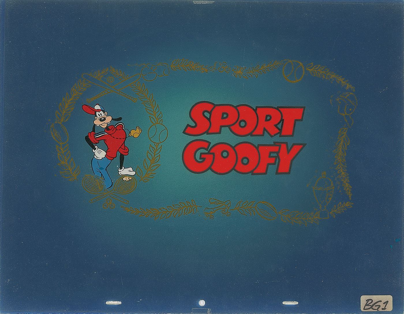 (Walt Disney Studios, circa 1980s) Original keymaster background set-up from one of the Sport Goofy cartoons of the 1980s, featuring the athletic Goofy in a gold-bordered frame of sports equipment, with large red text to the right side, "Sport Goofy." The cel is placed on a matching airbrushed production background. Total image measures 12 x 6, with overall dimensions of 16 x 12.5. In fine condition.