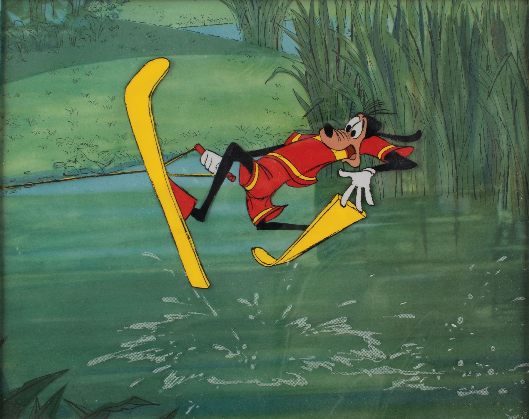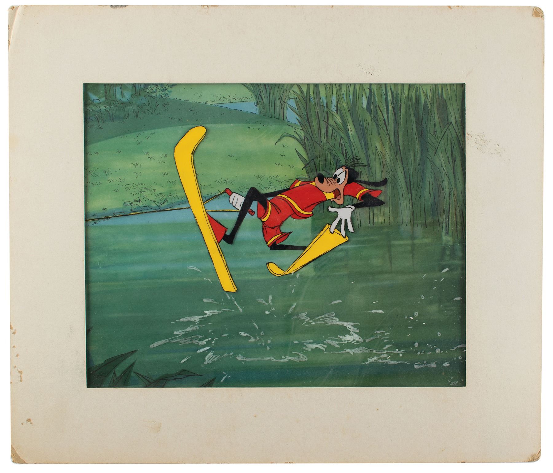 (Walt Disney Studios, 1961) Original production cel featuring Goofy from Aquamania, showing him erratically water skiing. The cel is placed on a Disney litho background. Image measures 5.5 x 4.25, with a mat opening of 10 x 8. Matted to an overall size of 14 x 12. Reverse of the backing bears a gold label stating that it is an original hand-painted celluloid actually used in a Walt Disney production, and was released exclusively at Disneyland. In fine condition, with some soiling and edgewear to the mat.