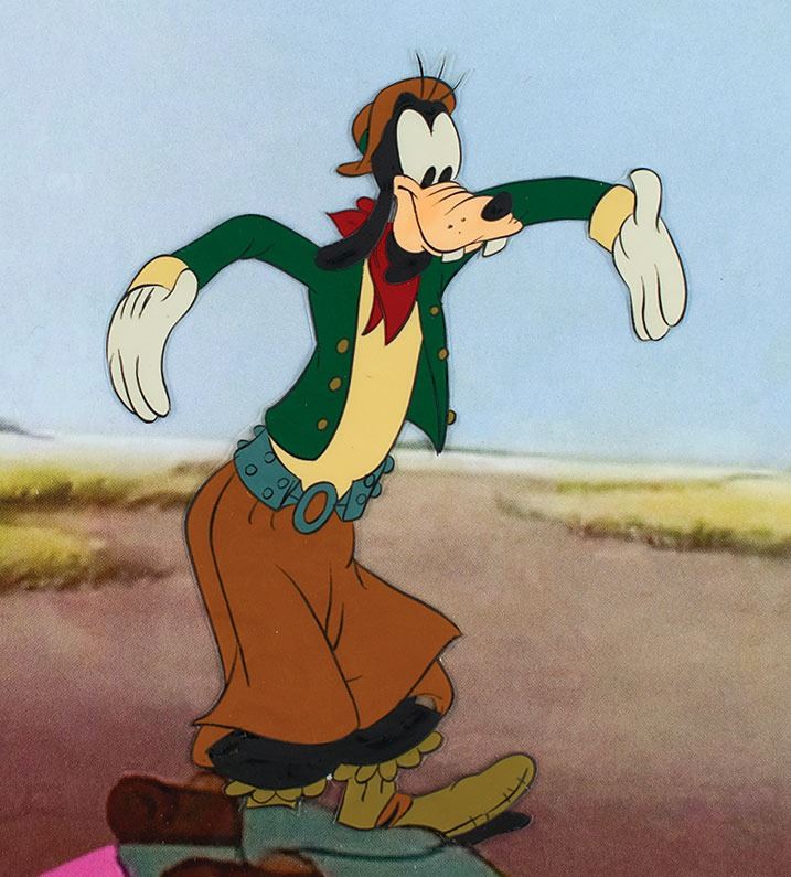 (Walt Disney Studios, 1942) Original production cel of Goofy from El Gaucho Goofy, which shows him preparing to pick up and place supplies on his horse. The cel, which has been trimmed and applied to a cel measuring 12.5 x 10.5, is placed on a matching giclee background from the same film. Image measures 3.5 x 4.75, with overall dimensions of 13.25 x 11.25. In fine condition, with some lifting to paint on Goofy's legs.