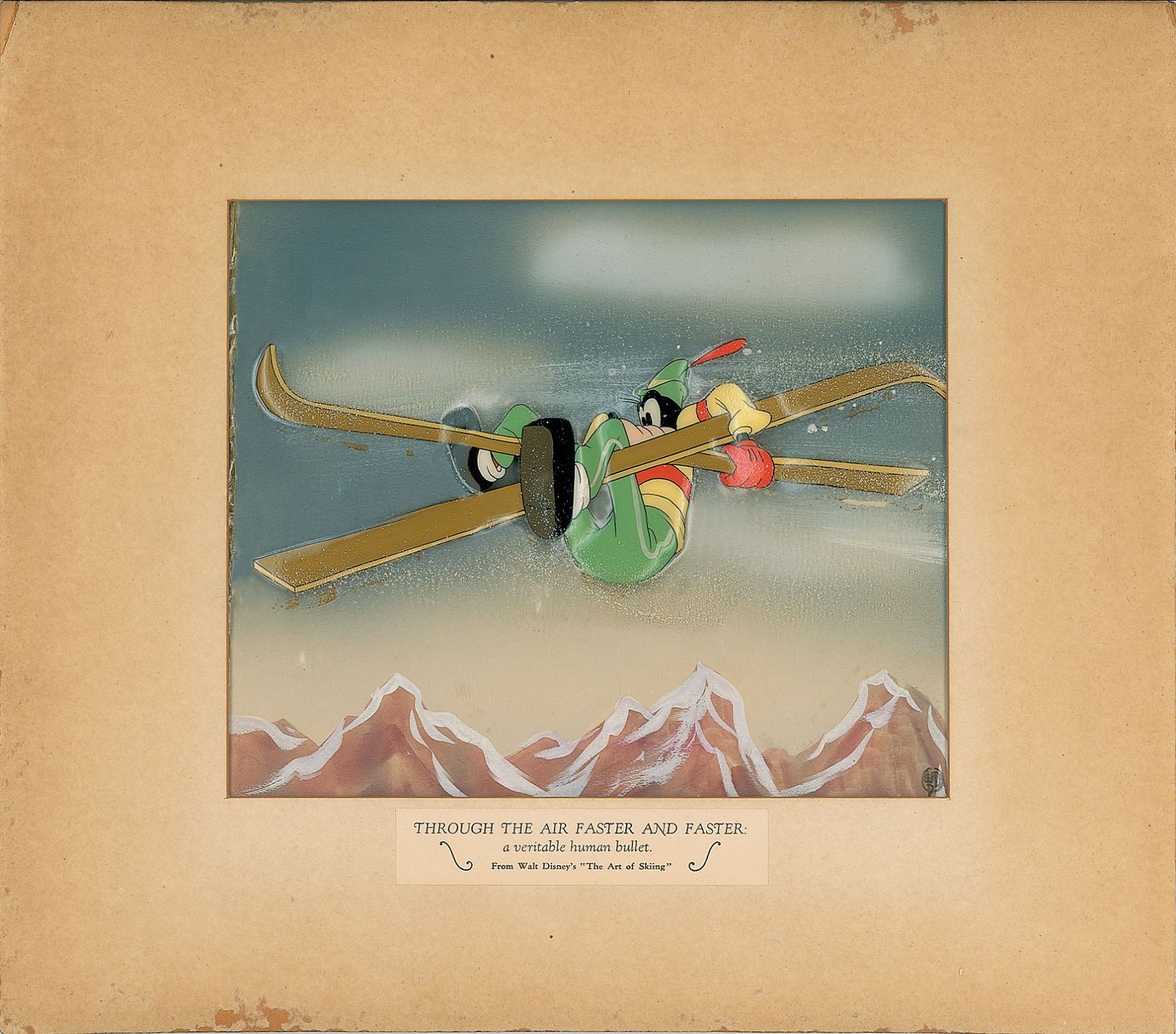 (Walt Disney Studios, 1941) Original production cel featuring Goofy from The Art of Skiing, showing him awkwardly flying through the air atop his crisscrossed skis. The cel has been trimmed and applied to a hand-painted background as prepared by Courvoisier Galleries for sale. Image measures 8.5 x 3.5, with a mat opening of 9 x 7.5. Mat dimensions are 14.75 x 13. The mat bears an affixed label reading: "Through the Air Faster and Faster: a veritable human bullet. From Walt Disney's 'The Art of Skiing.'" In fine condition, with some significant rippling to celluloid, and toning and chipping to mat.