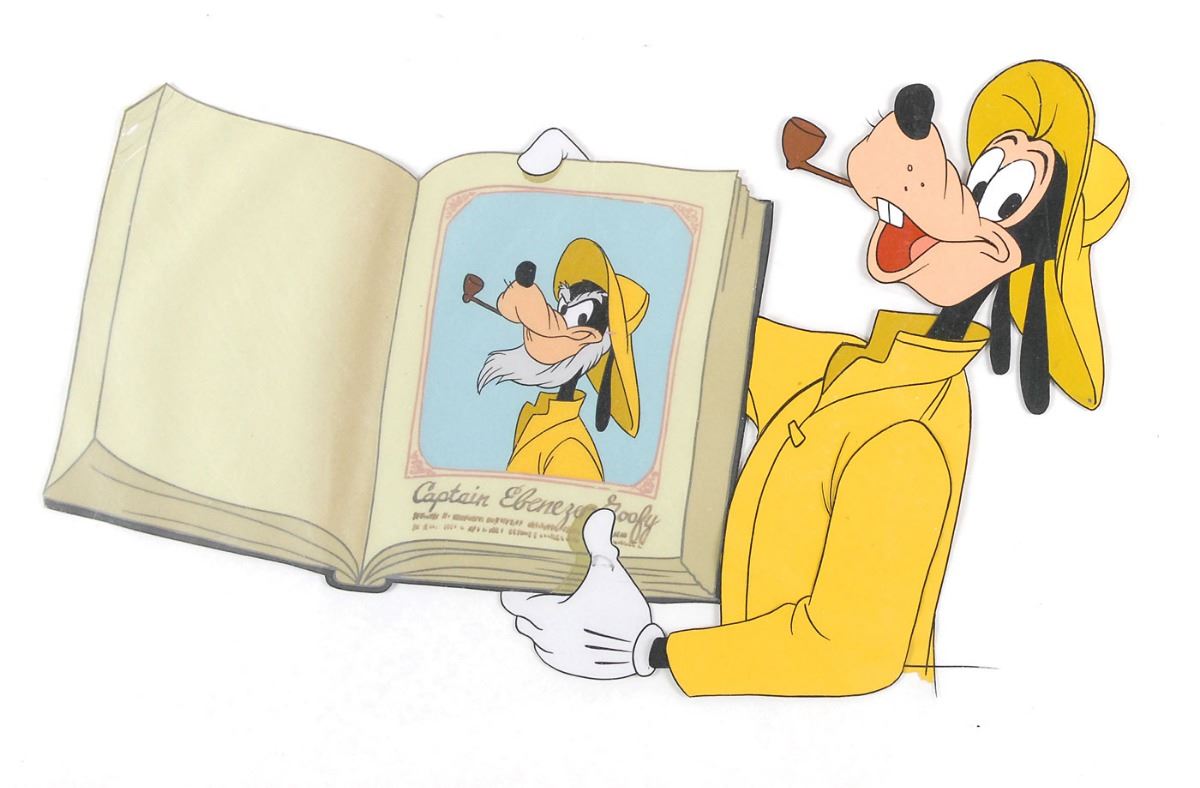 (Walt Disney Studios, circa 1950s) Original production cel featuring Goofy from The Goofy Adventure Story, showing him wearing a yellow sailor’s raincoat and holding a book open to a page depicting Captain Ebenezer Goofy. Image measures 12 x 7, with overall dimensions of 16 x 14.25. Small chips and cracks to his left thumb and the upper corner of the book, otherwise overall fine condition.