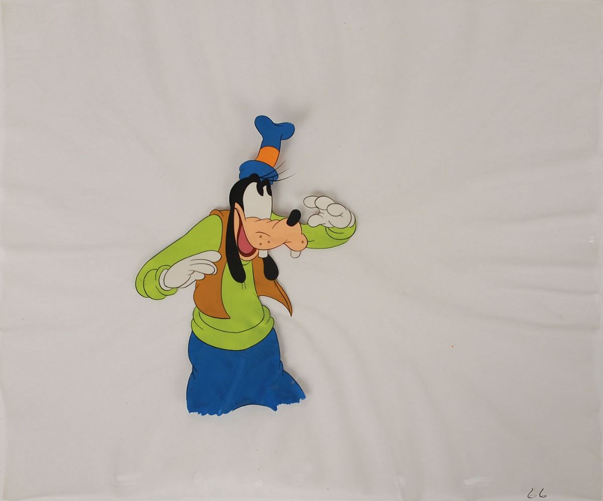 (Walt Disney Studios, circa 1937) Original production cel from a Mickey Mouse short cartoon, showing Goofy in a jubilant half-length pose. The cel is slightly trimmed to 11.25 x 9.5 Image measures 4.25 x 5.75. In fine condition, with some wrinkling.