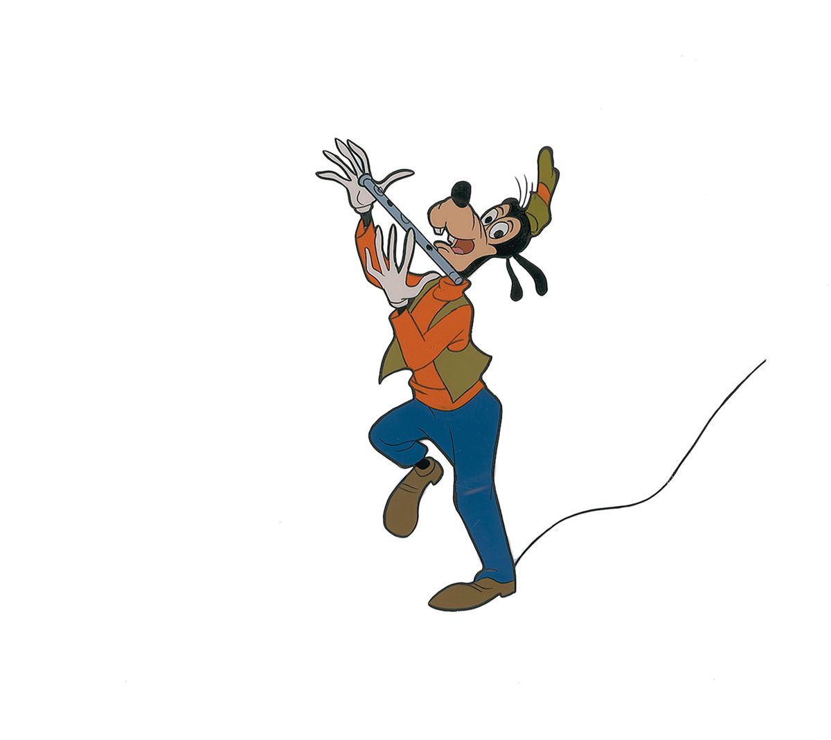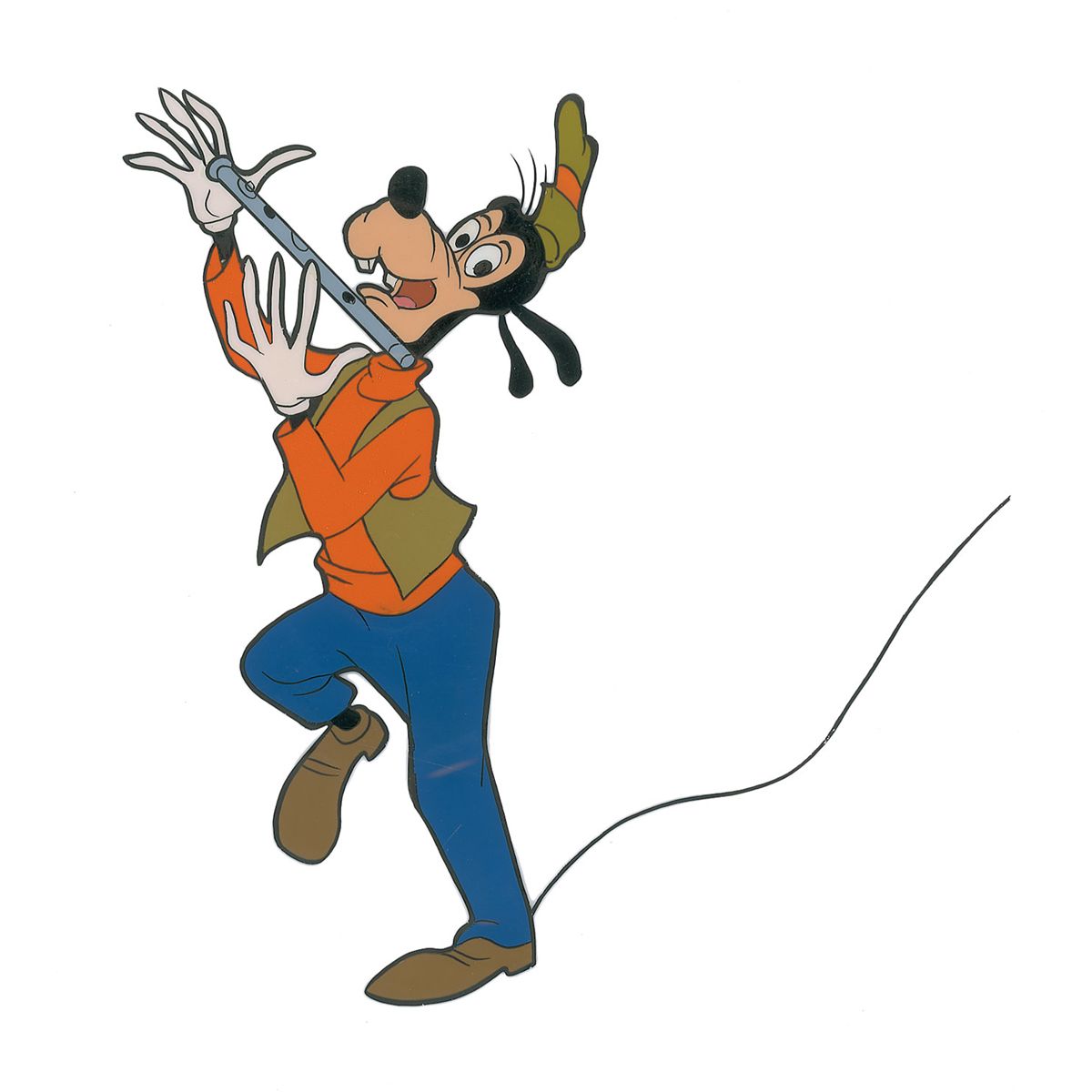 (Walt Disney Studios, 1955) Original production cel featuring Goofy from the opening of The Mickey Mouse Club. Image measures 2.5 x 7, with overall dimensions of 11.75 x 9, and shows Goofy marching while playing a flute. In fine condition.