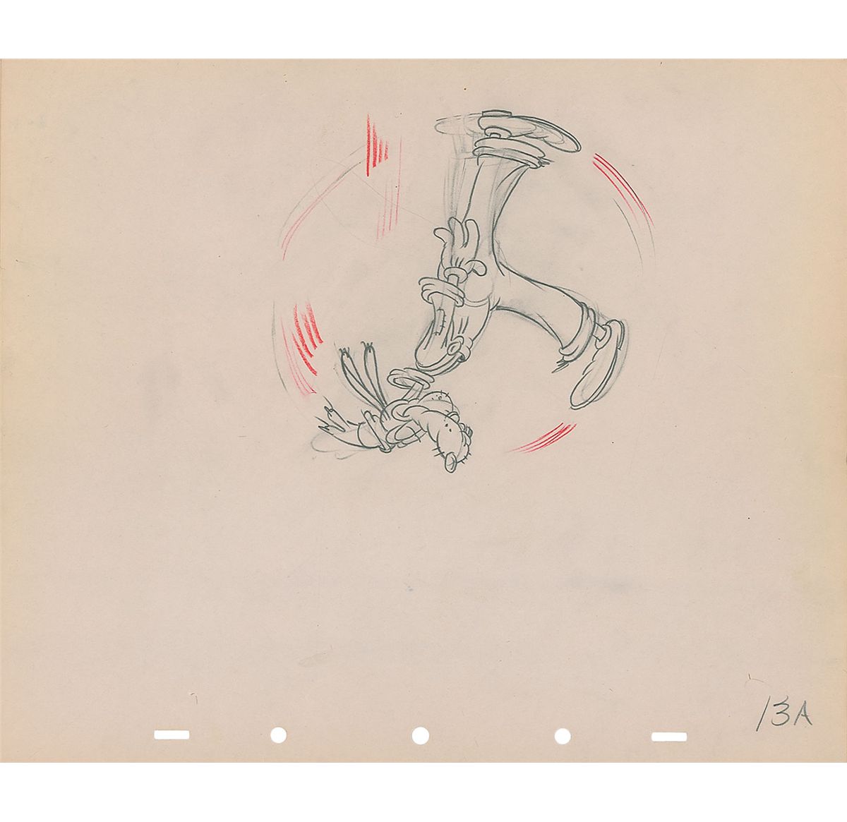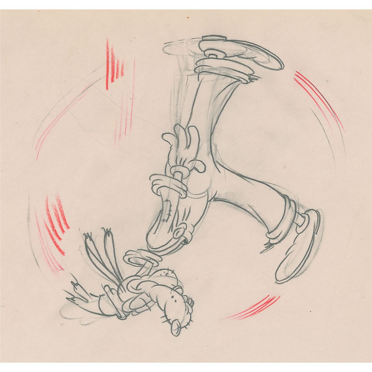 (Walt Disney Studios, 1937) Original production drawing featuring Goofy from Clock Cleaners, showing Goofy spinning around in a circle. Accomplished in graphite and red pencil on untrimmed 12 x 10 animation paper. Image measures 5.5 x 5. In fine condition.