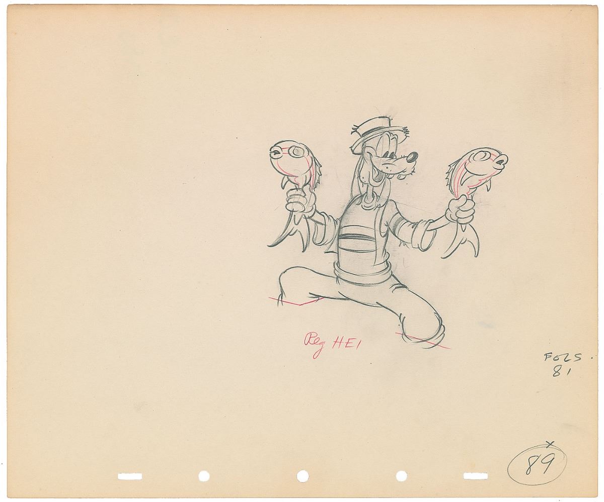(Walt Disney Studios, 1939) Original production drawing featuring Goofy from Goofy and Wilbur, showing the angling title character holding up two fish only moments after his grasshopper friend tricked them into a net. Accomplished in graphite and colored pencil on untrimmed 12 x 10 animation paper. Image measures 4.75 x 4.75. In fine condition.