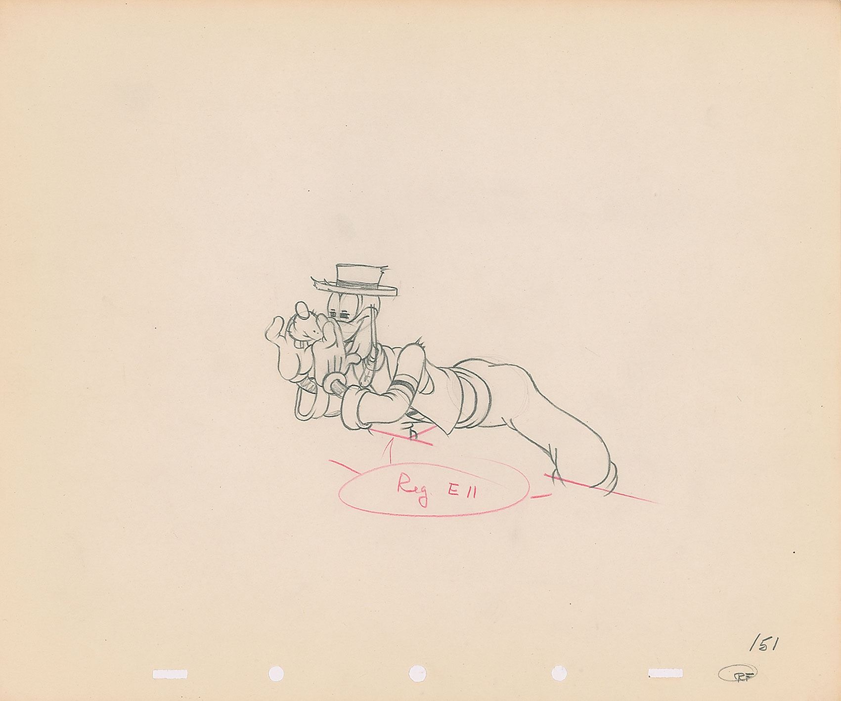 (Walt Disney Studios, 1939) Original production drawing featuring Goofy from Goofy and Wilbur, his first solo starring role, showing the famous dog hollering to his grasshopper fishing pal: 'Bring me back a big fat one, Wilbur!' Accomplished in graphite and colored pencil on untrimmed 12 x 10 animation paper, marked "151" in the lower right corner. Image measures 5 x 3.5. In fine condition.