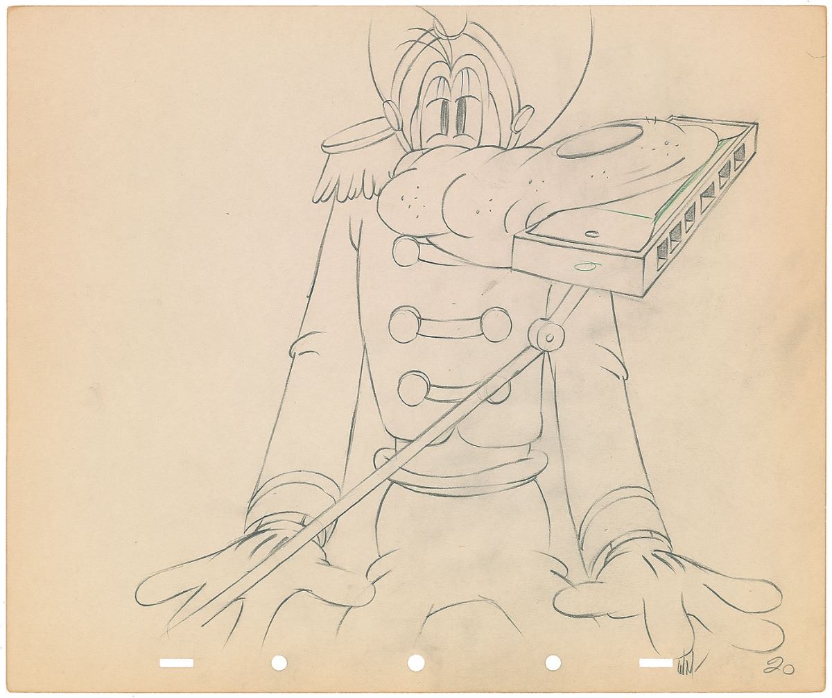 (Walt Disney Studios, 1937) Original production drawing featuring Goofy from Mickey’s Amateurs, showing the lovable dog playing the harmonica in his multi-instrument one-man band. Accomplished in graphite and colored pencil on untrimmed 12 x 10 animation paper. Image measures 9.5 x 9.75. In fine condition.