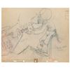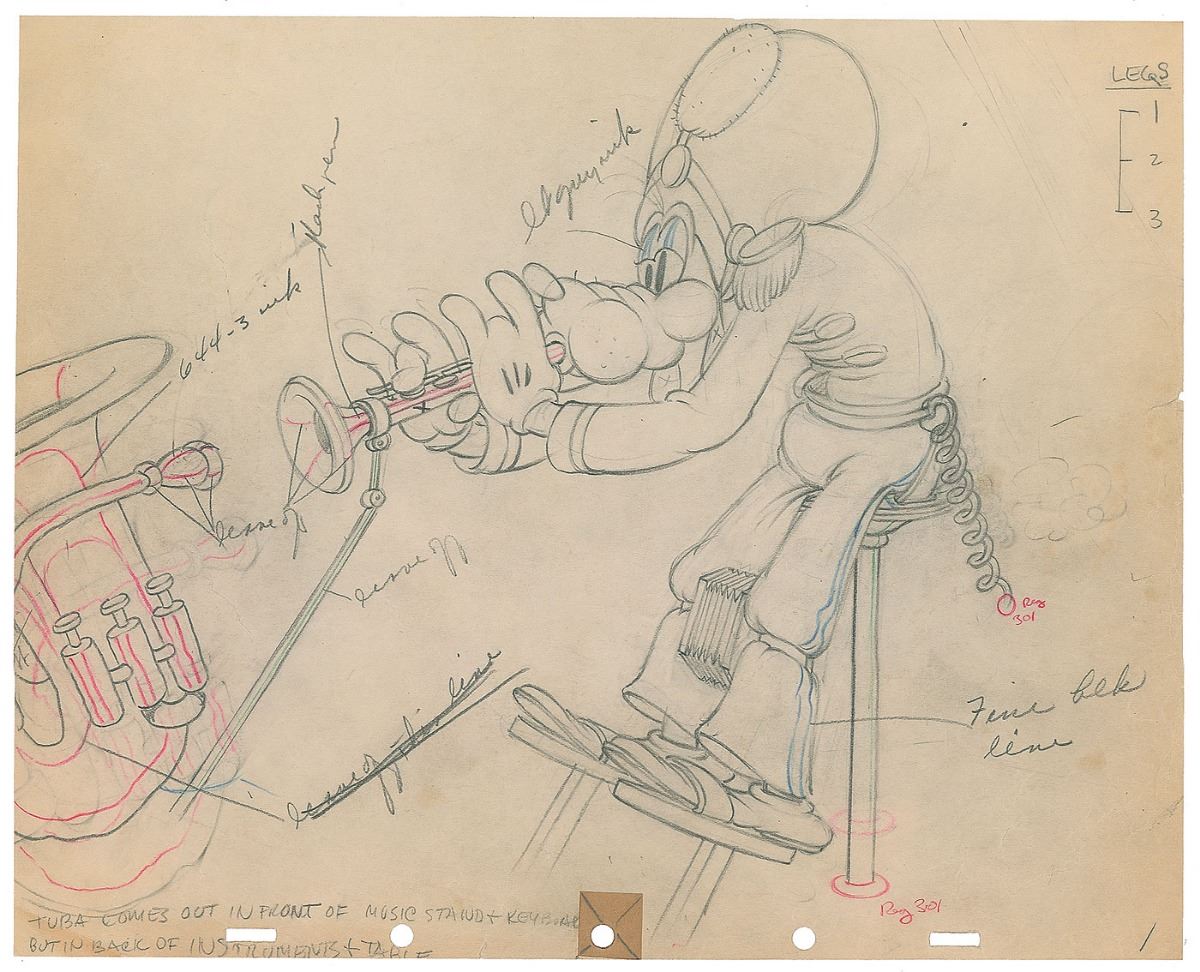 (Walt Disney Studios, 1937) Exceptional original production drawing featuring Goofy from Mickey’s Amateurs, showing the musical pooch in full band leader attire while he attempts to play his ‘50-piece band,’ a multi-instrumental device on wheels. Accomplished in graphite and colored pencil on slightly trimmed 11.5 x 9.25 animation paper. Image measures 10 x 8.75. In fine condition, with trivial creases and a small tape-repaired tear to right edge.