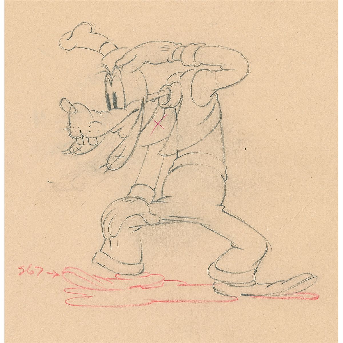 (Walt Disney Studios, 1936) Original production drawing featuring Goofy from Moving Day, showing him scratching his head. Accomplished in graphite and colored pencil on untrimmed 12 x 10 animation paper. Image measures 4.5 x 4.75. In fine condition.