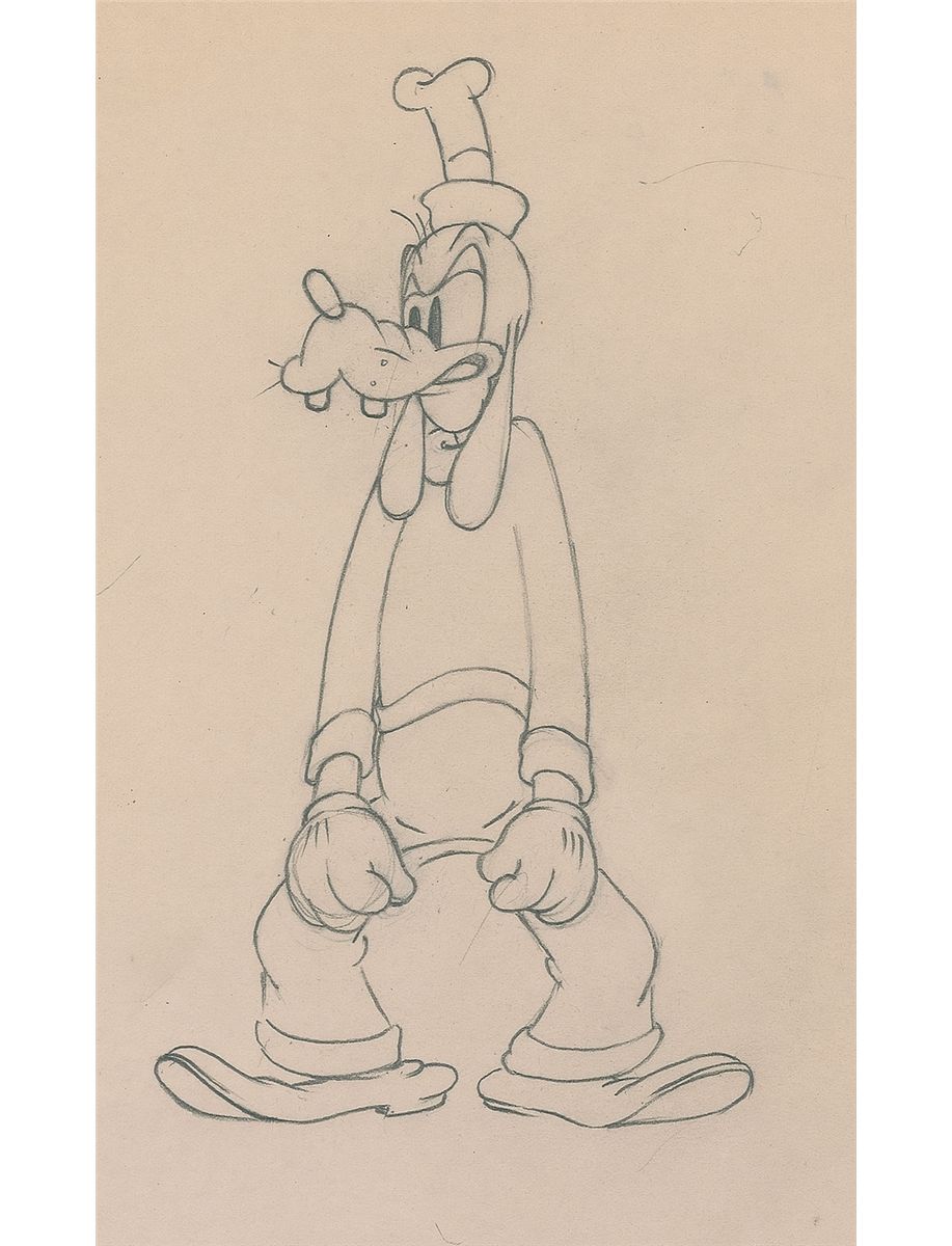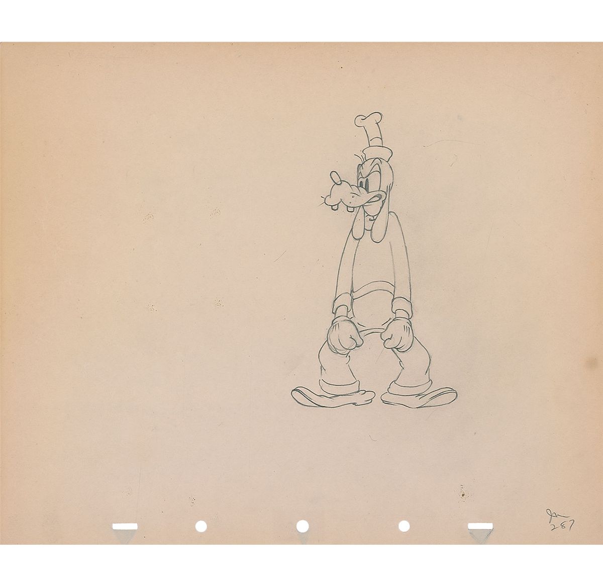 (Walt Disney Studios, 1936) Original production drawing featuring Goofy from Moving Day, showing the cartoon dog looking quite irritated. Accomplished in graphite on untrimmed 12 x 10 animation paper. Image measures 3.25 x 5.75. In fine condition, with creasing to the left side of the sheet.