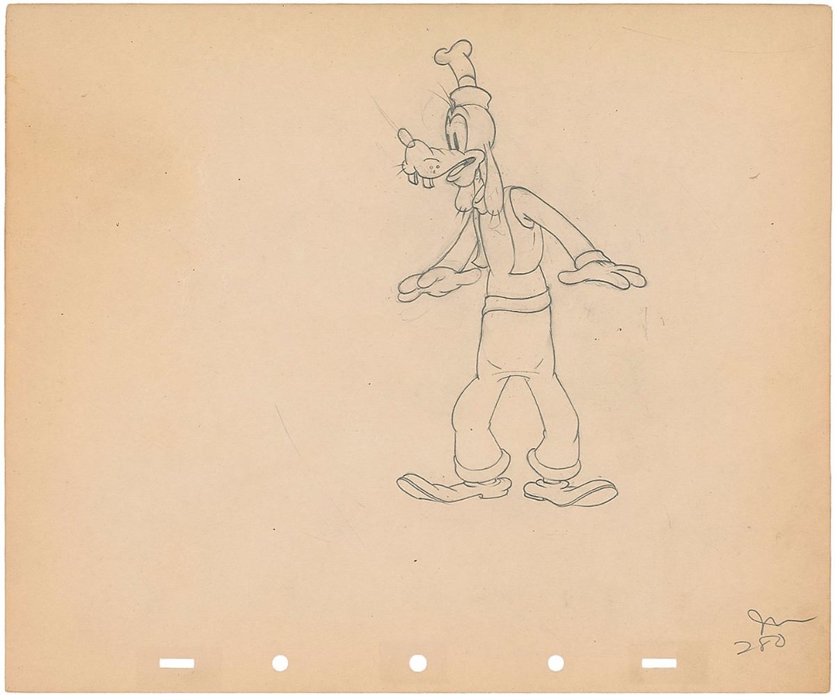 (Walt Disney Studios, 1936) Original production drawing featuring Goofy from Moving Day. Accomplished in graphite on untrimmed 12 x 10 animation paper. Image measures 4 x 6.75. In fine condition, with a couple creases to the left side.