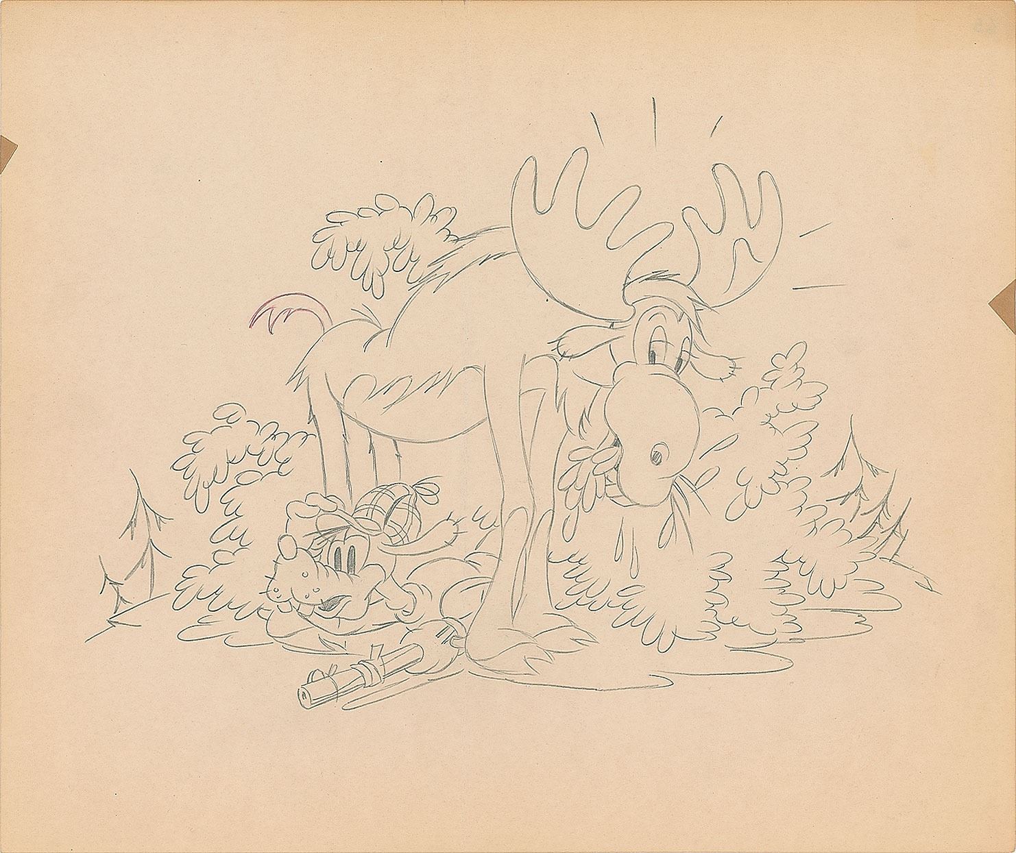 (Walt Disney Studios, 1937) Original publicity drawing featuring Goofy from Moose Hunters, showing him in hunting gear and peering out from underneath the moose. Accomplished in graphite on trimmed 12 x 10 animation paper. Total image measures 10 x 7. In fine condition, with a light central vertical fold.