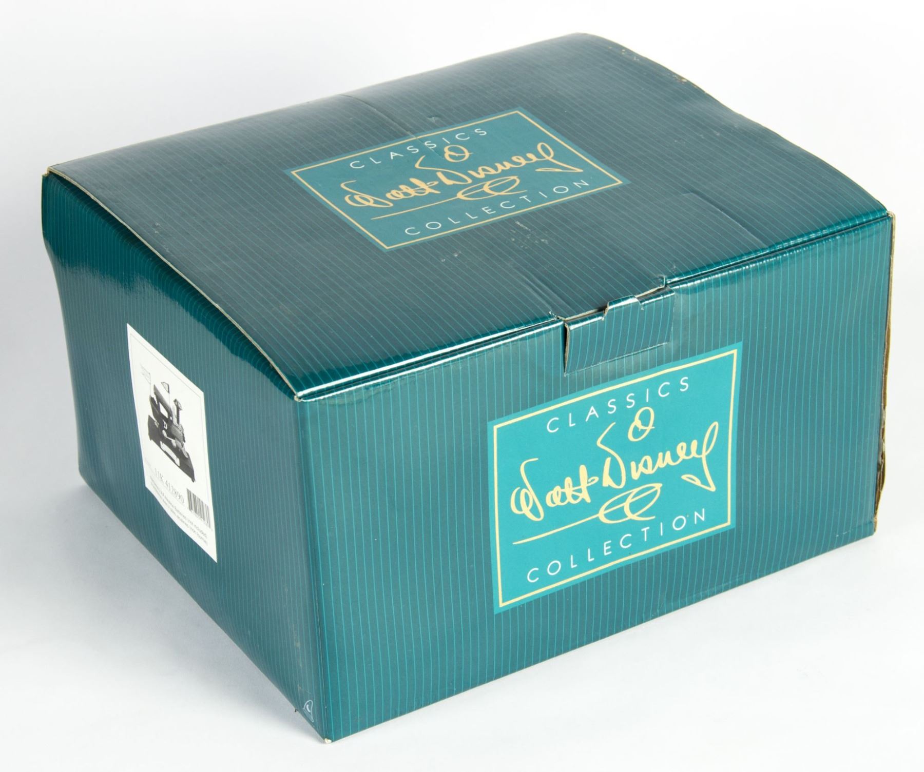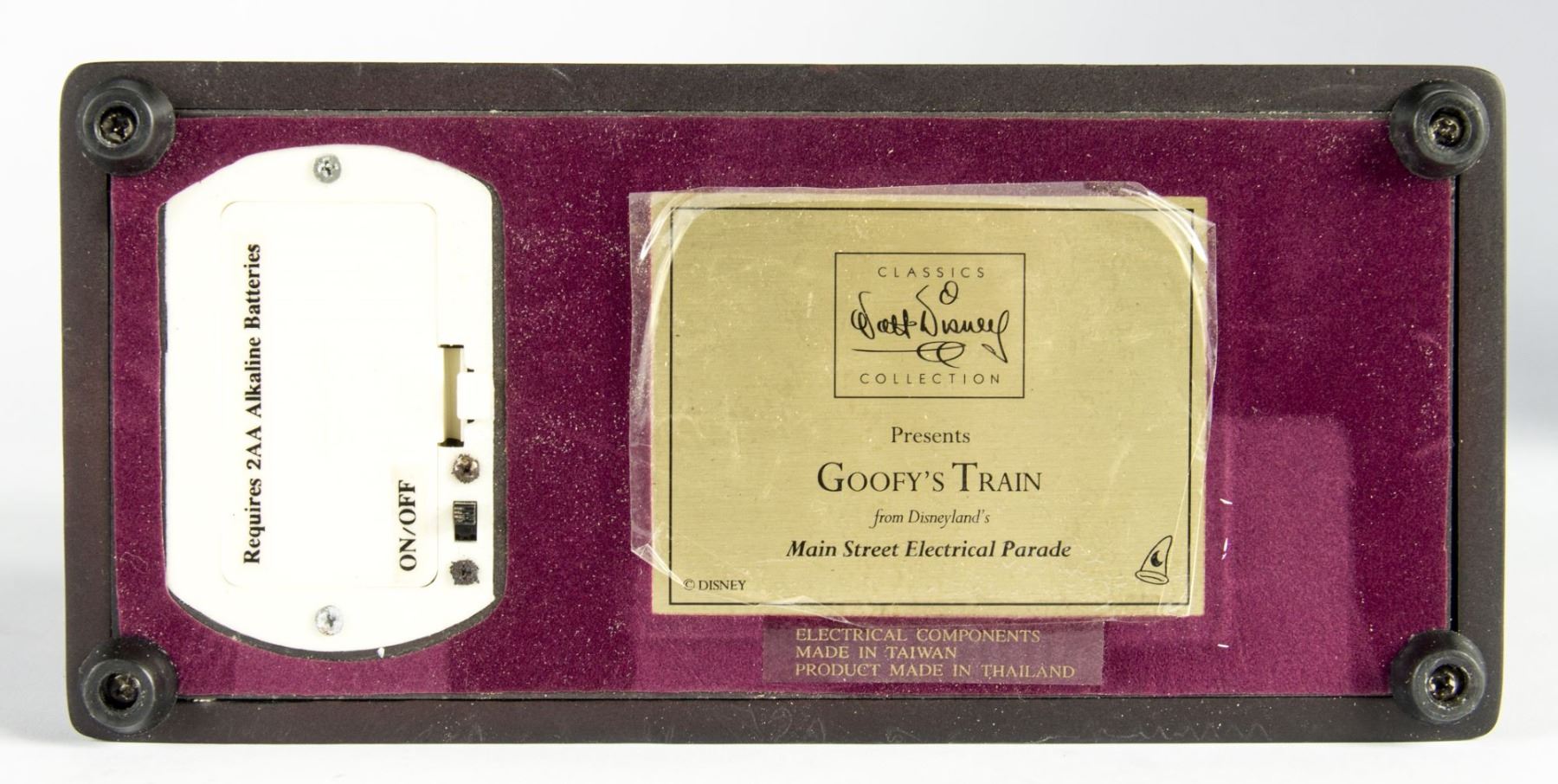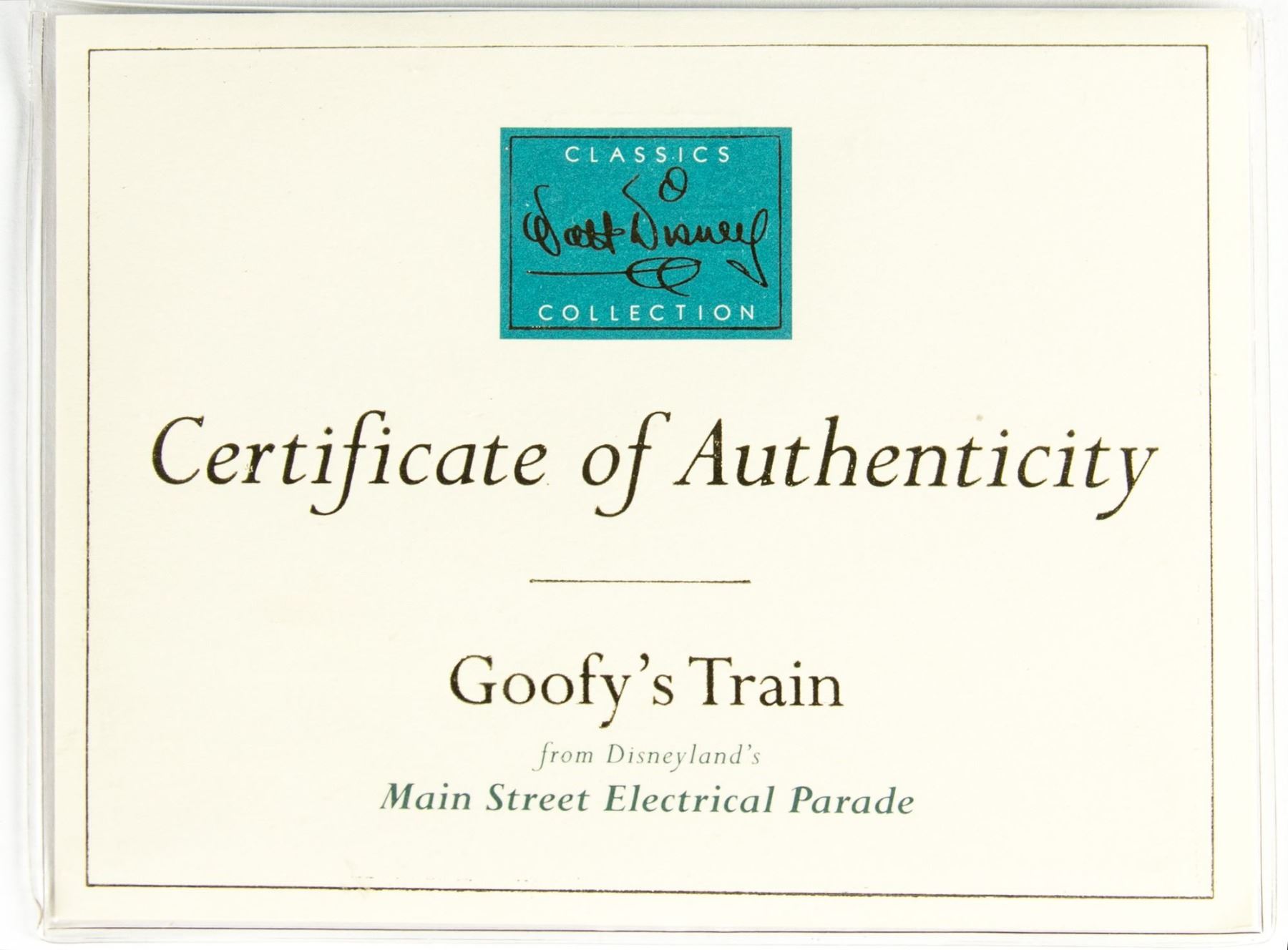 (Disneyland, 1999) A limited edition Walt Disney Classics Collection figure titled "Goofy's Train" that is based on a parade float from the Main Street Electrical Parade. The battery-powered figure was created by Larry Nikolai to recreate the brilliance of the lights used in the actual parade. This figure comes in its original box and packaging with its certificate of authenticity. The figure measures 6" tall, and is in very fine condition with some wear to the outer box.