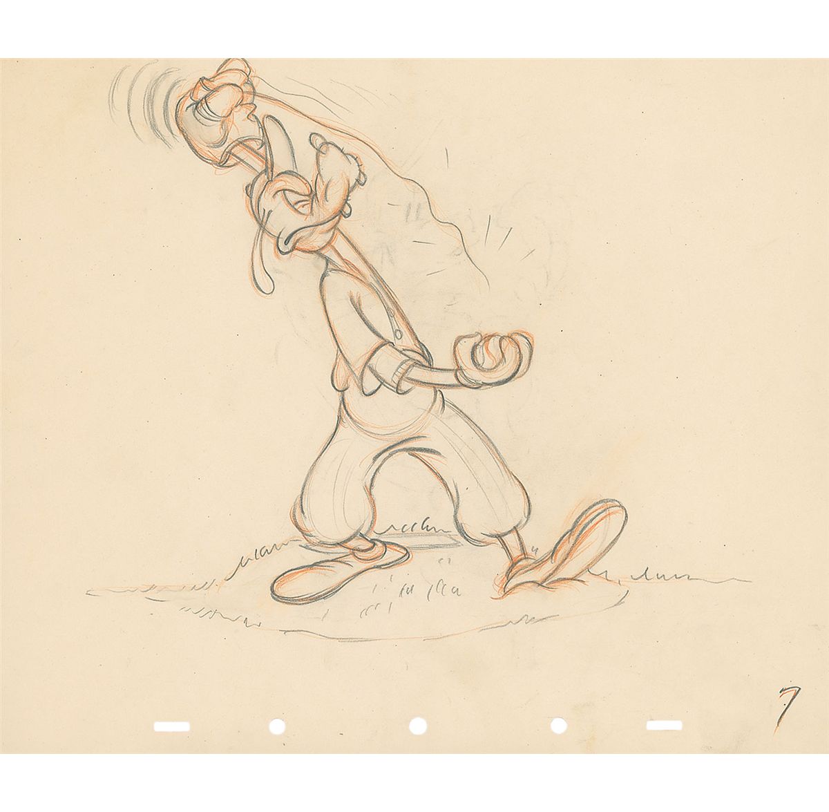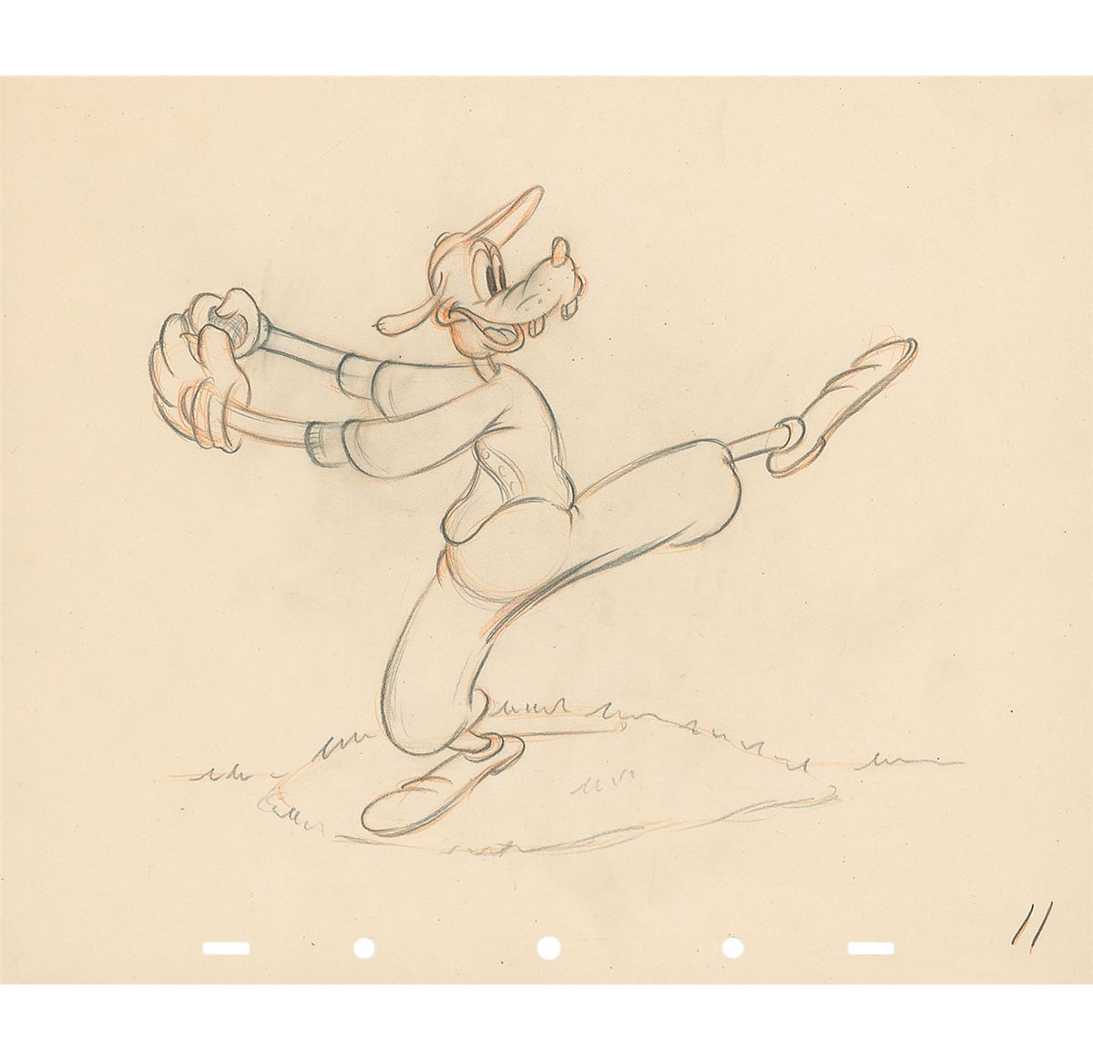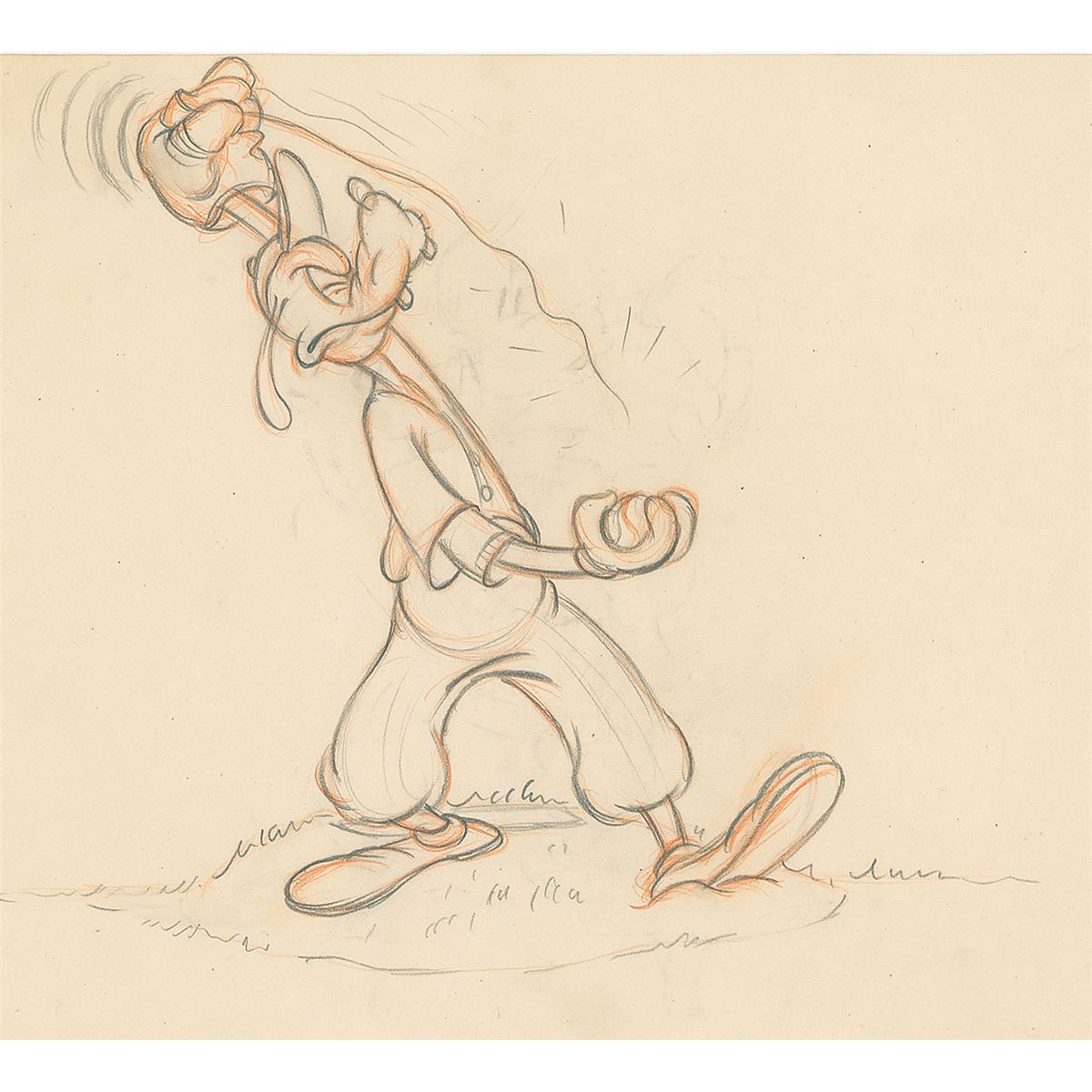(Walt Disney Studios, 1942) Pair of original concept storyboard drawings featuring Goofy from How to Play Baseball, showing him on the pitcher’s mound mid-windup. Accomplished in graphite and colored pencil on two sheets of untrimmed 12 x 10 animation paper. Images sizes are 9 x 7 and 9 x 8.5. In overall fine condition. How to Play Baseball was the first of Disney’s ‘How-To’ shorts featuring Goofy, produced at the request of Samuel Goldwyn and first shown to accompany the 1942 feature film The Pride of the Yankees.