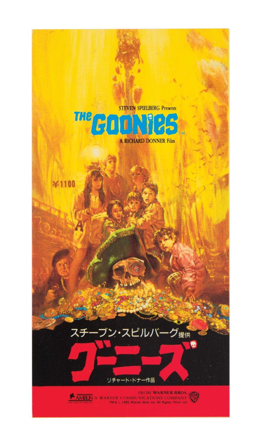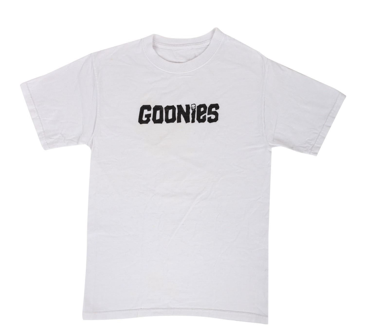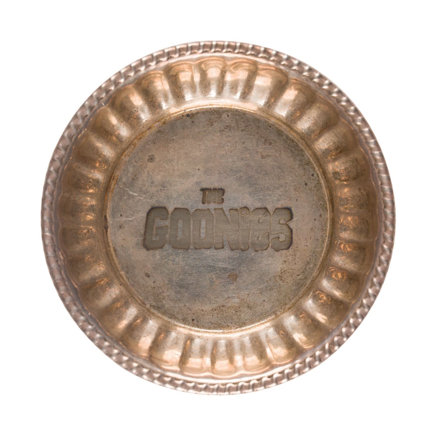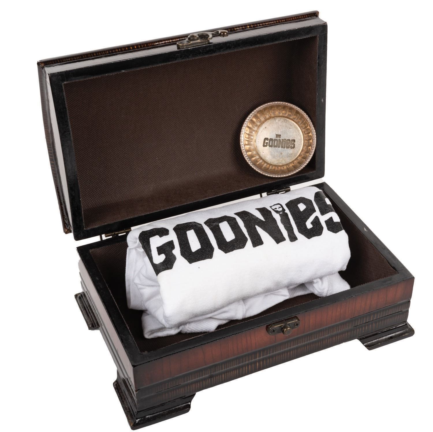 Warner Bros., 1985) A promotional press kit for the Japanese release of The Goonies on December 1, 1985. The kit features a treasure trove of mementos from the Japanese release including a Japanese-language press release, a Japanese-language collector's book program, a theater ticket, a T-shirt featuring the Goonies logo and a beautiful Sterling Silver "Treasure" Bowl. The latter come contained in a wooden pirate's chest. Measuring various sizes, the collectible items display in an overall fine condition.