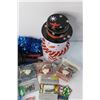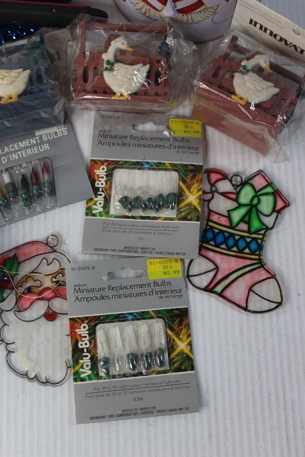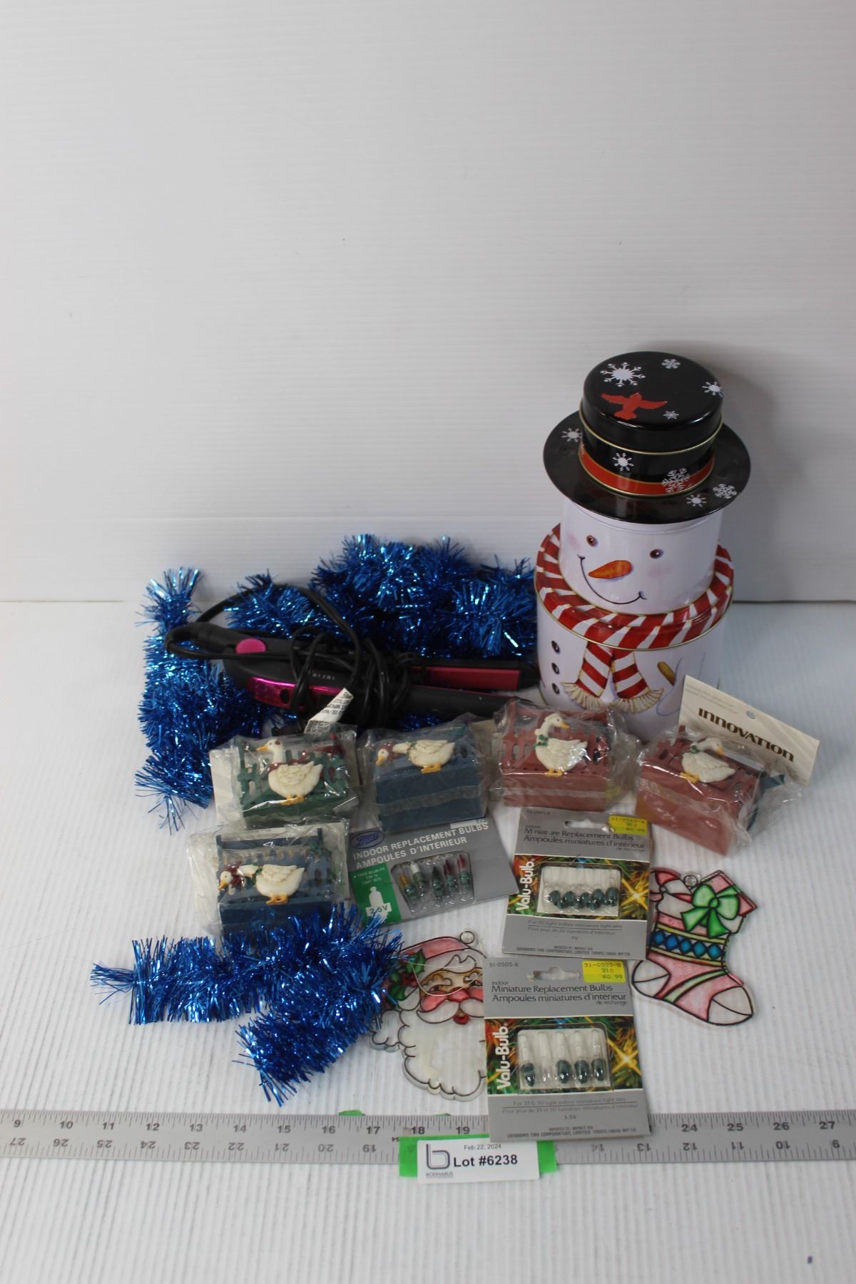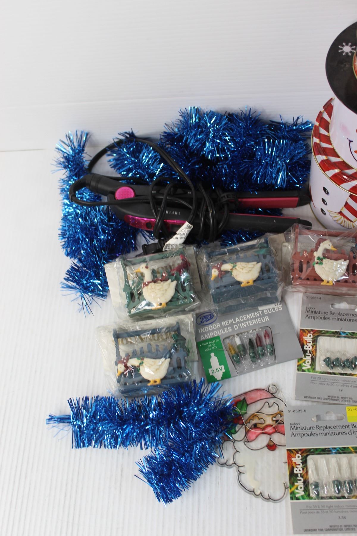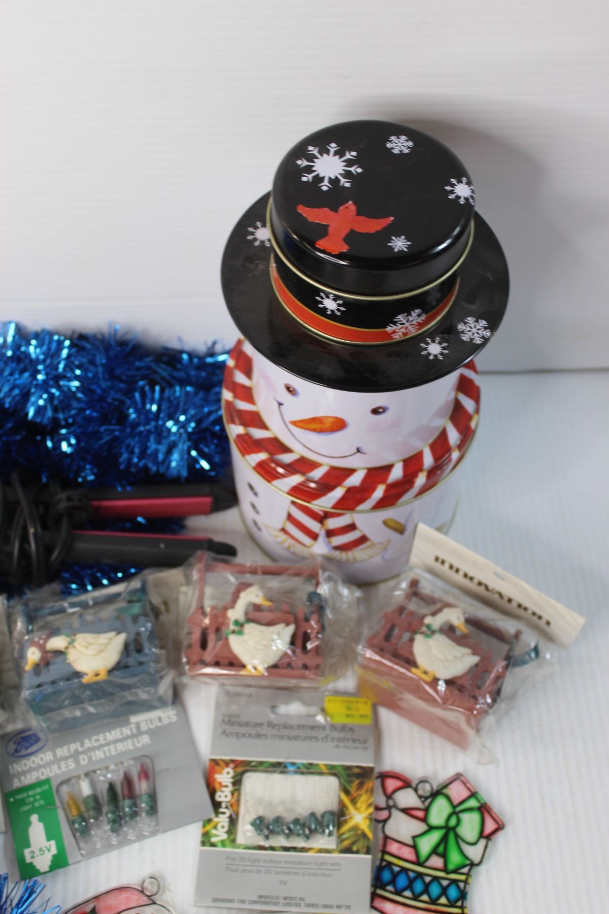 Goose Figurines, Snowman Tin, Replacement Christmas Bulbs, and Misc.