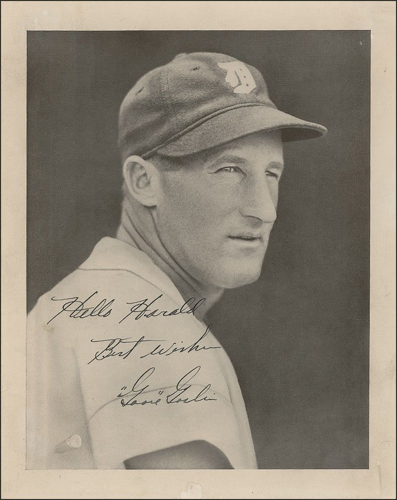 Vintage 8 x 10 paperstock photo of Goslin in his Detroit uniform, signed and inscribed in fountain pen “Hello Harold, Best wishes, ‘Goose’ Goslin.” In fine condition, with some scattered light soiling and spotting to borders.