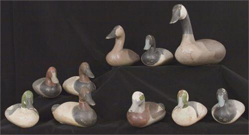 Collection of Goose and Duck Decoys. 1 Goose and 9 duck decoys. Some show cracking. c. 1930s. (est $1,200-1,500)