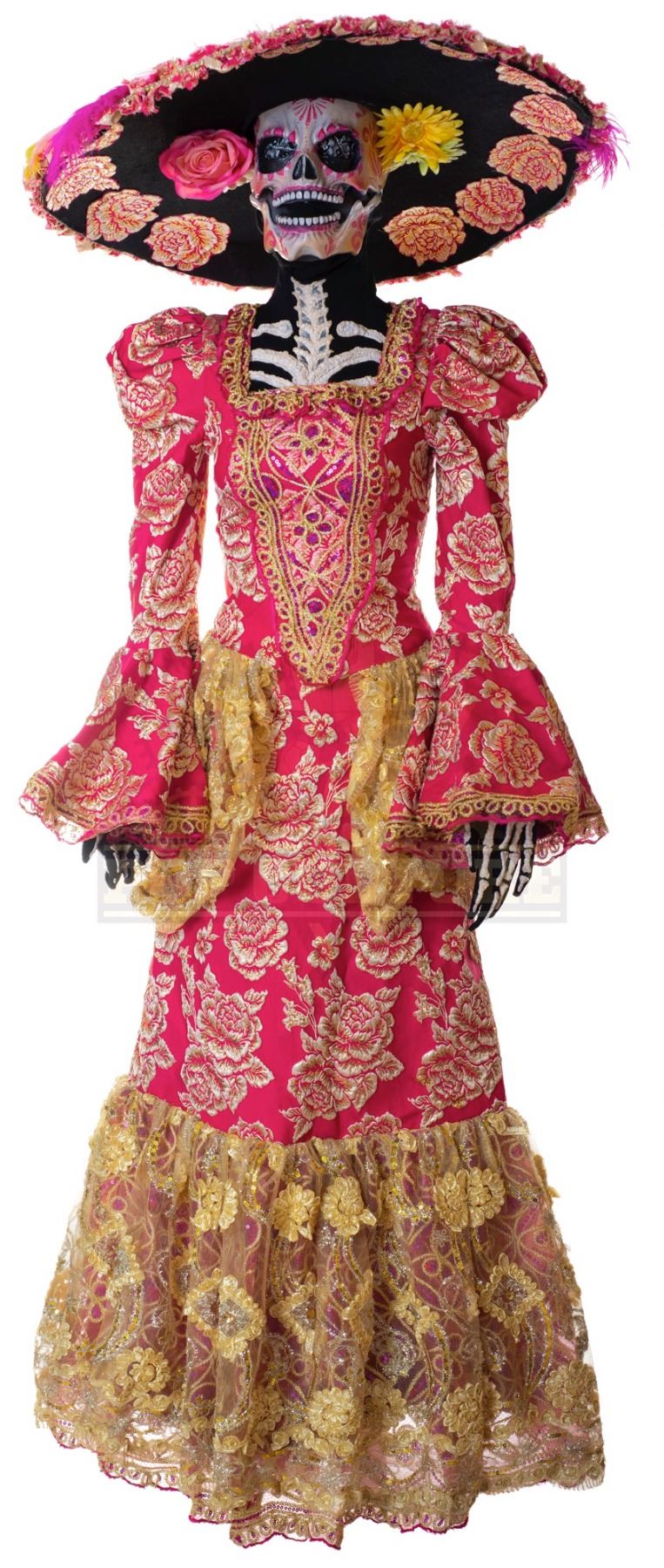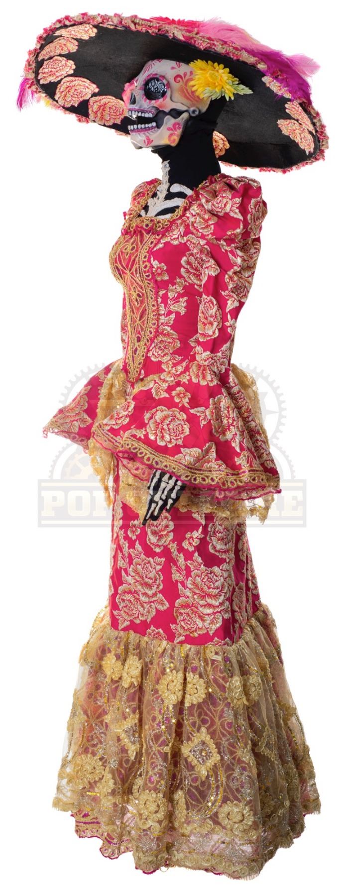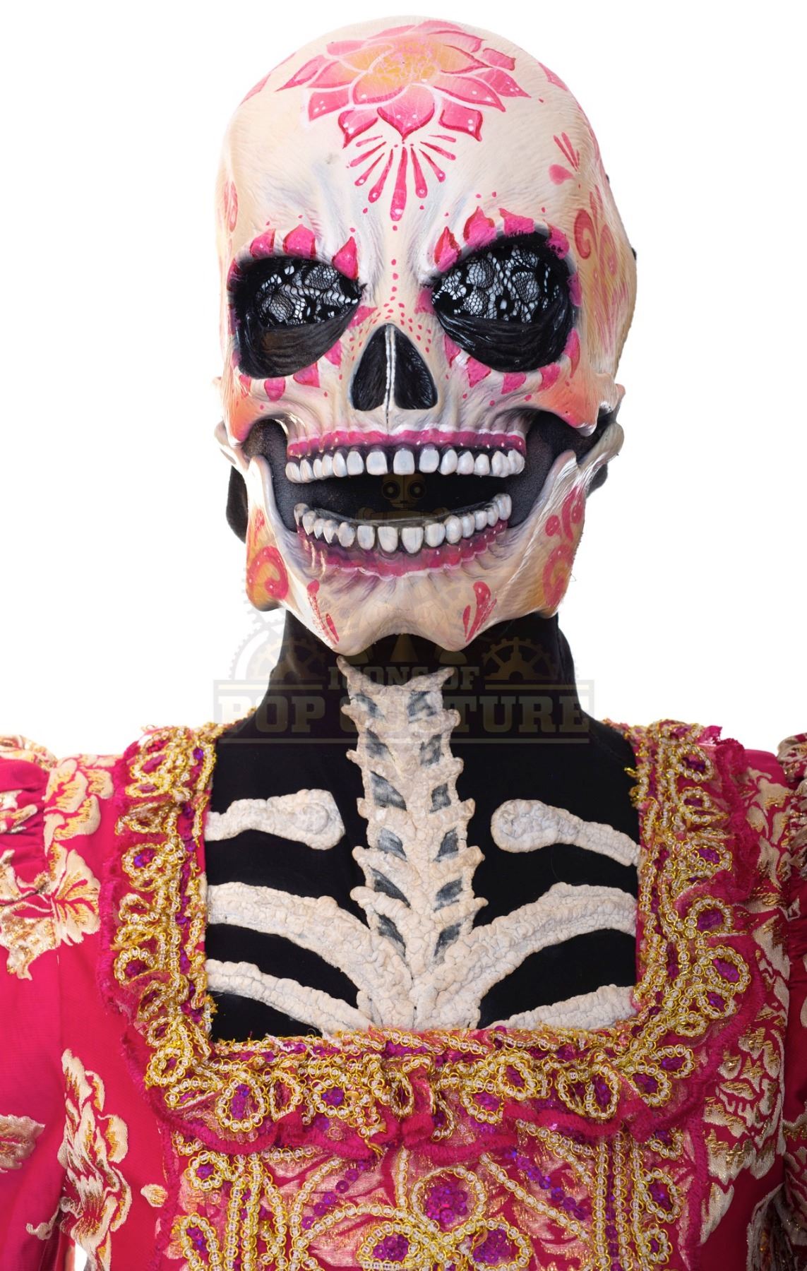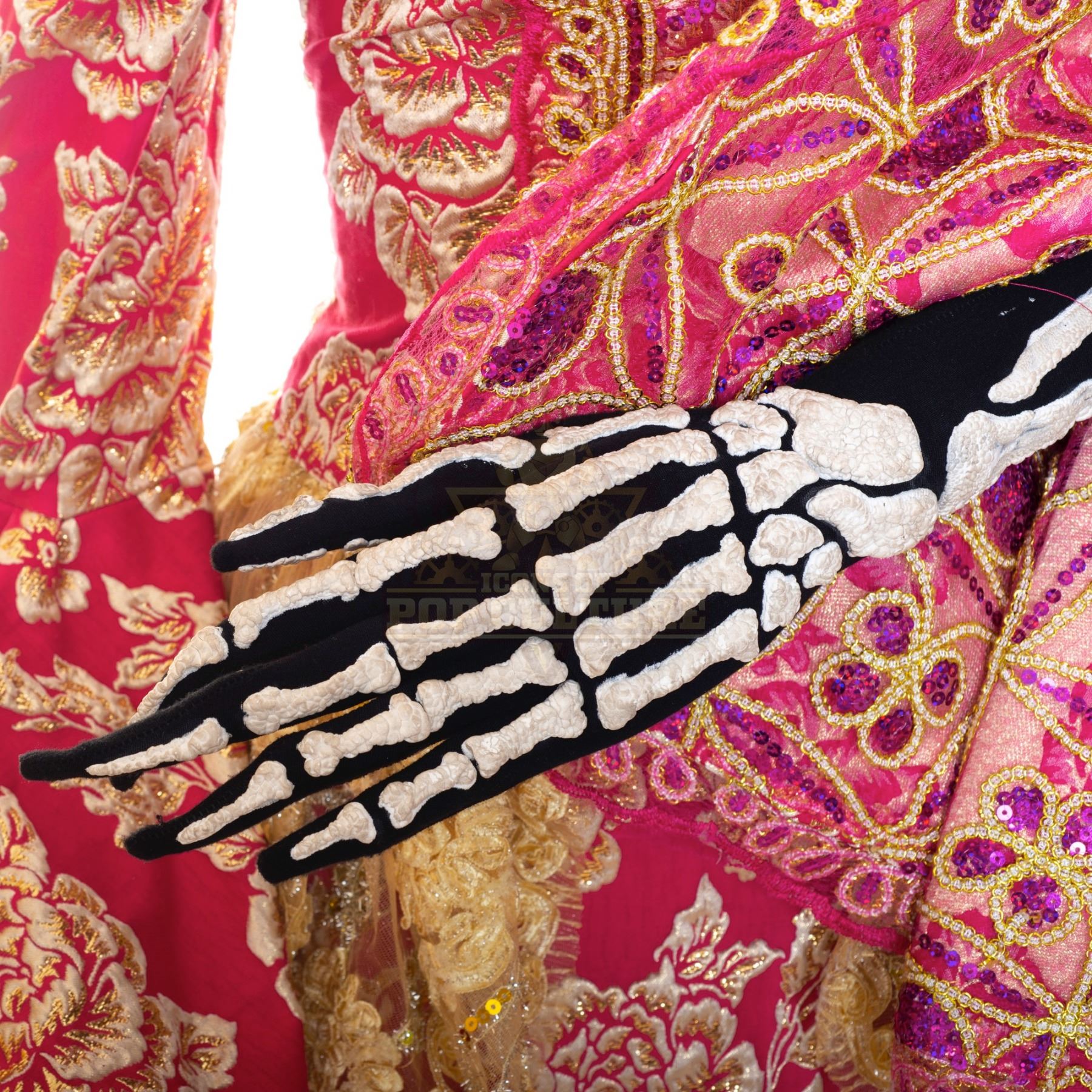 This outfit was acquired by the production for use by Cheniqua Litchmore as “Day of the Dead Lady” (pink). The outfit consists of an elaborate bolero top with matching skirt, black tunic with applied rubber skeleton rib cage, a pair of black gloves with applied rubber skeleton hands and forearms, black cloth mask with attached rubber skeleton face and elaborate sombrero.