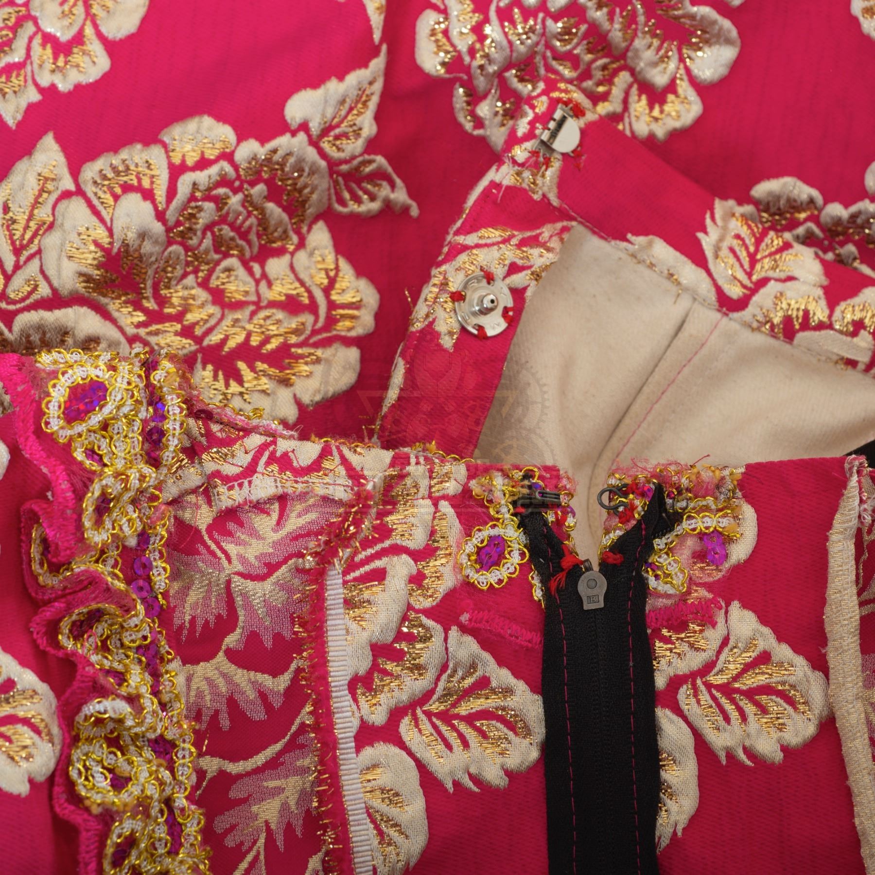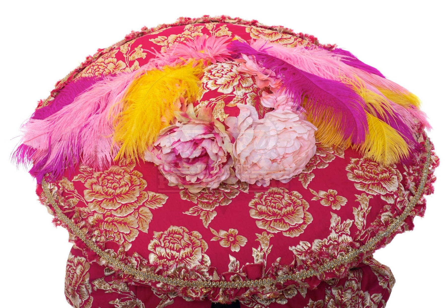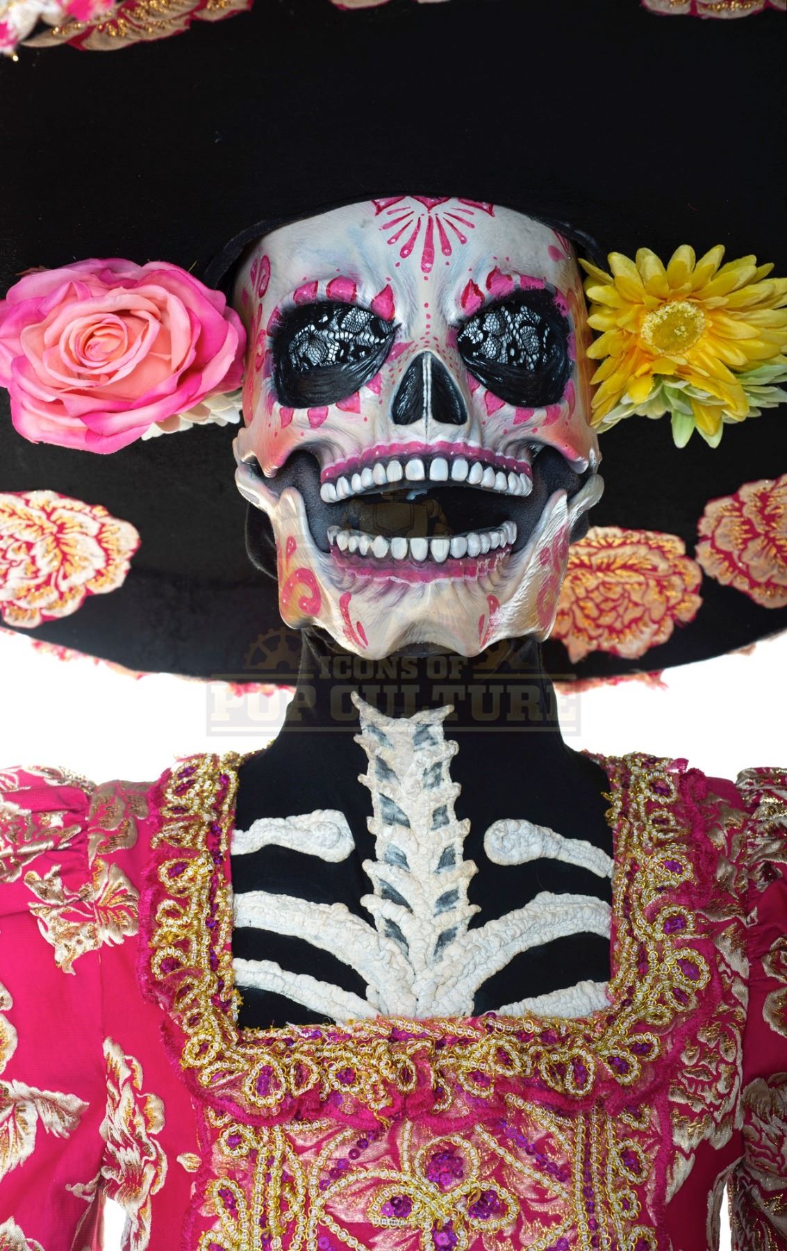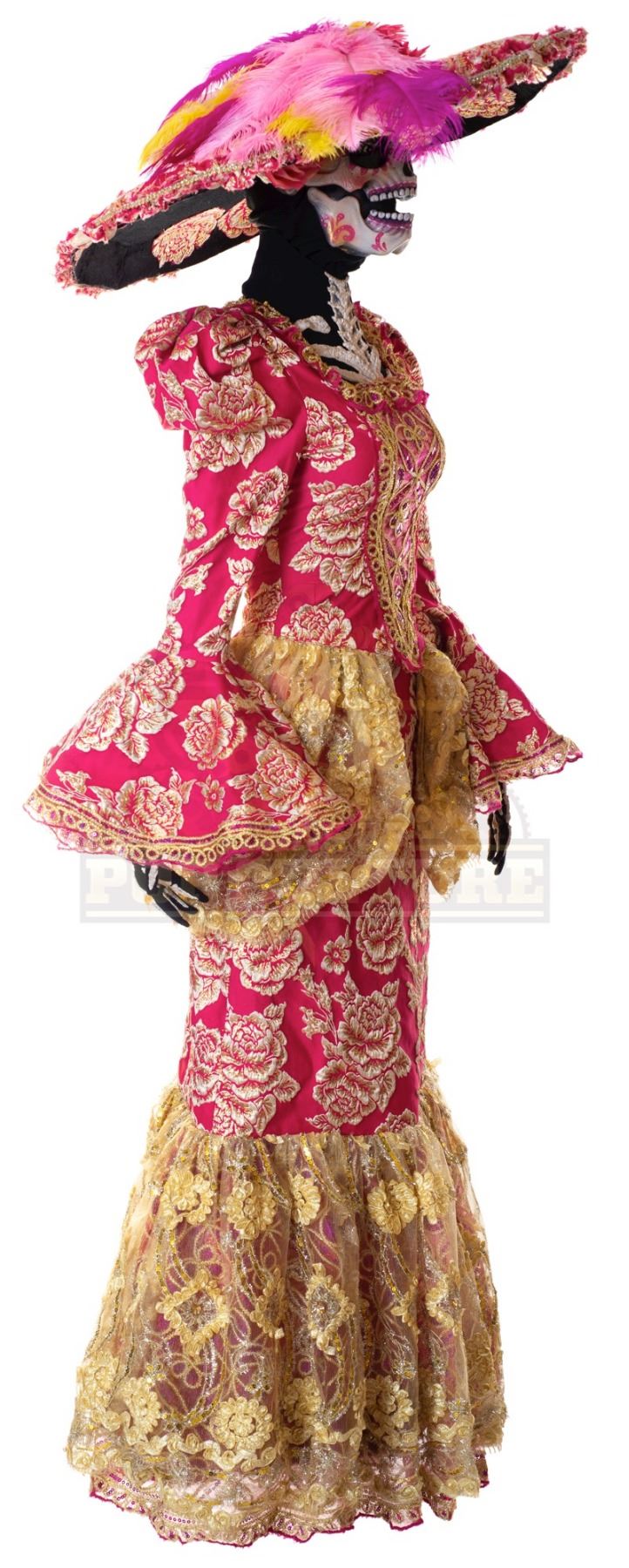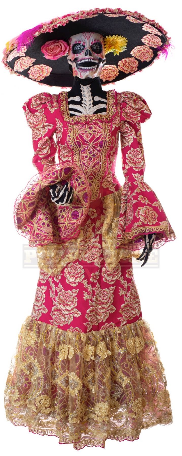 This outfit was acquired by the production for use by Cheniqua Litchmore as “Day of the Dead Lady” (pink). The outfit consists of an elaborate bolero top with matching skirt, black tunic with applied rubber skeleton rib cage, a pair of black gloves with applied rubber skeleton hands and forearms, black cloth mask with attached rubber skeleton face and elaborate sombrero.