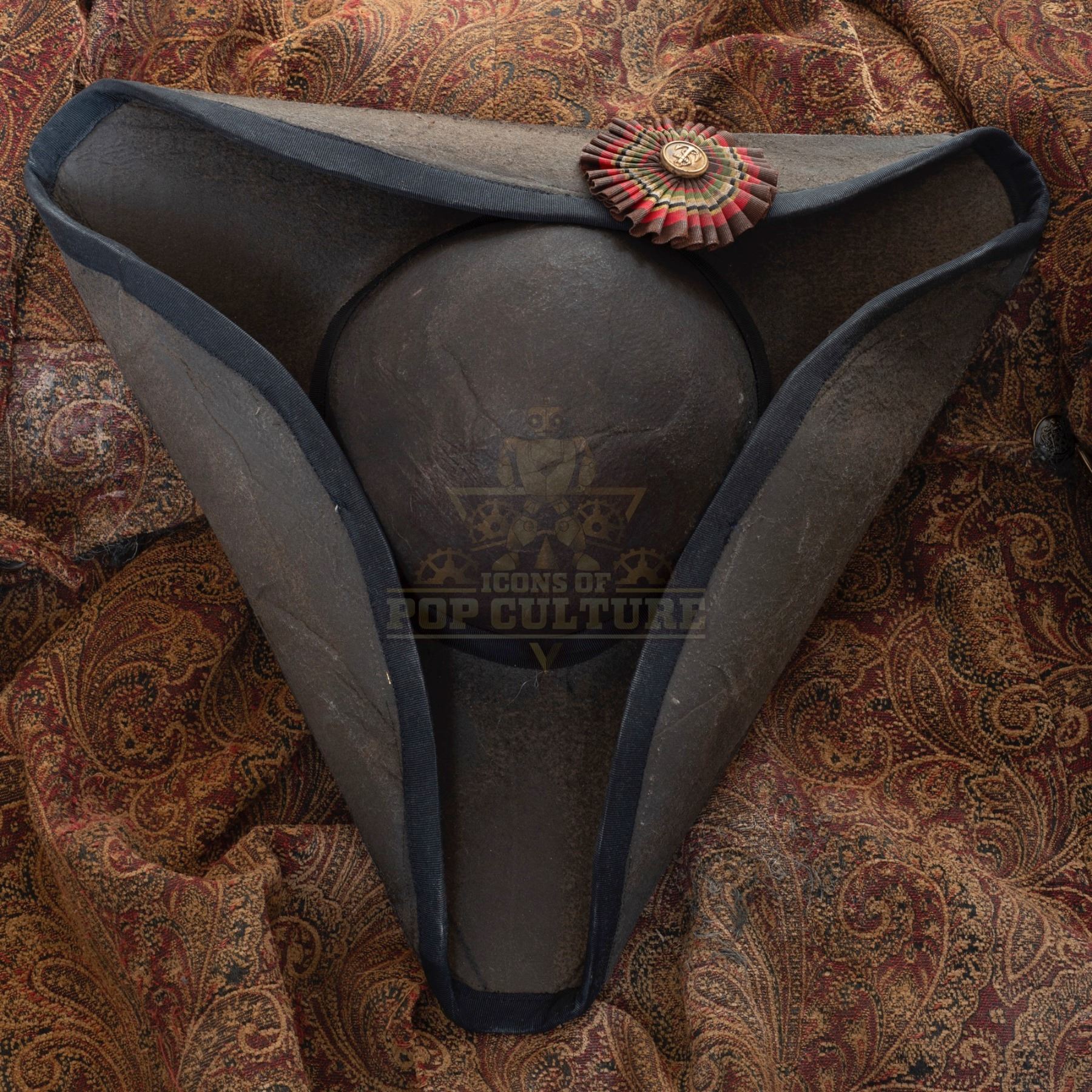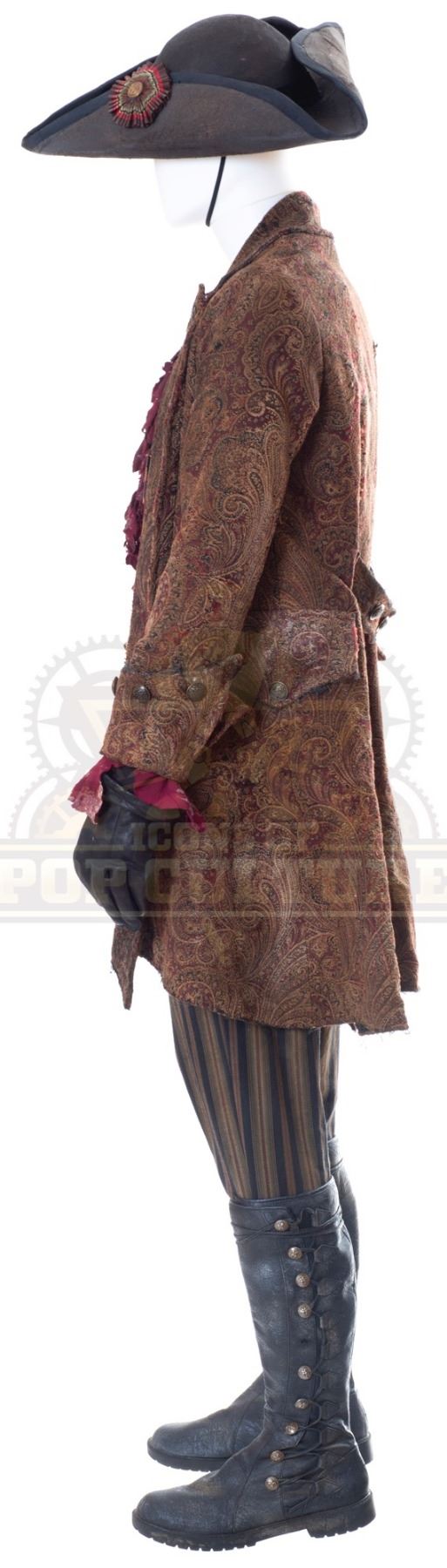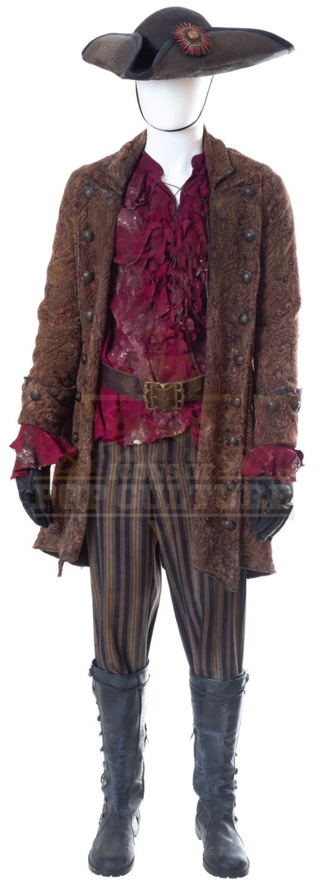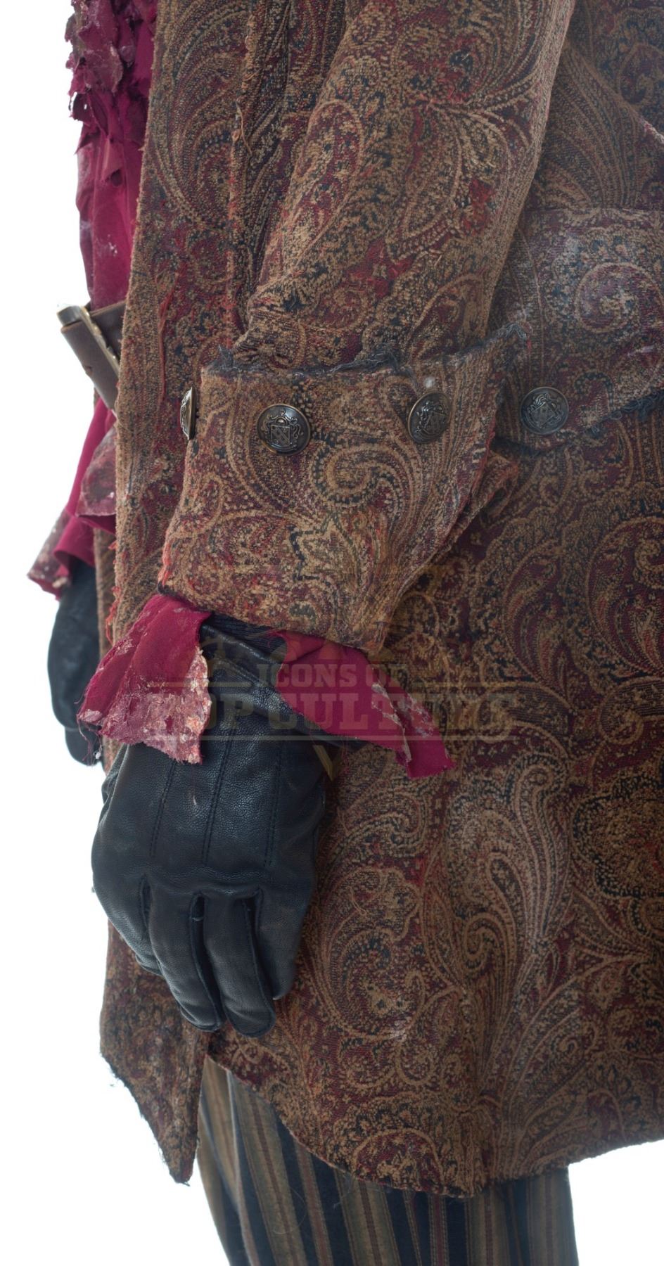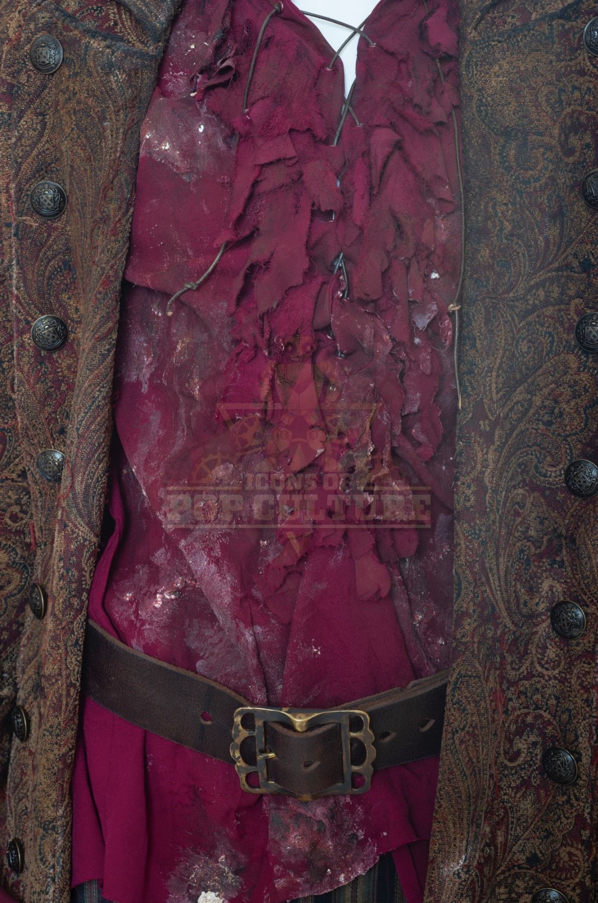 This Dead Pirate costume was acquired by the production for use by Kent Wagner as “Dead Pirate”. The costume is distressed for filming and consists of a Paisley coat, burgundy long sleeve shirt, multi-color striped pants, leather belt, black gloves, swashbuckler hat and a pair of boots.