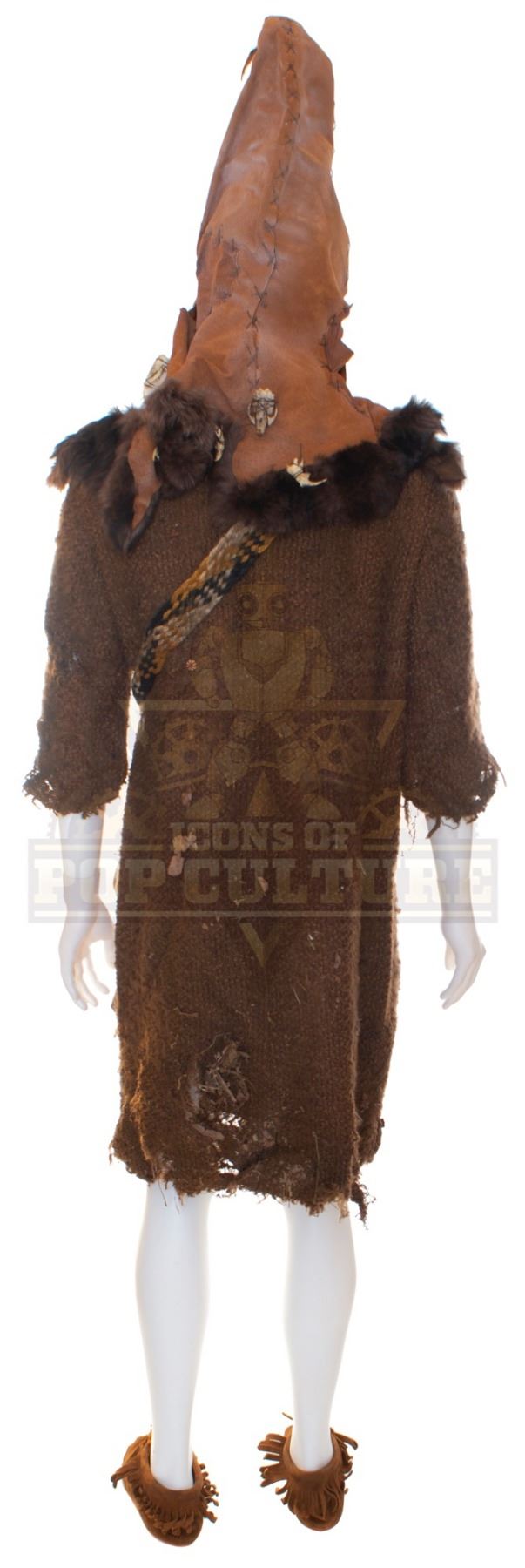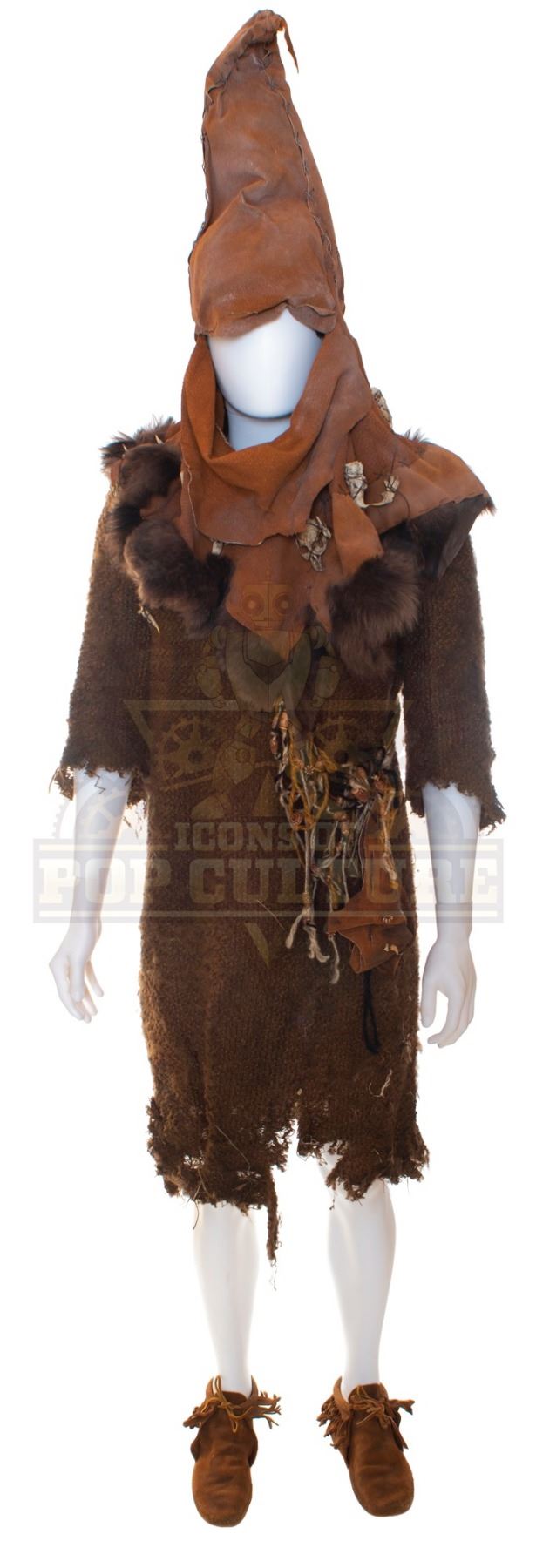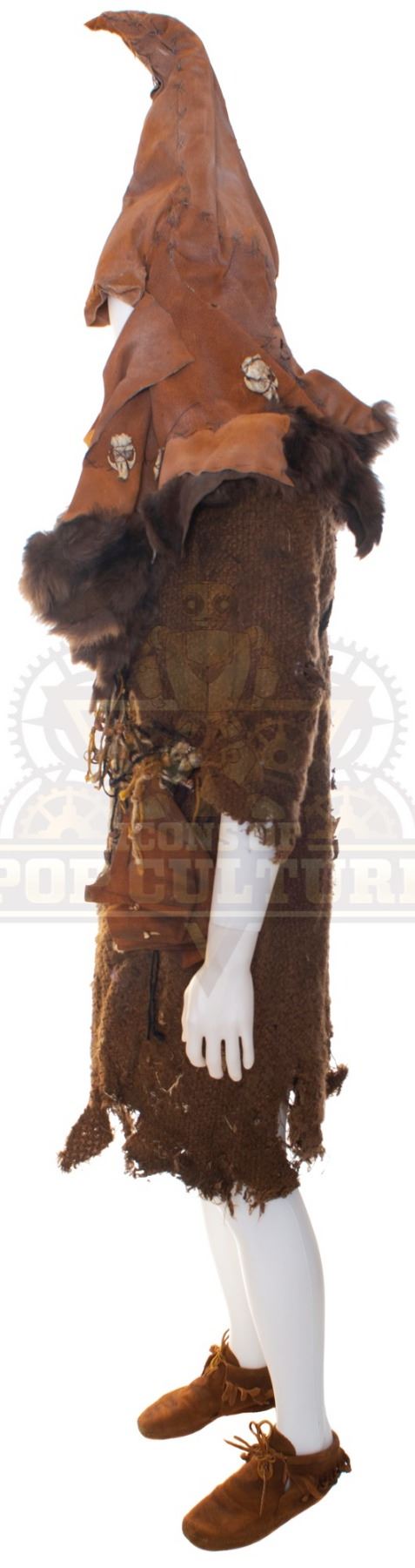 This Goblin costume was acquired by the production for use by an uncredited actor as “Goblin”. The costume consists of a brown tunic, brown faux leather hat with plastic bones detailing, bandolier with pouch and a pair of brown shoes.