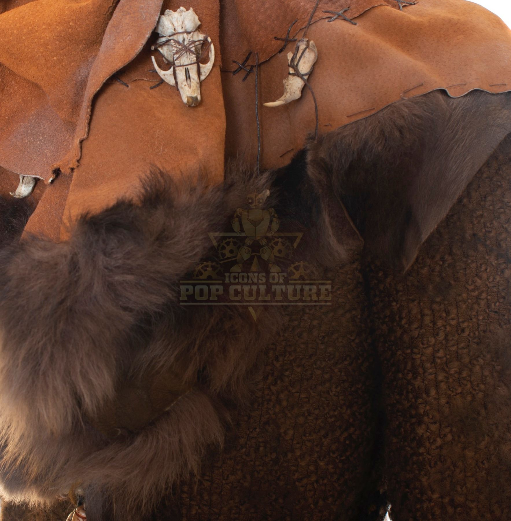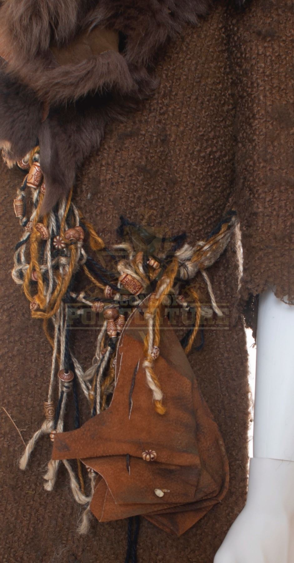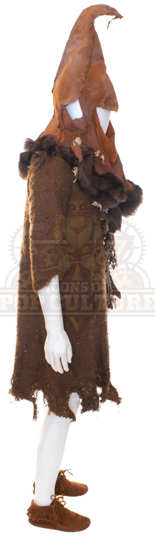 This Goblin costume was acquired by the production for use by an uncredited actor as “Goblin”. The costume consists of a brown tunic, brown faux leather hat with plastic bones detailing, bandolier with pouch and a pair of brown shoes.