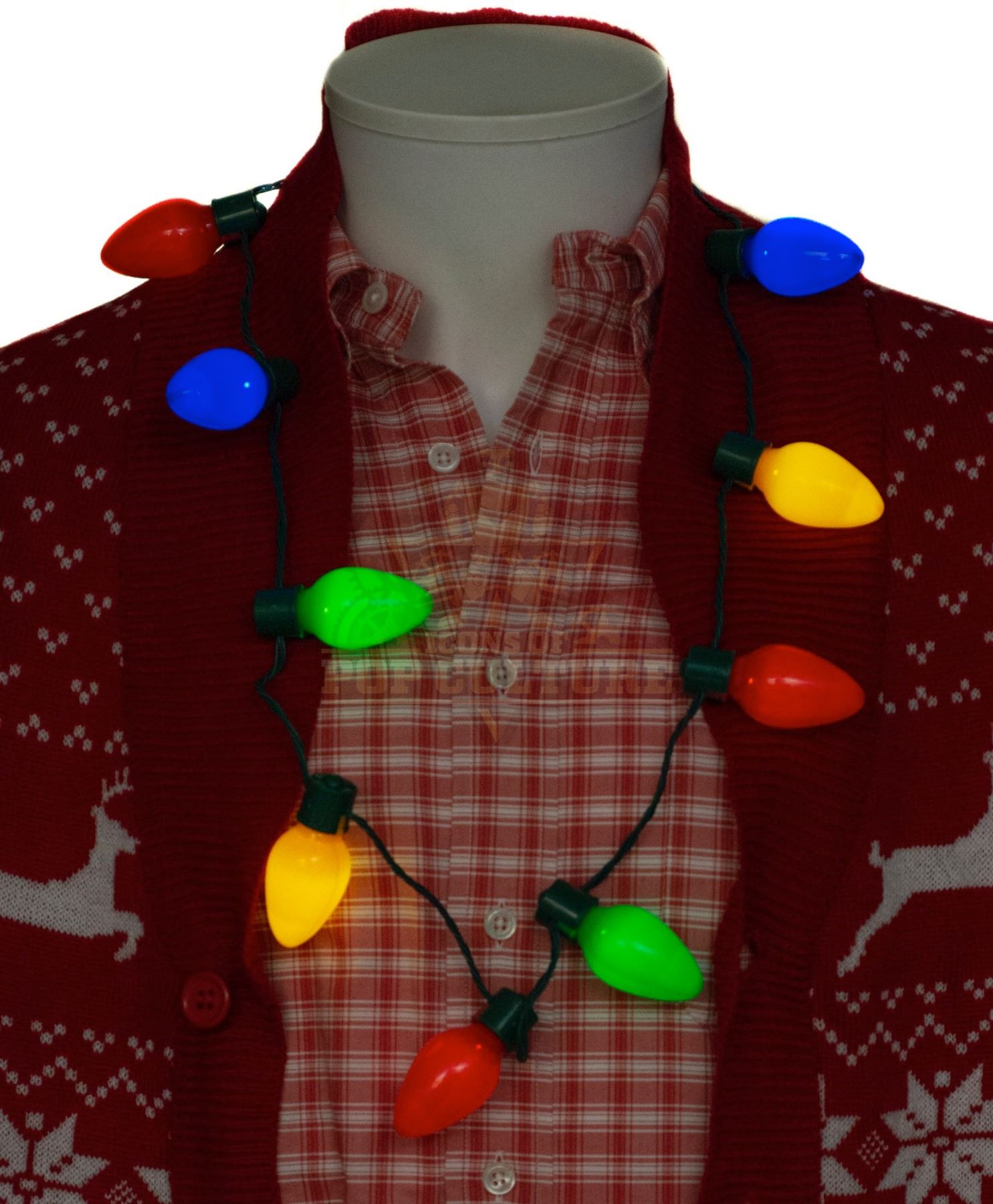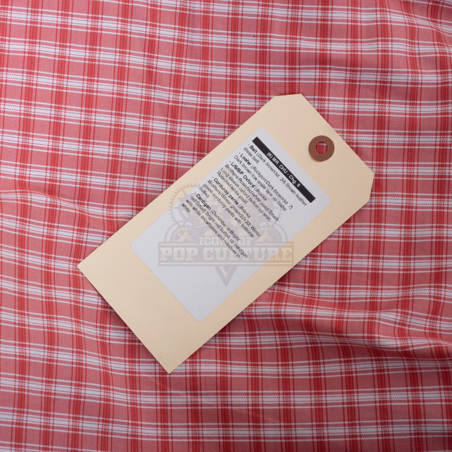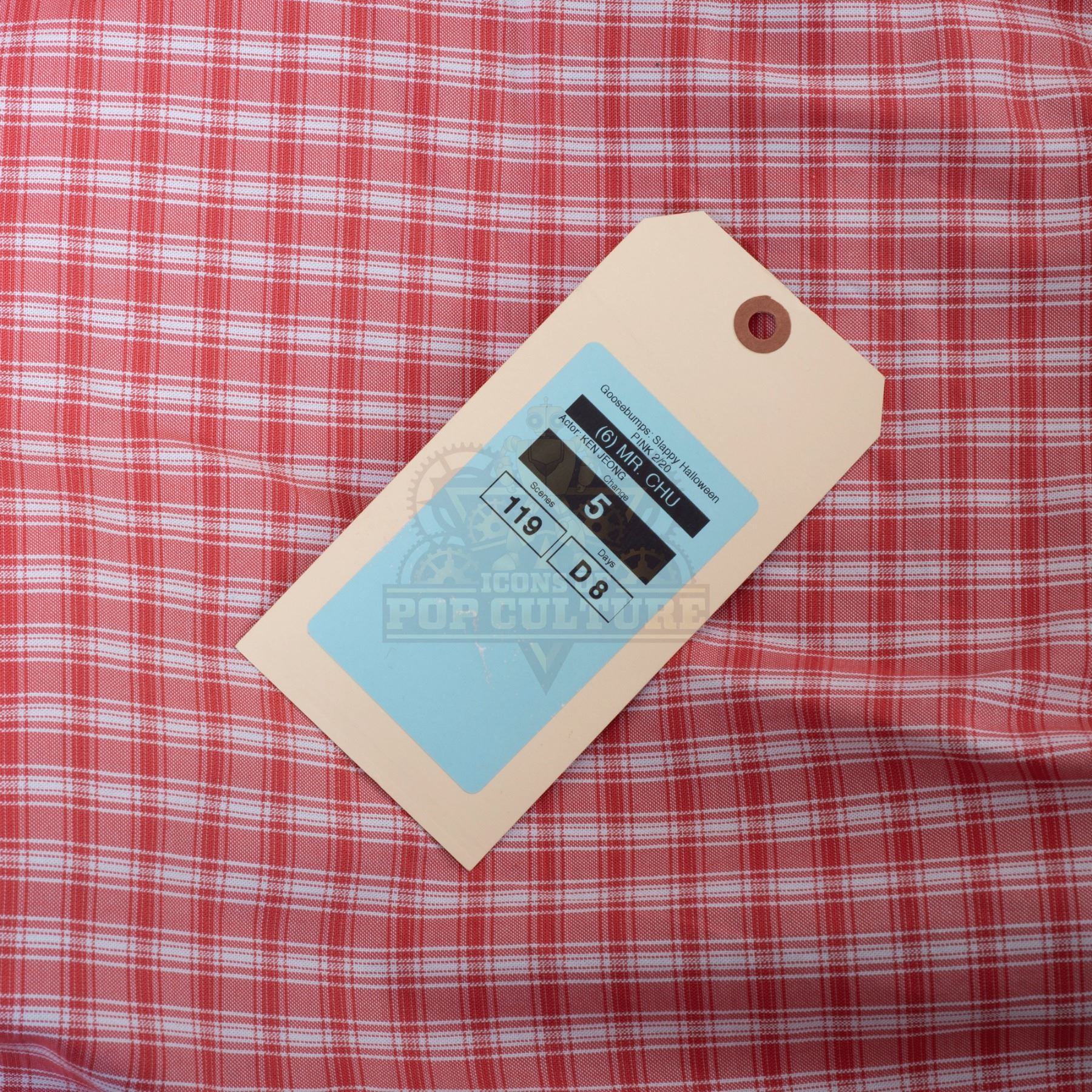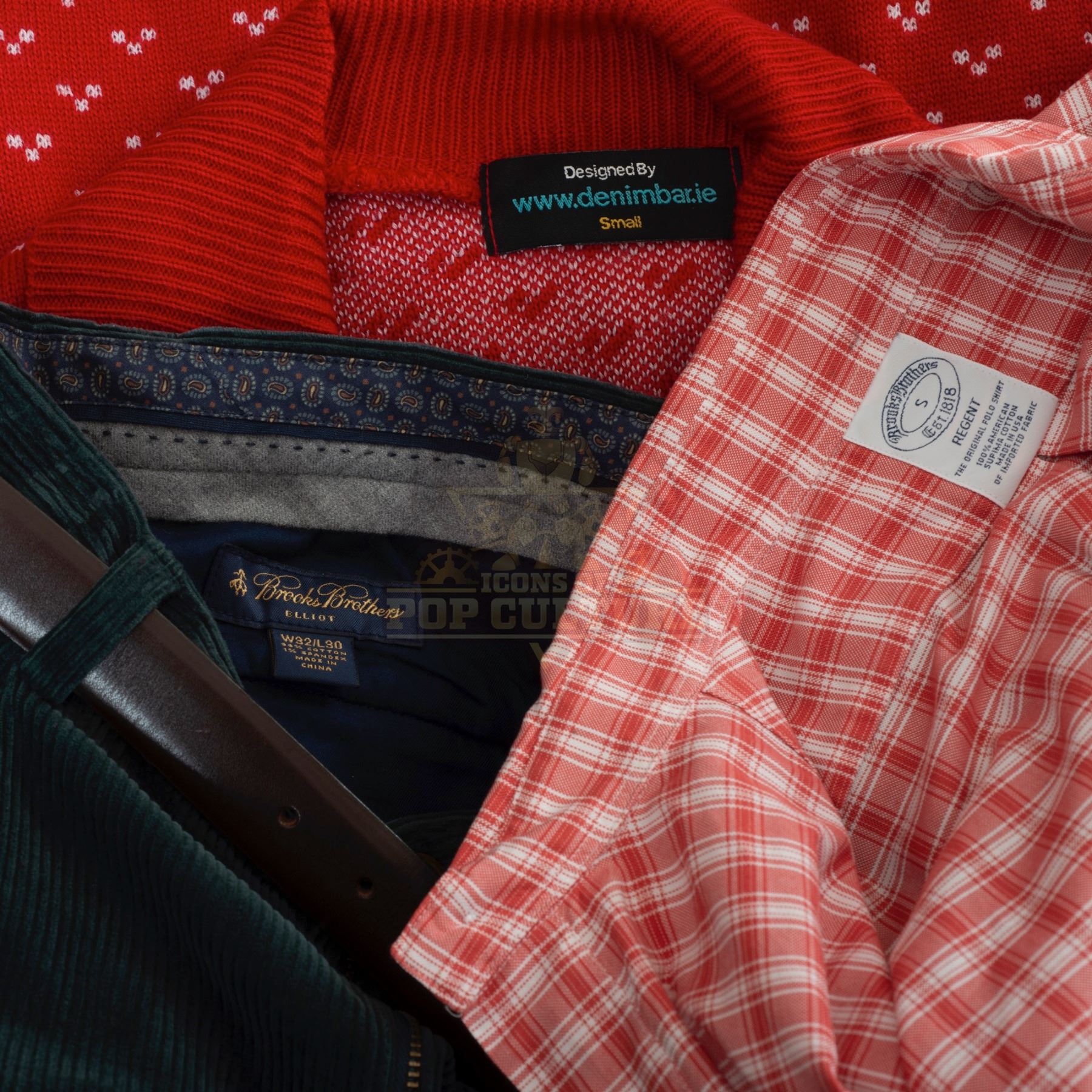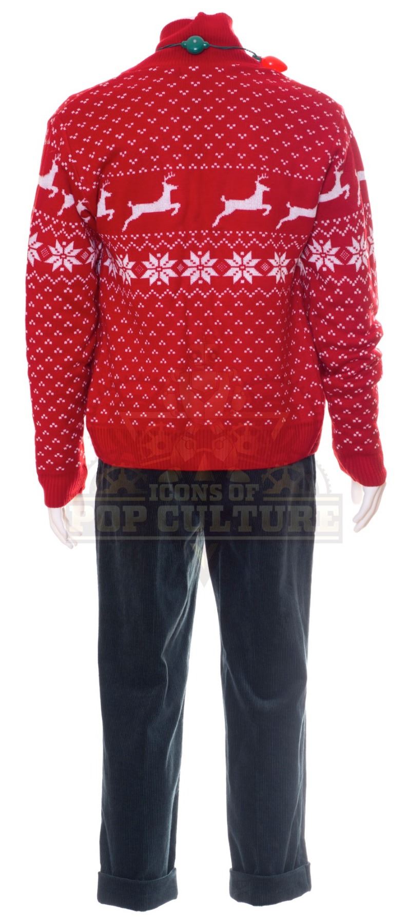 This outfit was acquired by the production for use by Ken Jeong as “Mr. Chu”. The outfit consists of a long sleeve button front shirt, a Christmas cardigan, a pair of green corduroy pants, brown leather belt and a Christmas lights necklace. Included with the outfit is a production used costume tag that details the entire outfit, change and scene numbers used.