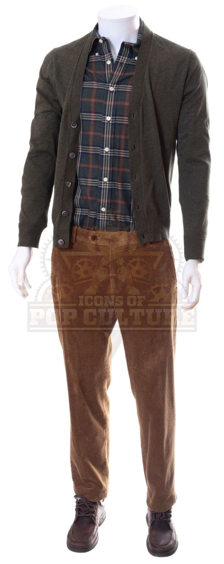 This outfit was acquired by the production for use by Ken Jeong as “Mr. Chu”. The outfit consists of a long sleeve button front shirt, a long sleeve cardigan, a pair of brown corduroy pants and a pair of dark brown shoes. Included with the outfit is a production used costume tag that details the entire outfit, change and scene numbers used.