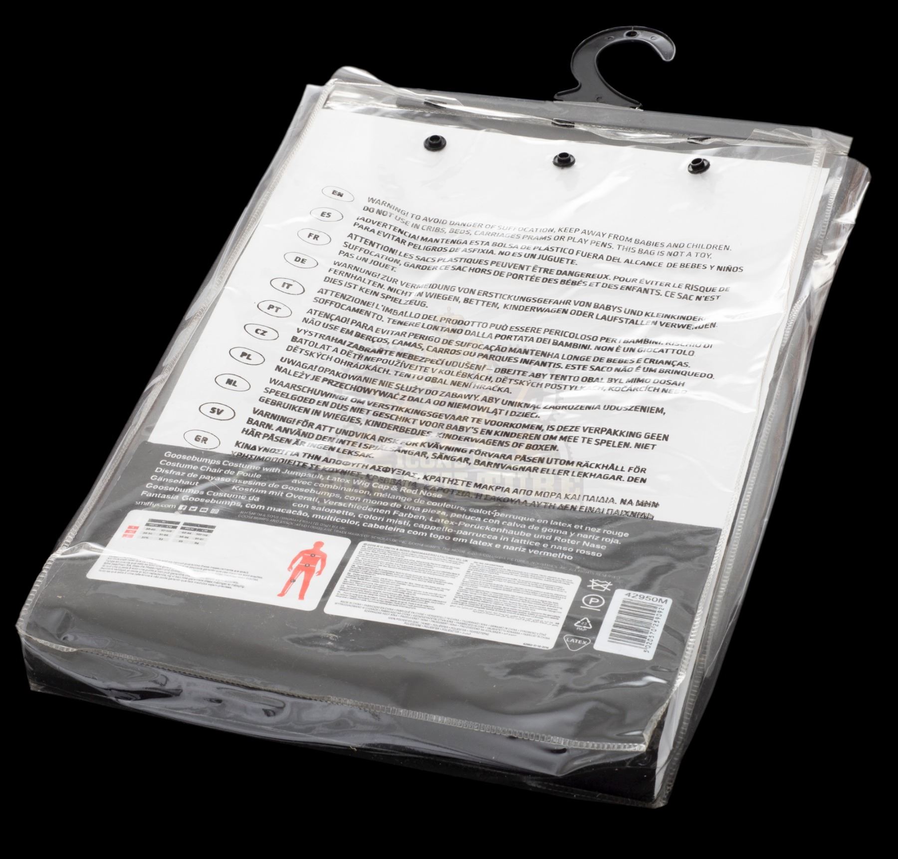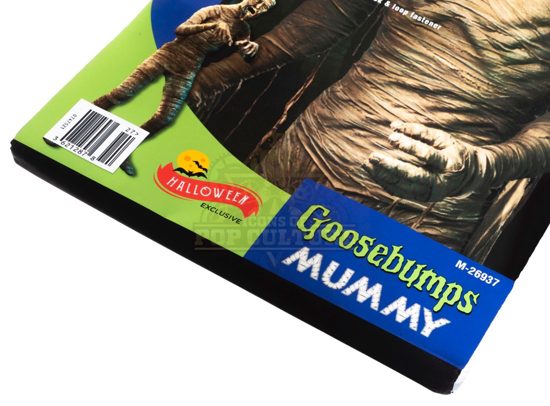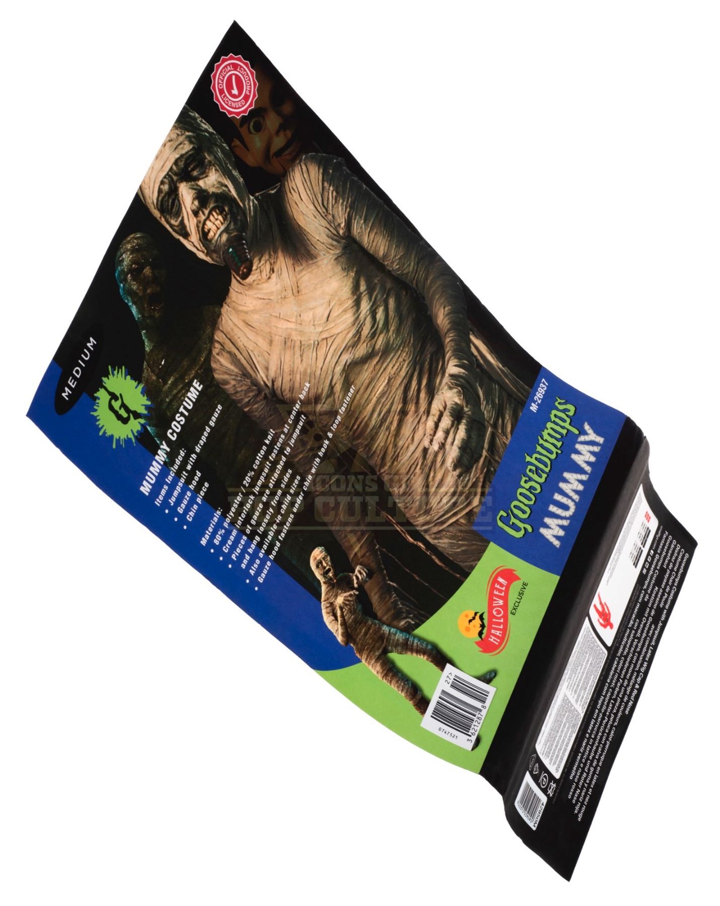 This mummy costume packaging was custom-printed for use as set dressing in “Fred’s Drug Store” The packaging features the image of a mummy costume with Slappy in the background. The packaging is contained in a clear plastic hanging sleeve for display in the store. Prop measures 10.5” x 16” inside the plastic sleeve.
