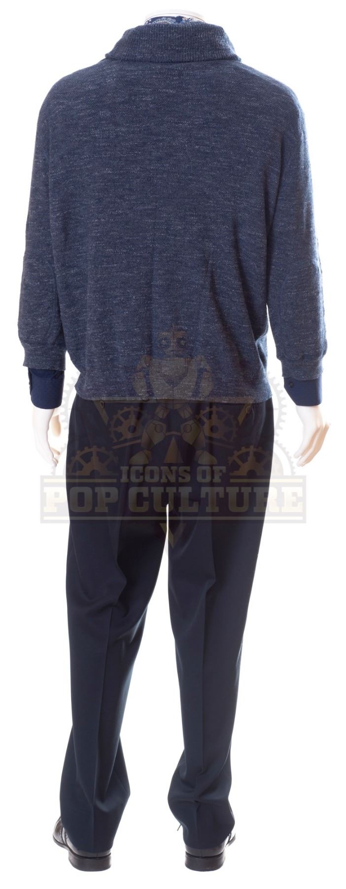 This outfit was acquired by the production for use by Jack Black’s stunt man as “R.L Stine”. The outfit consists of a long sleeve button front shirt, a long sleeve sweater, a white undershirt, a pair of black pants, paisley ascot and a pair of black shoes.