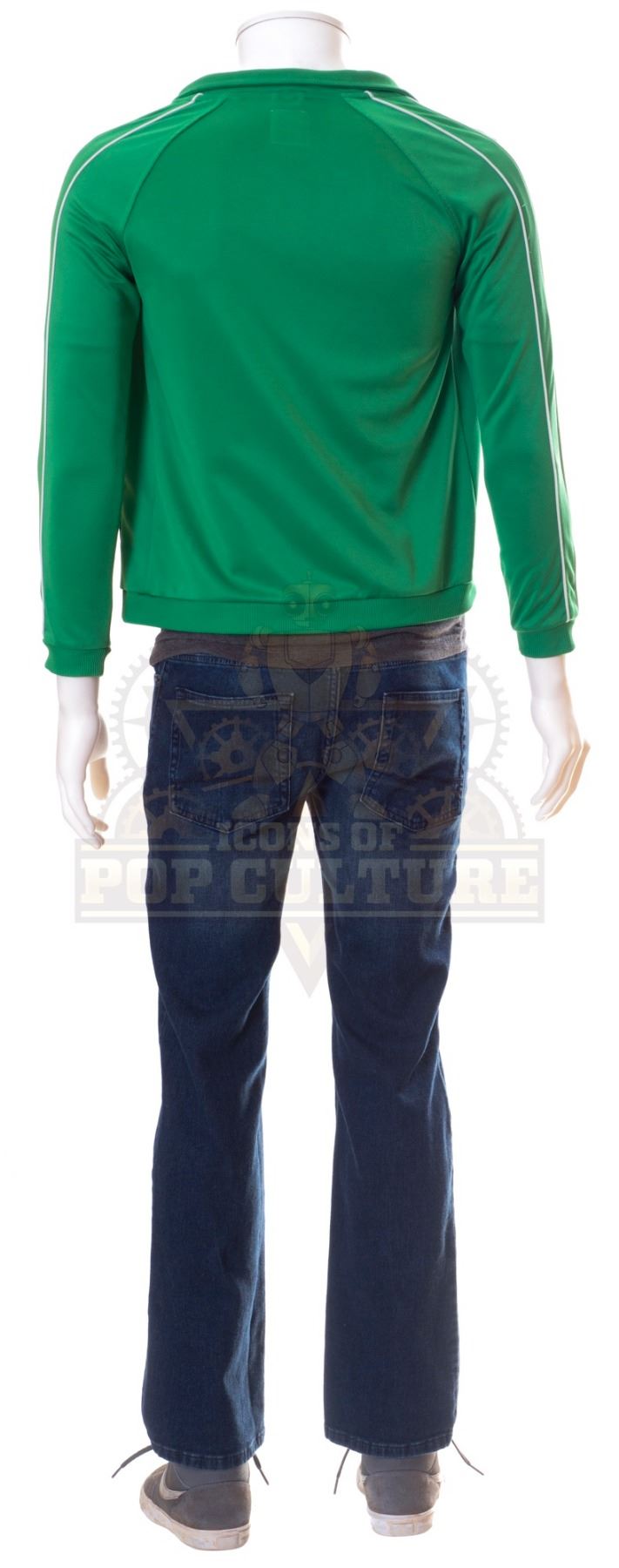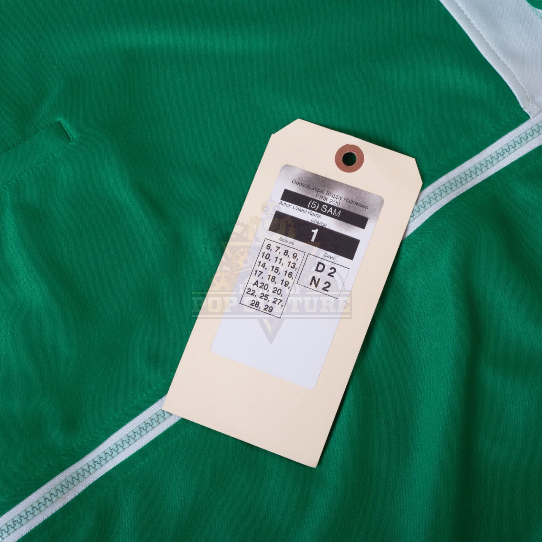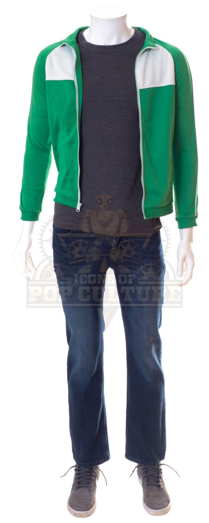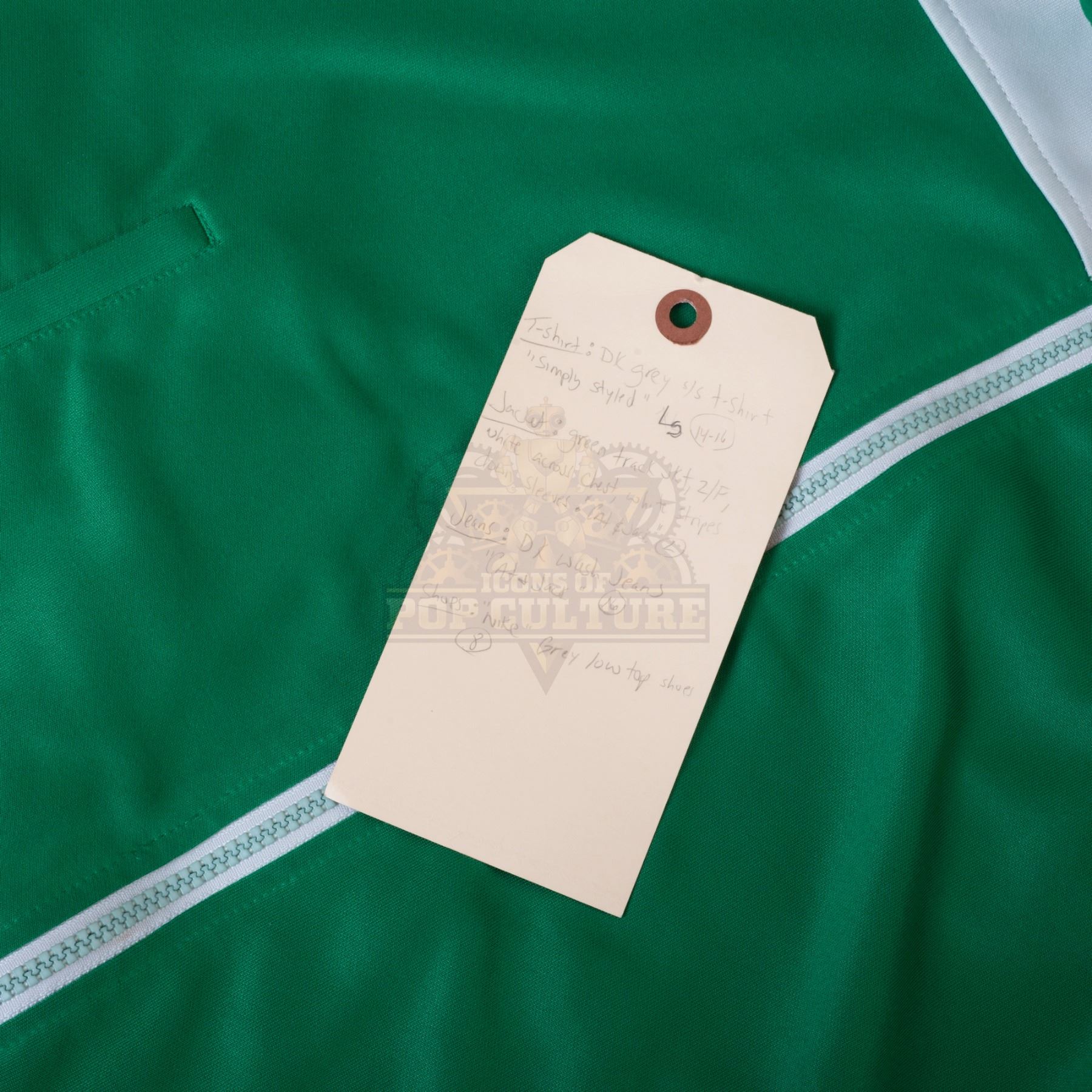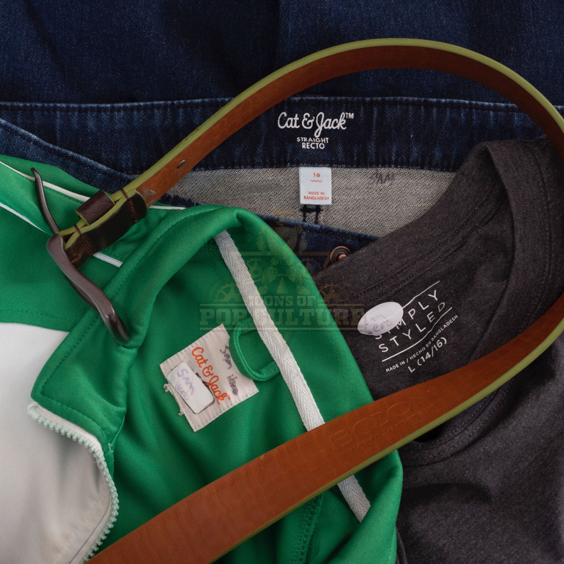 This outfit was acquired by the production for use by Caleel Harris as “Sam”. The outfit consists of a green track jacket, grey t-shirt, a pair of jeans, belt and a pair of Nike sneakers. Included with the outfit is a production used costume tag that details the entire outfit, change and scene numbers used.