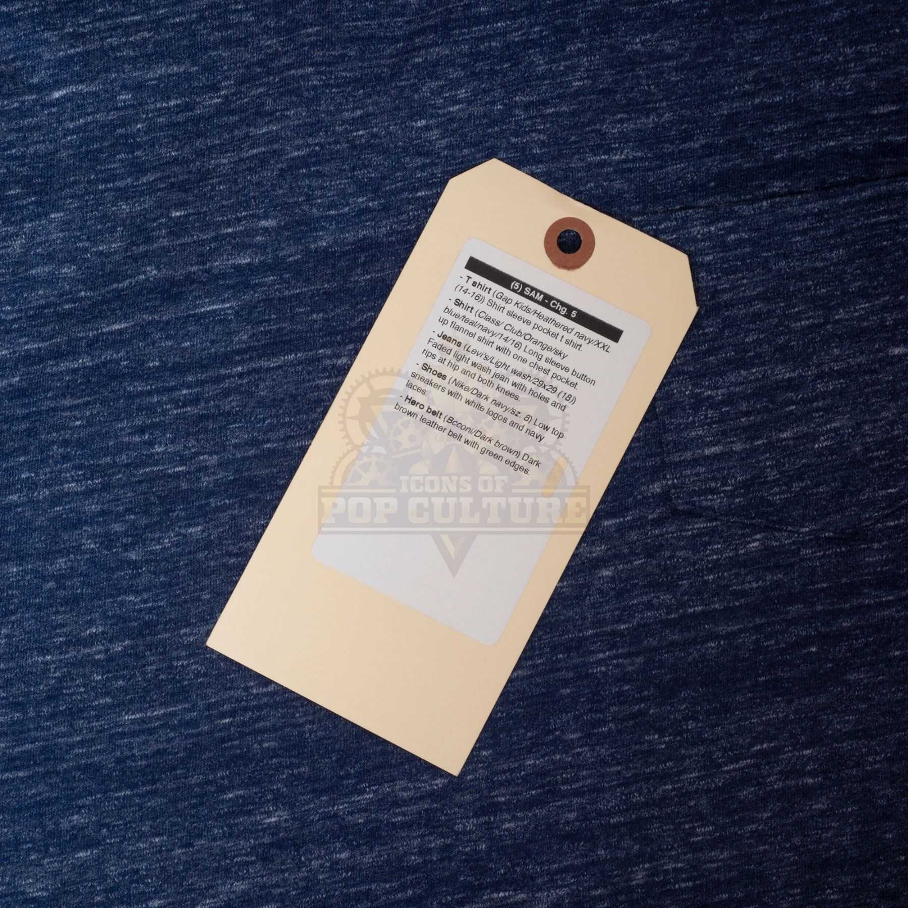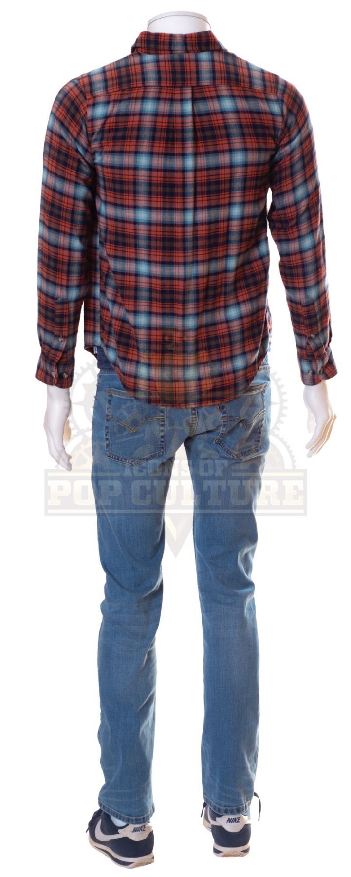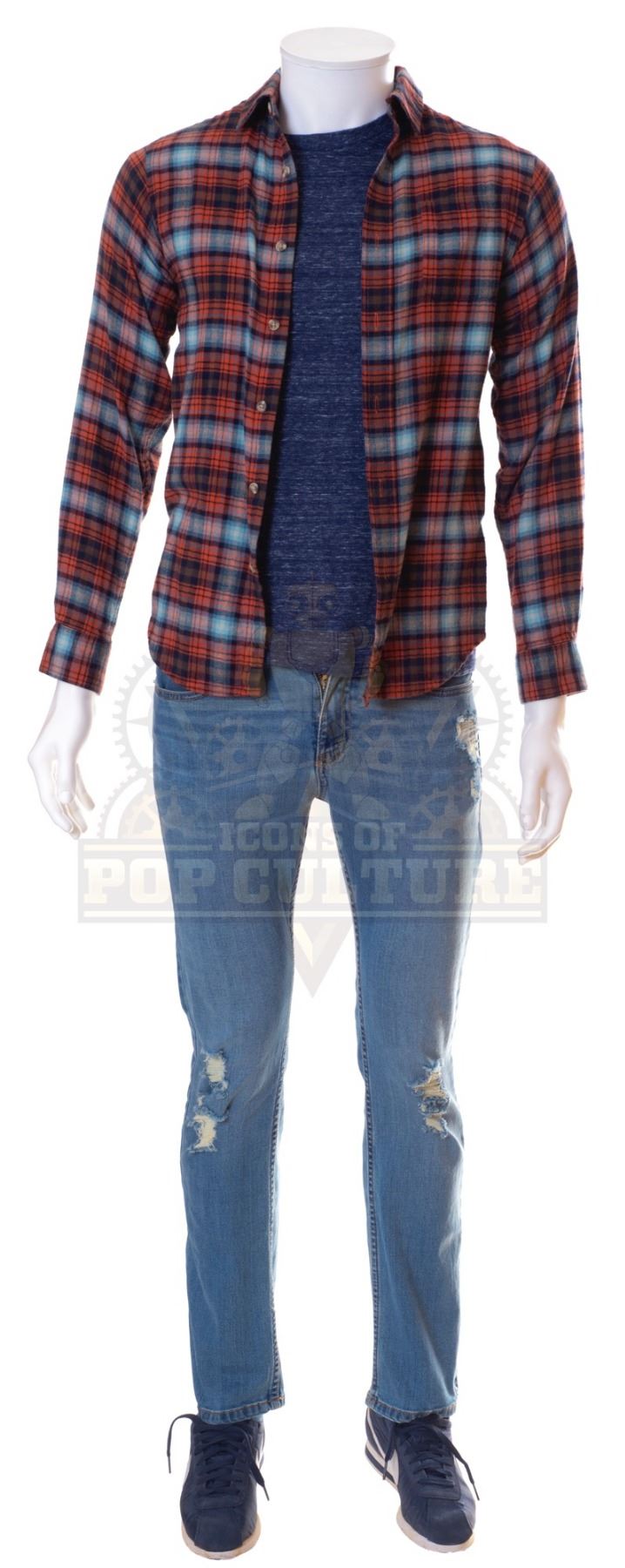 This outfit was acquired by the production for use by Caleel Harris as “Sam”. The outfit consists of a long sleeve button front flannel shirt, a blue short sleeve undershirt, a pair of distressed denim jeans and a pair of Nike sneakers. Included with the outfit is a production used costume tag that details the entire outfit, change and scene numbers used.