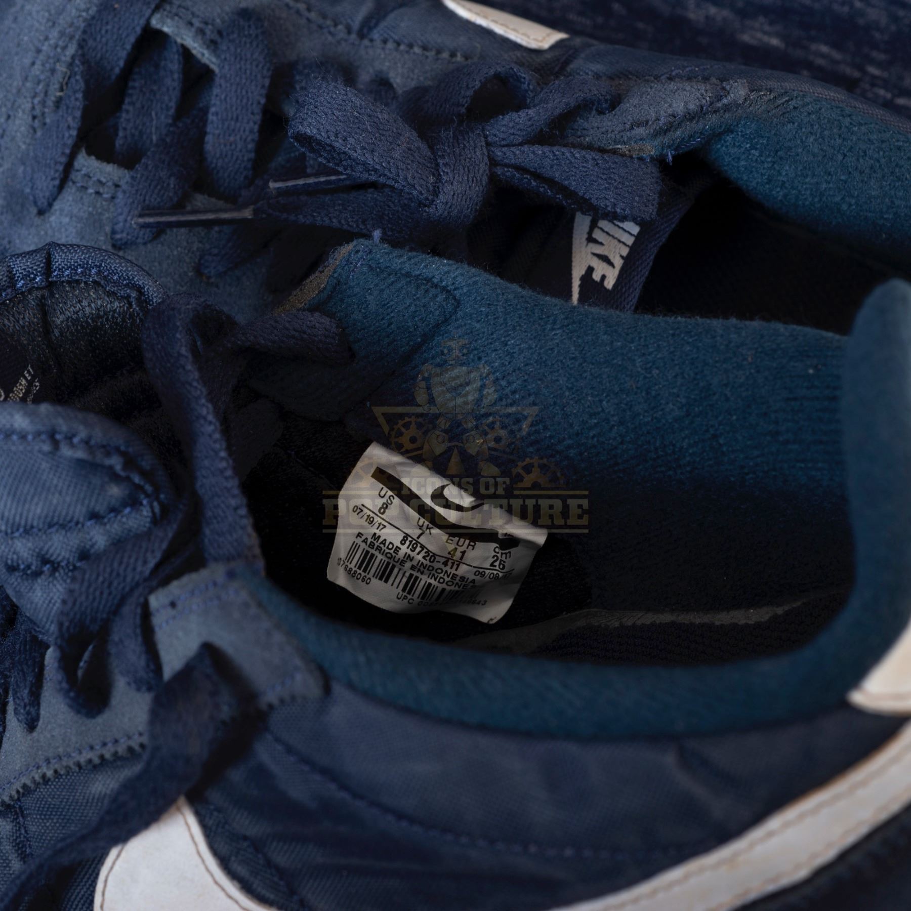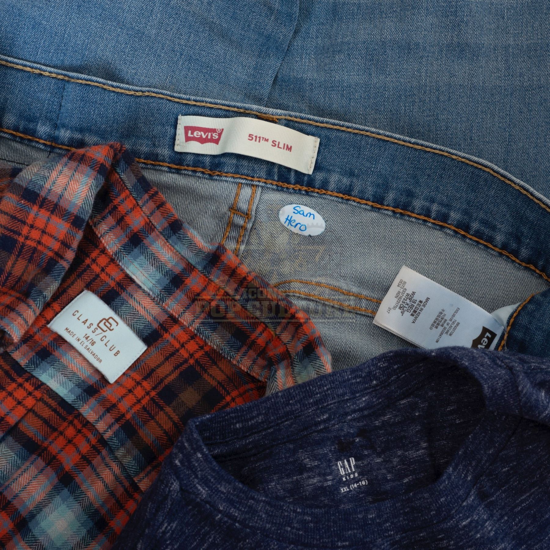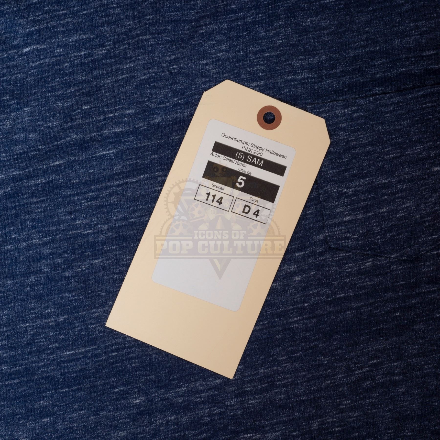 This outfit was acquired by the production for use by Caleel Harris as “Sam”. The outfit consists of a long sleeve button front flannel shirt, a blue short sleeve undershirt, a pair of distressed denim jeans and a pair of Nike sneakers. Included with the outfit is a production used costume tag that details the entire outfit, change and scene numbers used.