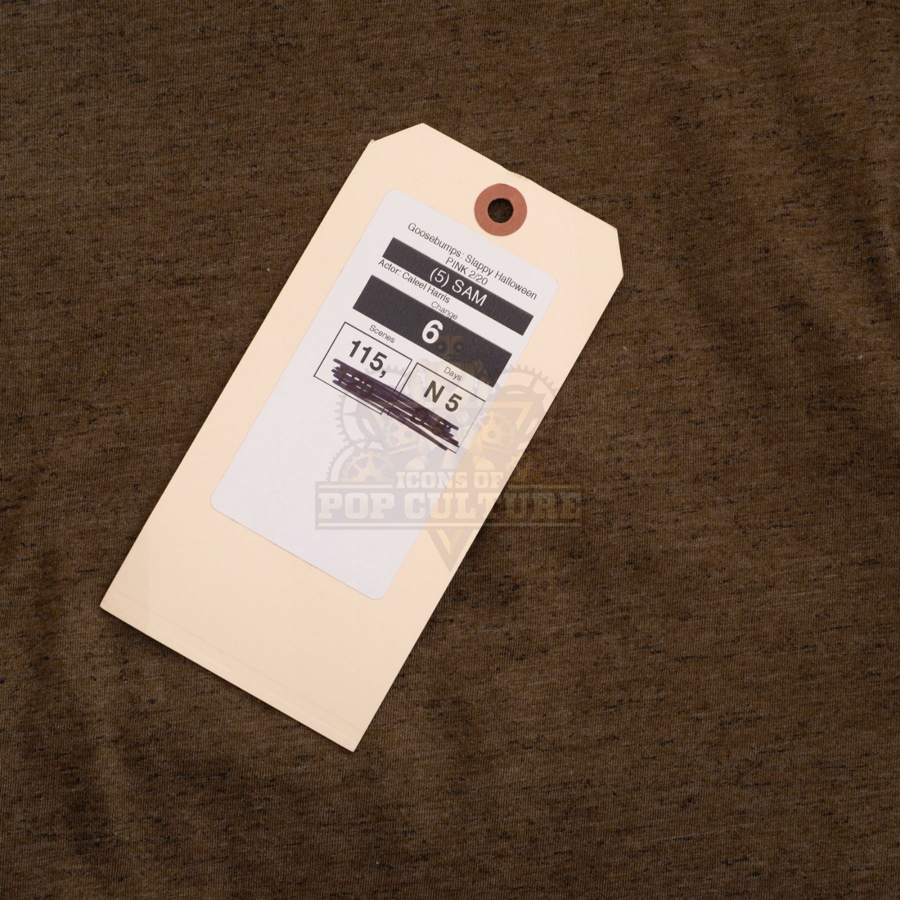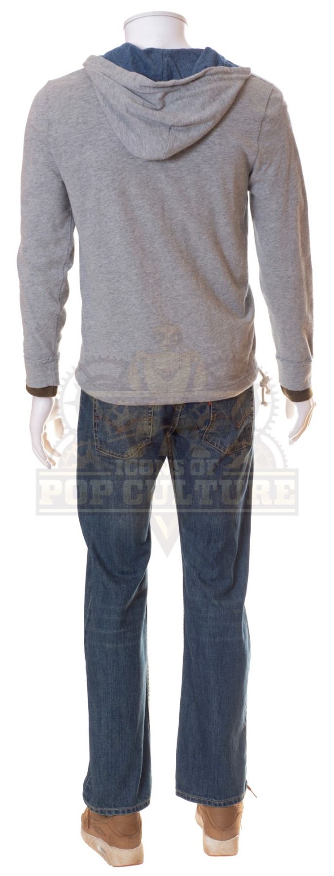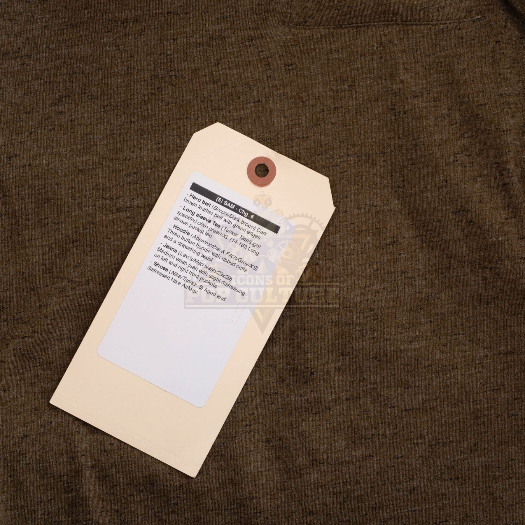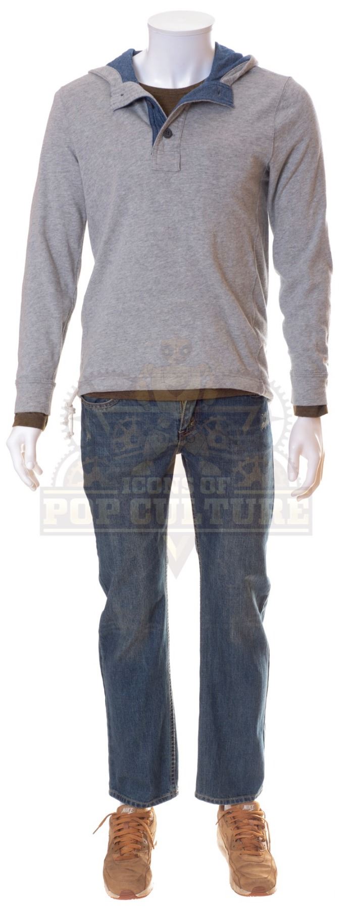 This outfit was acquired by the production for use by Caleel Harris as “Sam”. The outfit consists of a long sleeve olive green shirt, a grey hoodie, a pair of jeans and a pair of Nike sneakers. Included with the outfit is a production used costume tag that details the entire outfit, change and scene numbers used.