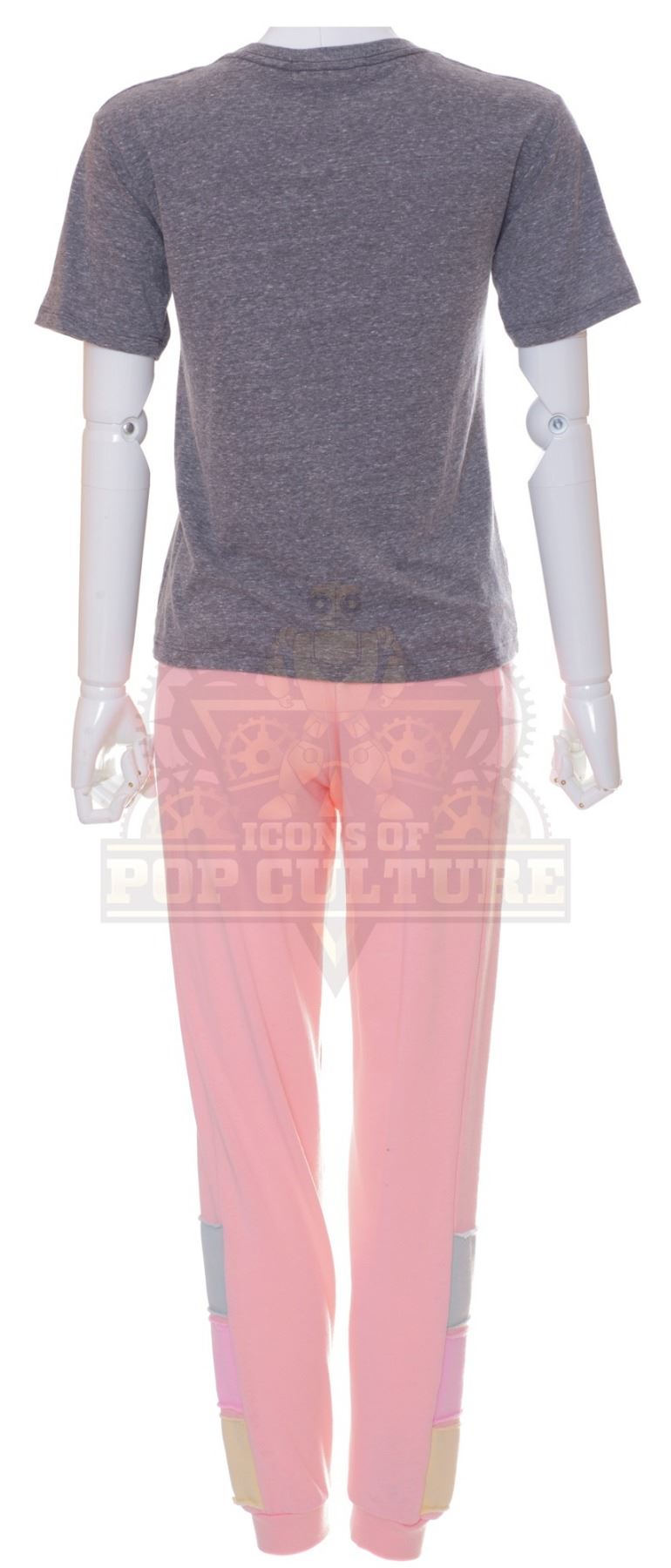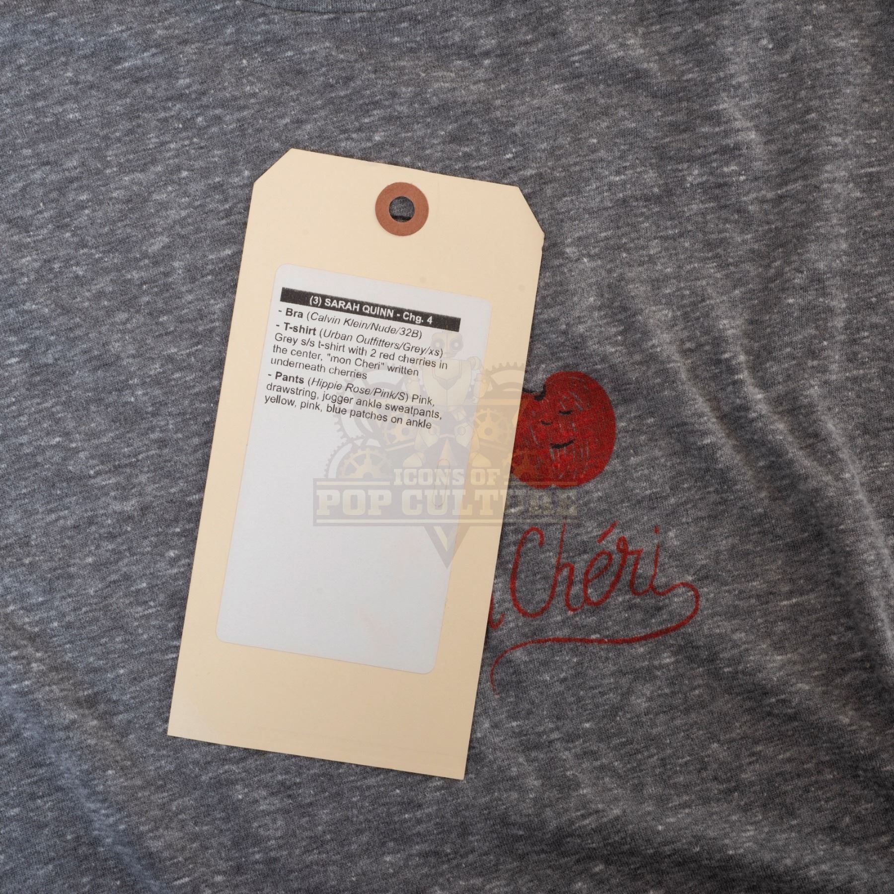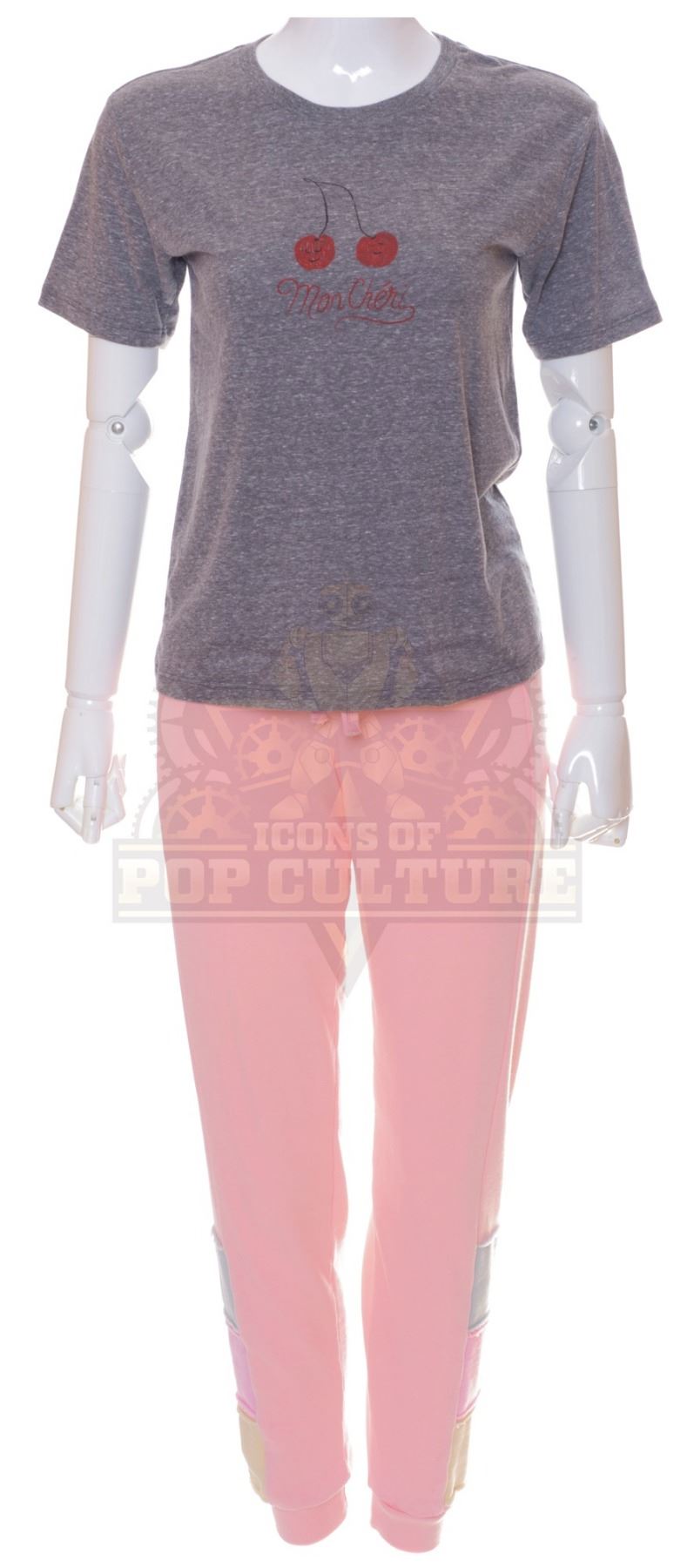 This outfit was acquired by the production for use by Madison Iseman as “Sarah”. The outfit consists of a grey short sleeve shirt with cherries graphic on the chest and a pair of pink, yellow and blue sweatpants. Included with the outfit is a production used costume tag that details the entire outfit, change and scene numbers used.