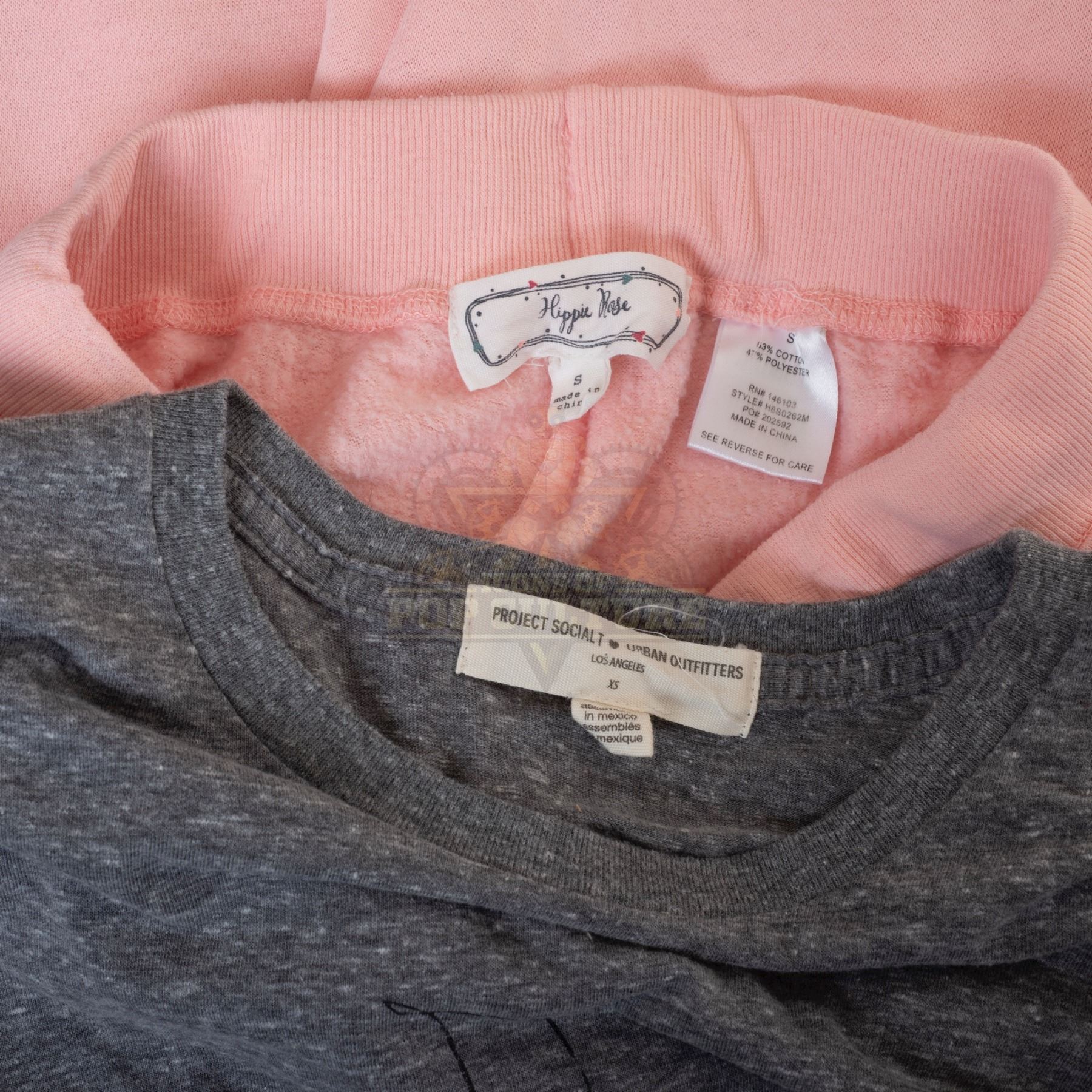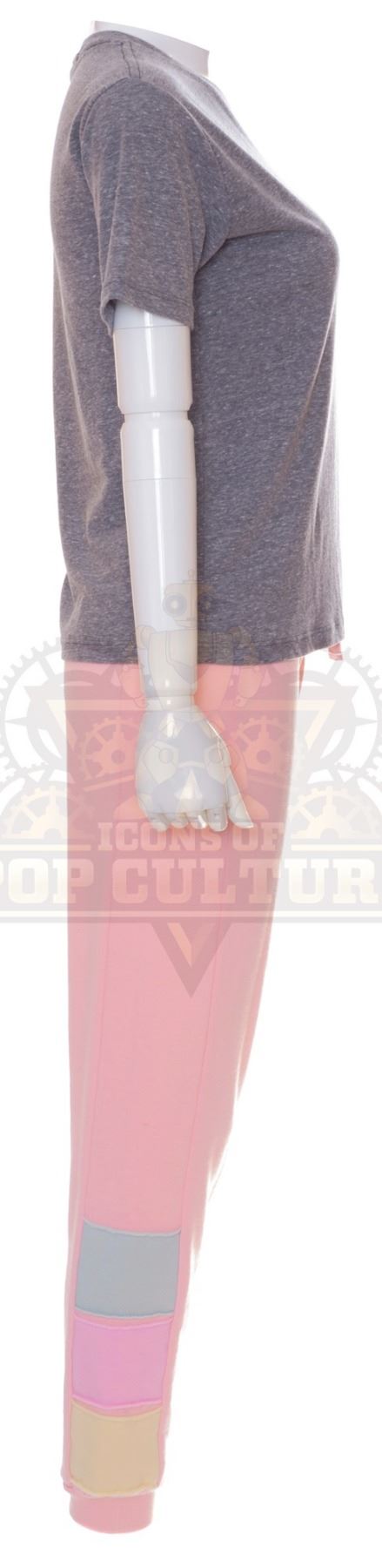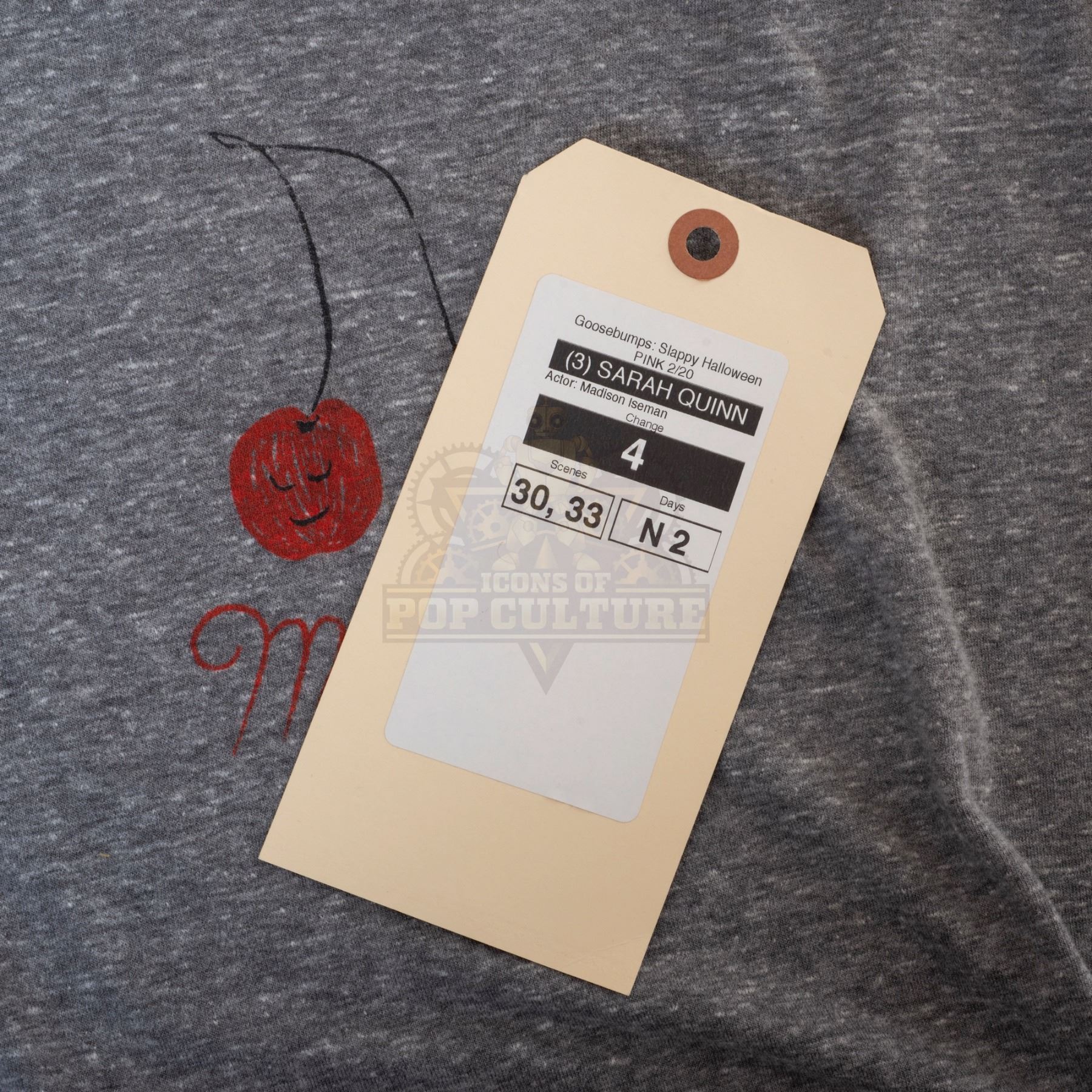 This outfit was acquired by the production for use by Madison Iseman as “Sarah”. The outfit consists of a grey short sleeve shirt with cherries graphic on the chest and a pair of pink, yellow and blue sweatpants. Included with the outfit is a production used costume tag that details the entire outfit, change and scene numbers used.