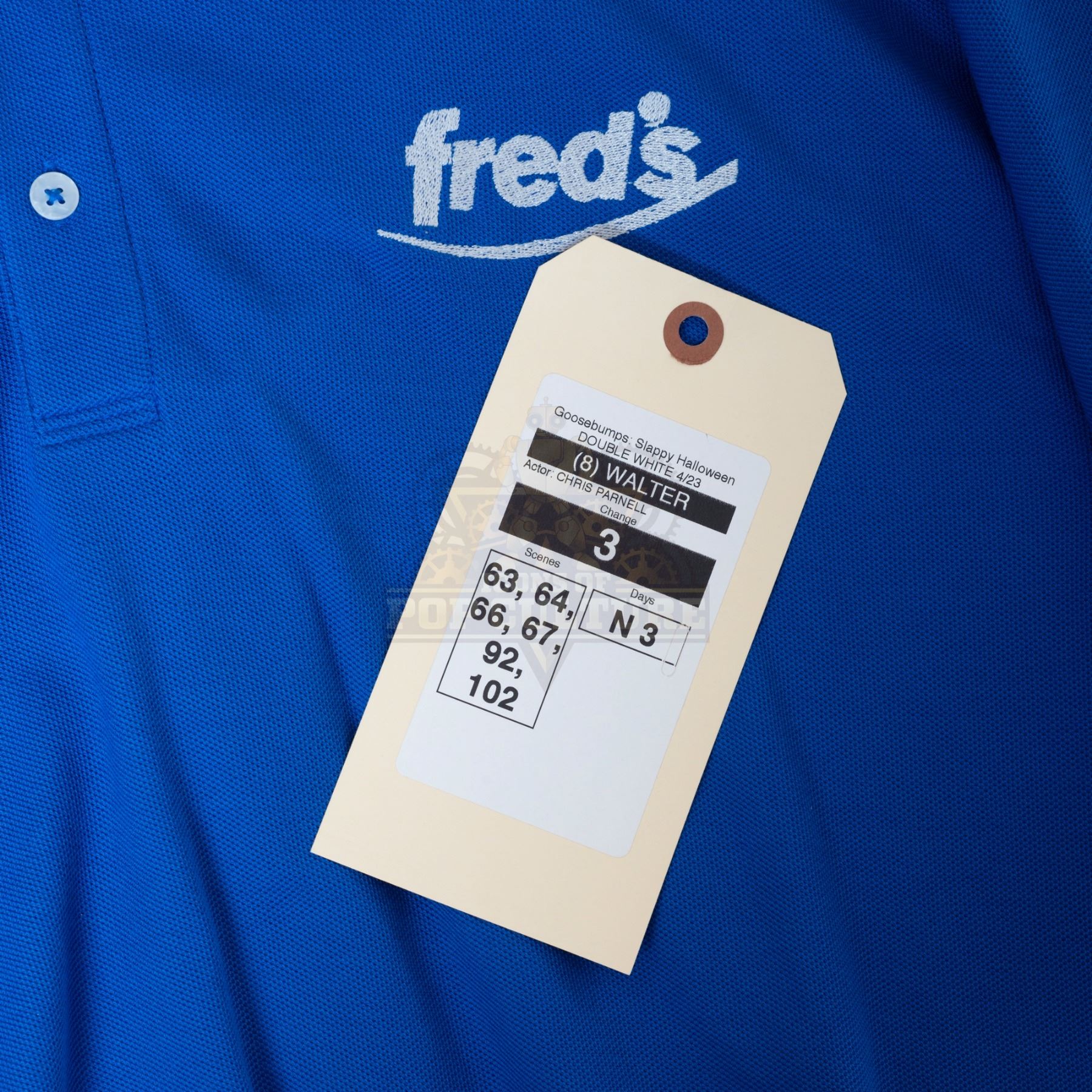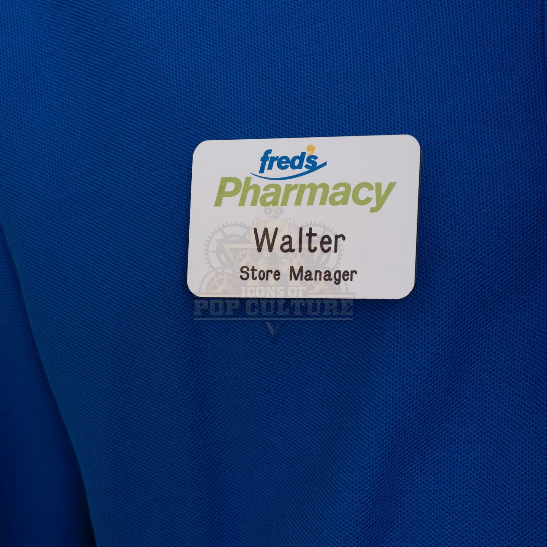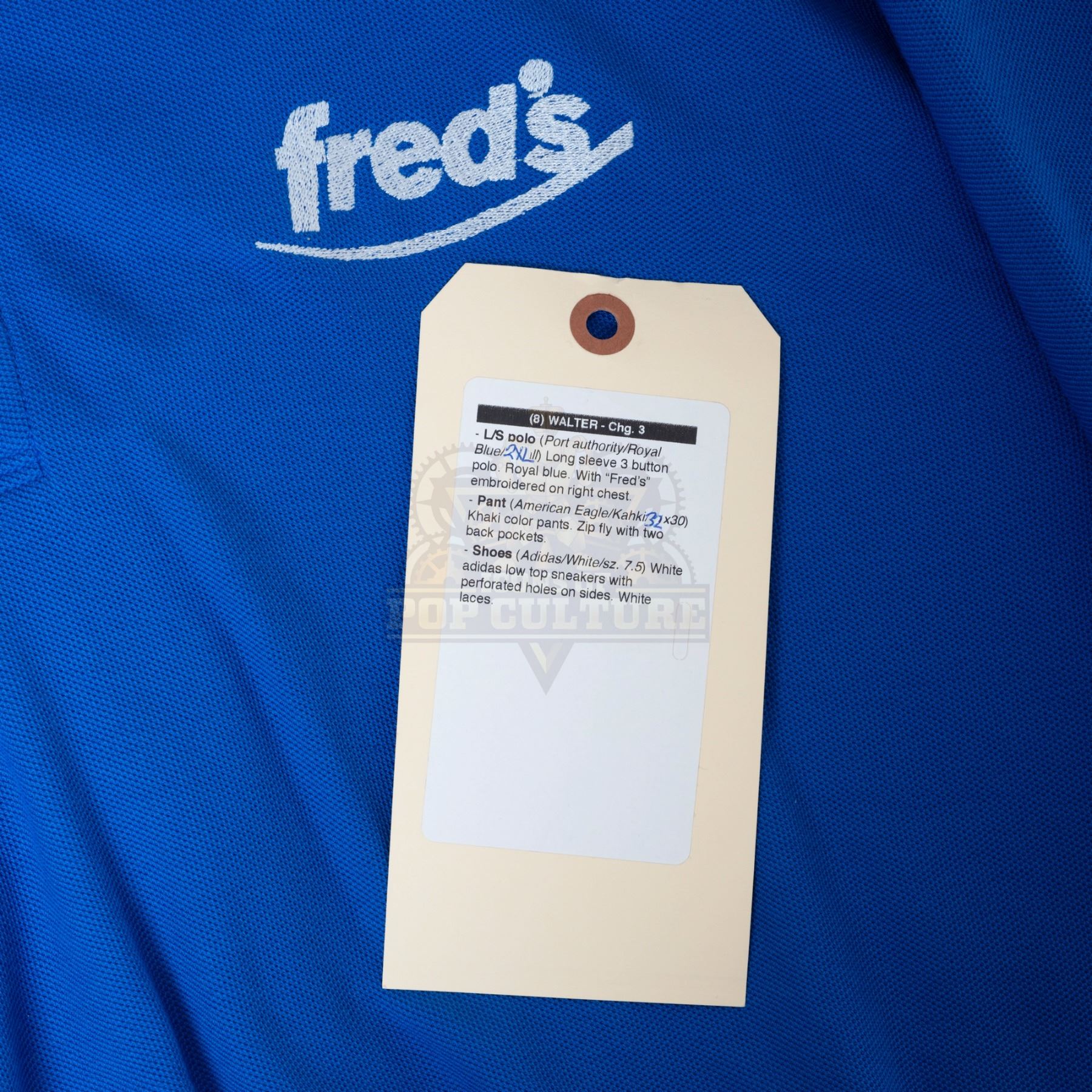 This outfit was acquired by the production for use by Chris Parnell as “Walter the Ogre”. The outfit consists of a distressed blue long sleeve shirt that features “Fred’s Pharmacy” logo embroidered on the left chest and Walter’s “Store Manager” name badge attached to the right chest and a pair of tan pants. Included with the outfit is a production used costume tag that details the entire outfit, change and scene numbers used.