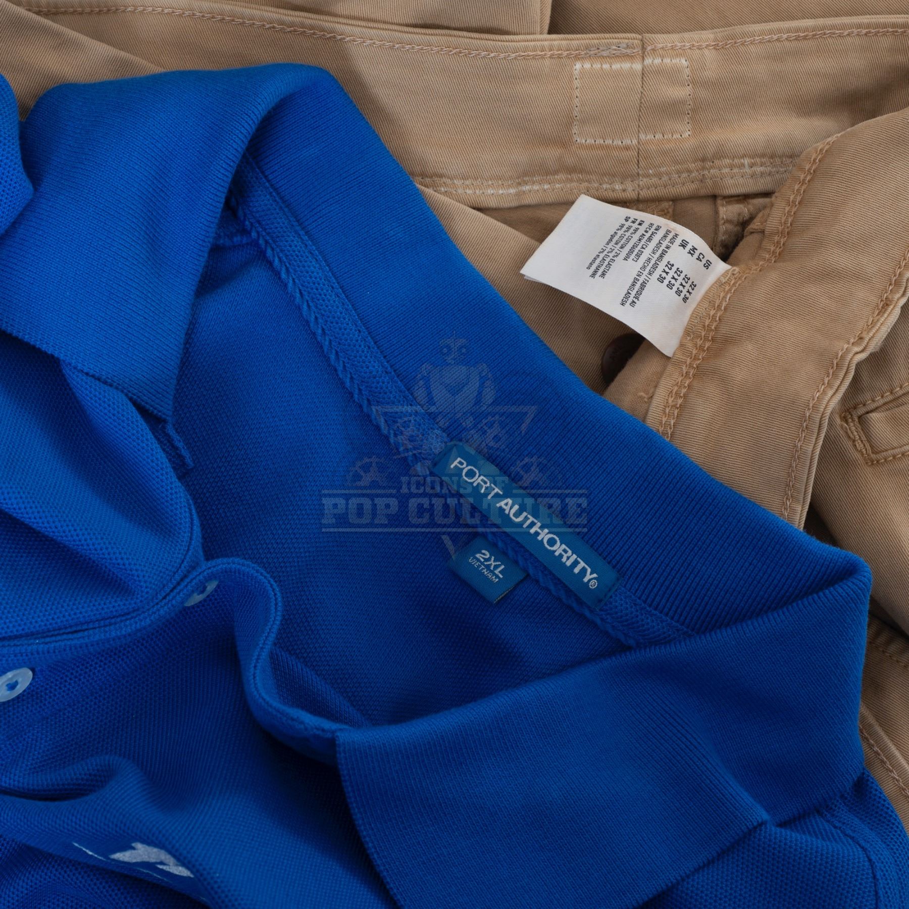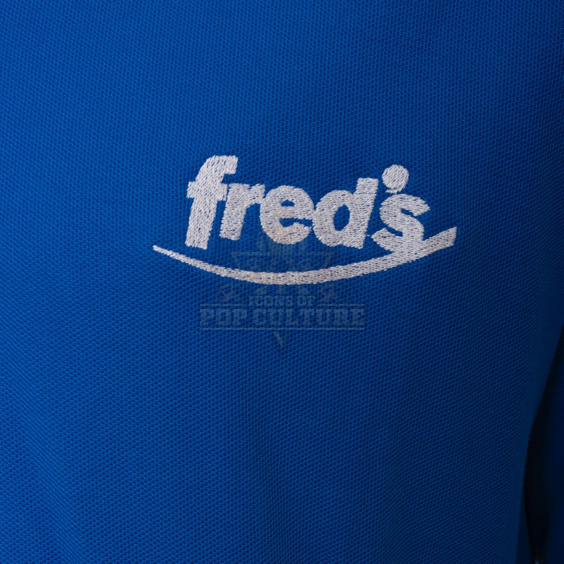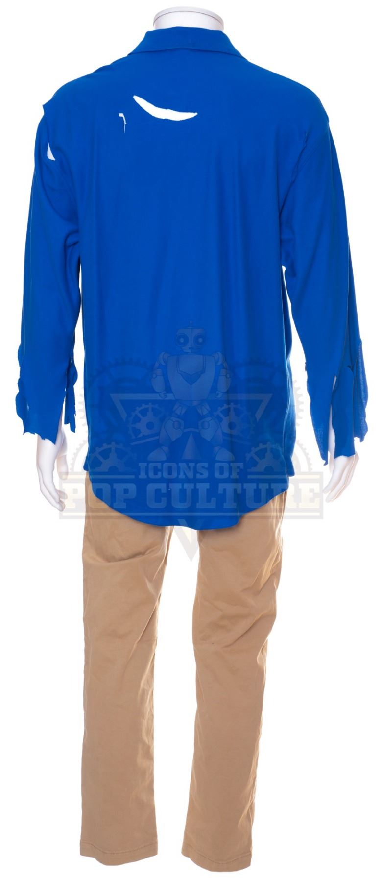 This outfit was acquired by the production for use by Chris Parnell as “Walter the Ogre”. The outfit consists of a distressed blue long sleeve shirt that features “Fred’s Pharmacy” logo embroidered on the left chest and Walter’s “Store Manager” name badge attached to the right chest and a pair of tan pants. Included with the outfit is a production used costume tag that details the entire outfit, change and scene numbers used.