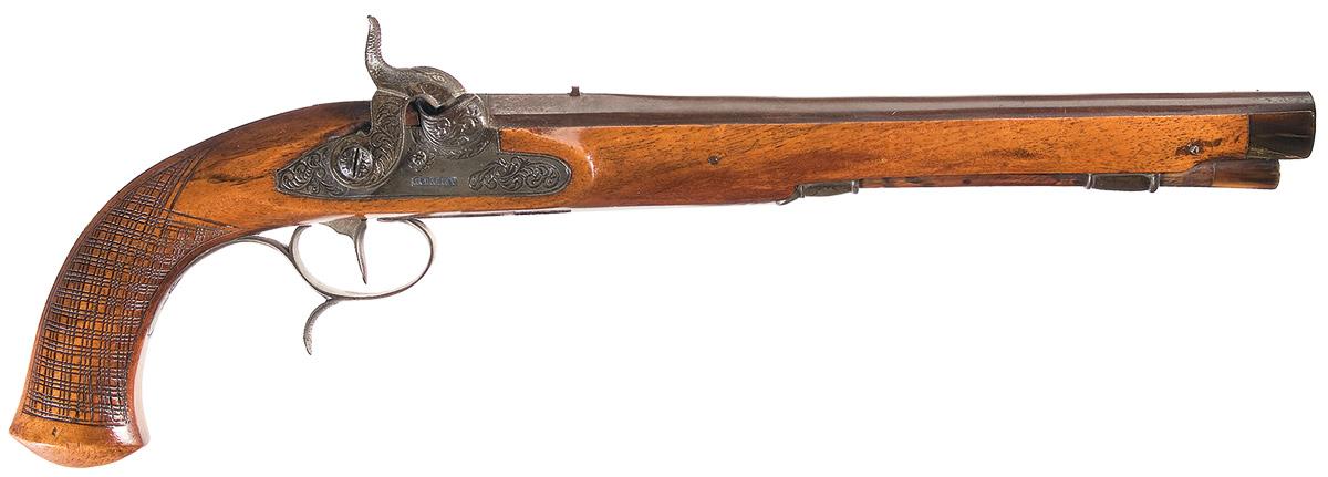 Fixed rear sight, with the front sight lowered and scroll engraving on the tang and breech flats. Additional scroll engraving on the hammer, bolster and lock plate, the latter deeply stamped "GORCKE" ahead of the hammer. Full length stock, with horn tip, horn and metal capped ramrod, engraved ramrod pipe and finger rest trigger guard, checkered wrist and a smooth flared buttplate.
