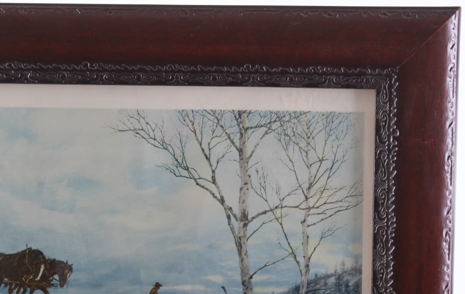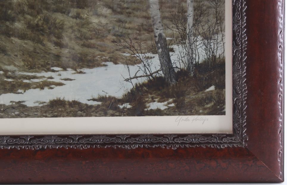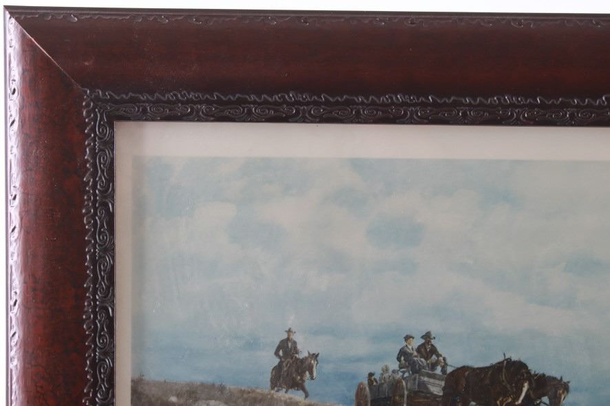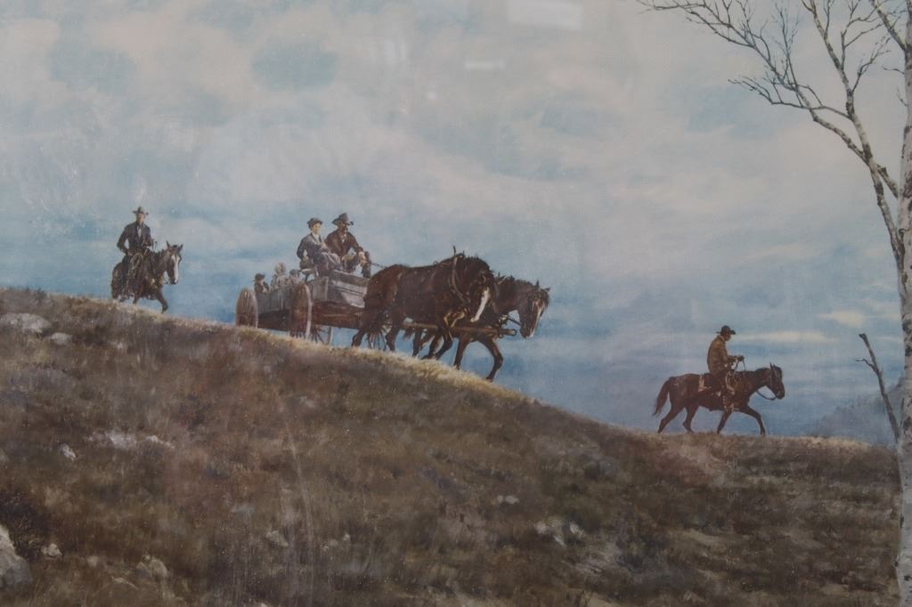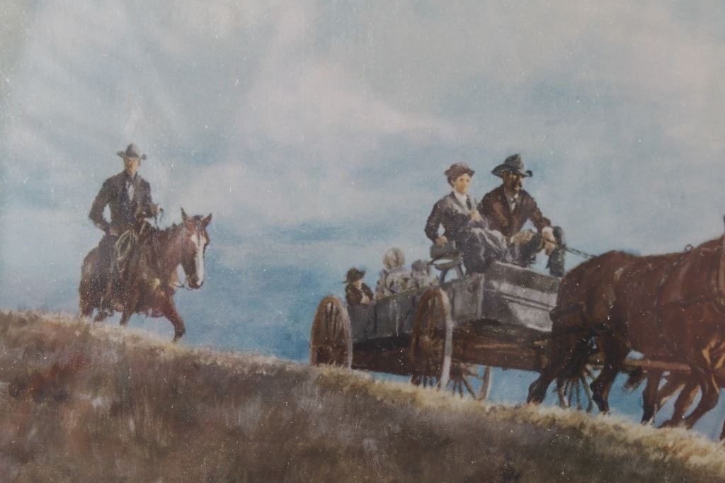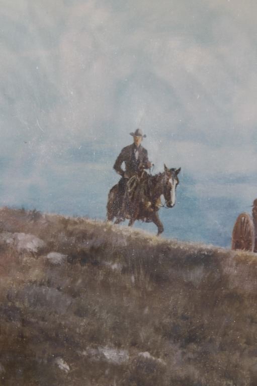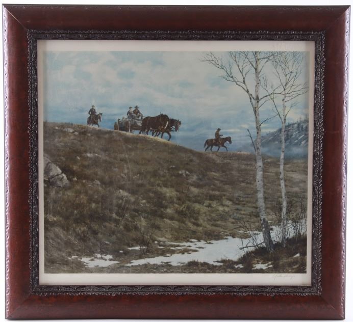 Featured in this lot is this lithograph called "Calling on Neighbors," by Gordon Phillips born 1927 and died 2011. The lithograph shows a wonderfully and professionally crafted design that shows a family in a wagon with two out riders driving along a hillside on a winter day. Gordon Phillips was born in 1927 in Boone, North Carolina. He studied at the Corcoran School of Art in Washington, D.C. and became an illustrator and sculptor of conventional, realistically detailed Western subject matter. Long a commercial artist, Phillips was art director for an advertising agency, placing work in national magazines. He later devoted himself to becoming a fine artist. The condition of this framed lithograph is good with no obvious signs of damage and in good overall condition. The measurements of this framed lithograph are 22 5/8" x 24 1/2" and the visible art measures 17 1/2" x 19 1/2".