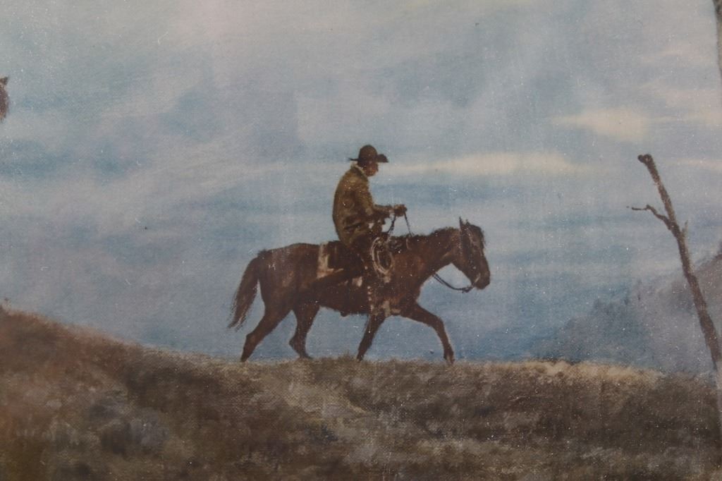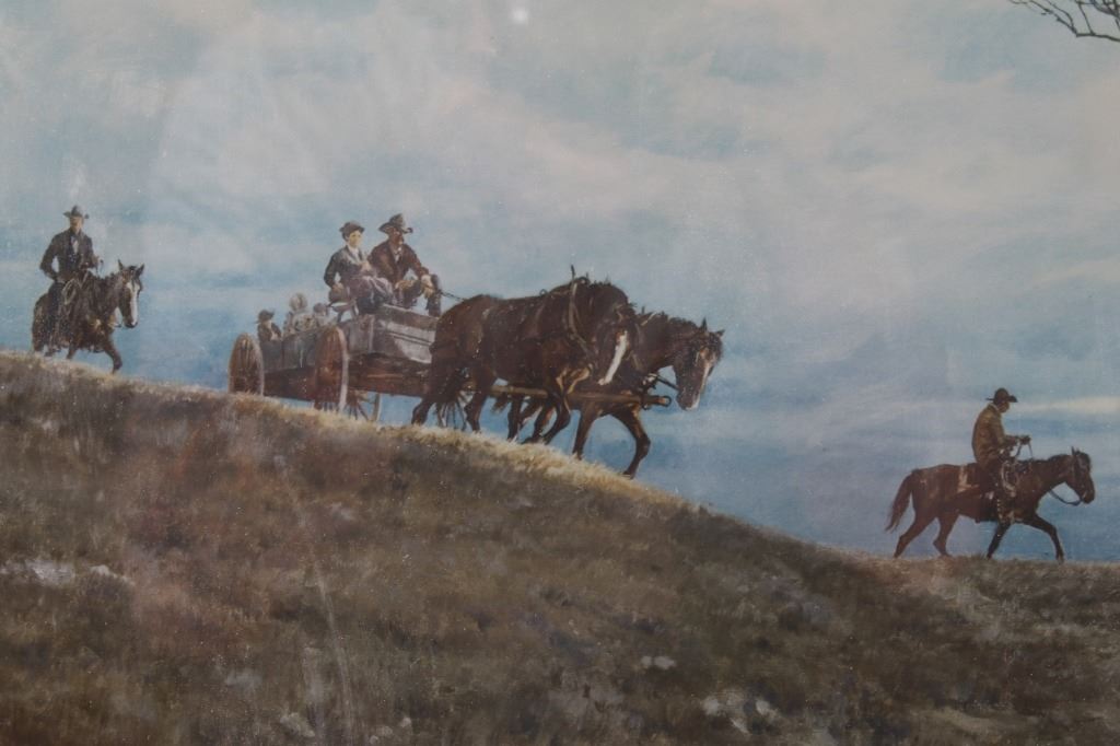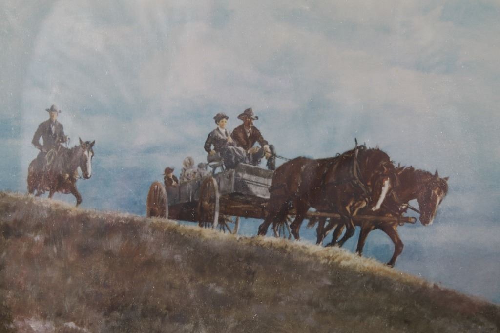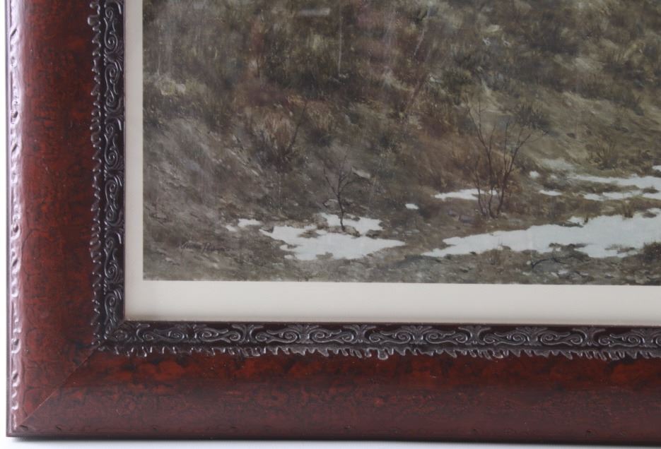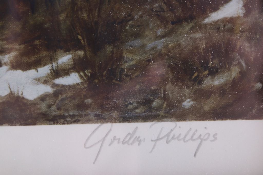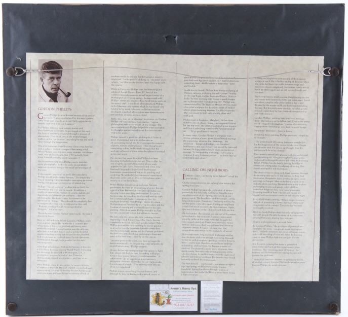 Featured in this lot is this lithograph called "Calling on Neighbors," by Gordon Phillips born 1927 and died 2011. The lithograph shows a wonderfully and professionally crafted design that shows a family in a wagon with two out riders driving along a hillside on a winter day. Gordon Phillips was born in 1927 in Boone, North Carolina. He studied at the Corcoran School of Art in Washington, D.C. and became an illustrator and sculptor of conventional, realistically detailed Western subject matter. Long a commercial artist, Phillips was art director for an advertising agency, placing work in national magazines. He later devoted himself to becoming a fine artist. The condition of this framed lithograph is good with no obvious signs of damage and in good overall condition. The measurements of this framed lithograph are 22 5/8" x 24 1/2" and the visible art measures 17 1/2" x 19 1/2".