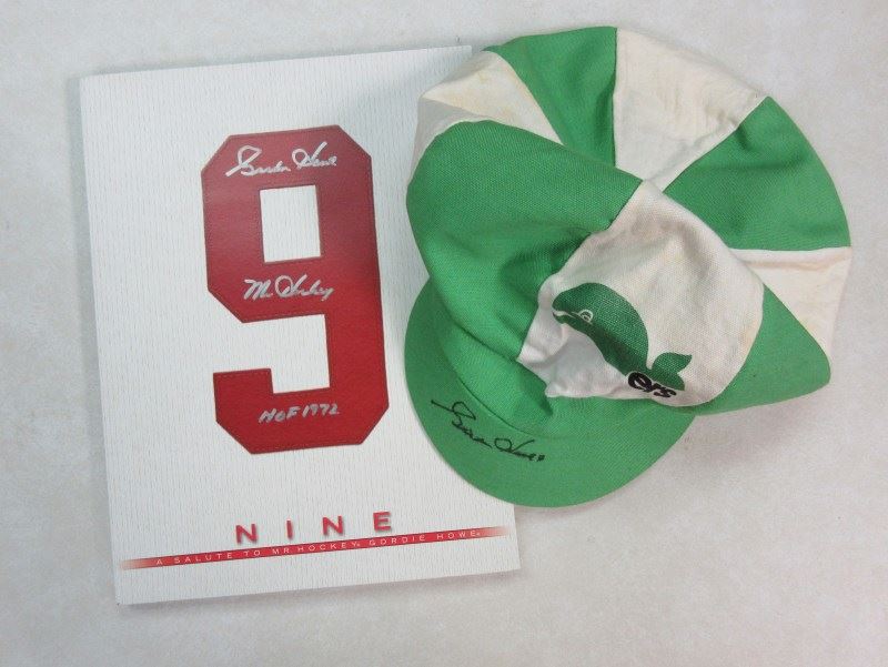 Detroit Red Wings. "Nine" Book Signed with silver sharpie "Gordie Howe Mr Hockey HOF 1972" on front cover. A Salute to Mr. Hockey - COA. New England Whalers Cap Signed by Gordie Howe - COA. Includes Photo of Gordie signing. EST 400.00-450.00
