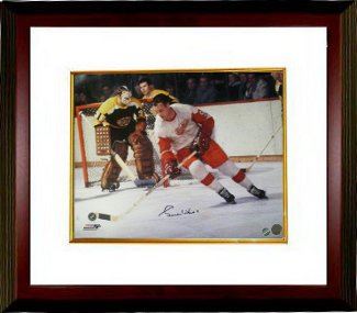 Being most famous for his scoring prowess, physical strength, and the longevity of his career, Howe is the only player to have competed in the NHL in five (1940s through 1980s) different decades. A four-time Stanley Cup champion with the Red Wings, he won six Hart Trophies as the league's most valuable player and six Art Ross Trophies as the leading scorer. He was the recipient of the first NHL Lifetime Achievement Award in 2008. Gordie Howe has hand autographed this Detroit Redwings 16x20 photo vs Boston Bruins. LOJO Hologram and Certificate of Authenticity from Athlon Sports. Custom White Mat and Premium Mahogany Color Framed as shown.