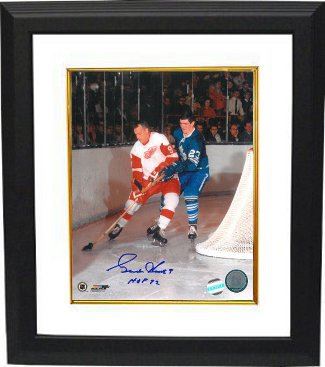 Being most famous for his scoring prowess, physical strength, and the longevity of his career, Howe is the only player to have competed in the NHL in five (1940s through 1980s) different decades. A four-time Stanley Cup champion with the Red Wings, he won six Hart Trophies as the league's most valuable player and six Art Ross Trophies as the leading scorer. He was the recipient of the first NHL Lifetime Achievement Award in 2008. Gordie Howe has hand autographed this Detroit Redwings 8x10 photo with HOF 72 inscription. LOJO Hologram and Certificate of Authenticity from Athlon Sports. Custom White Mat and Premium Black Color Framed as shown.