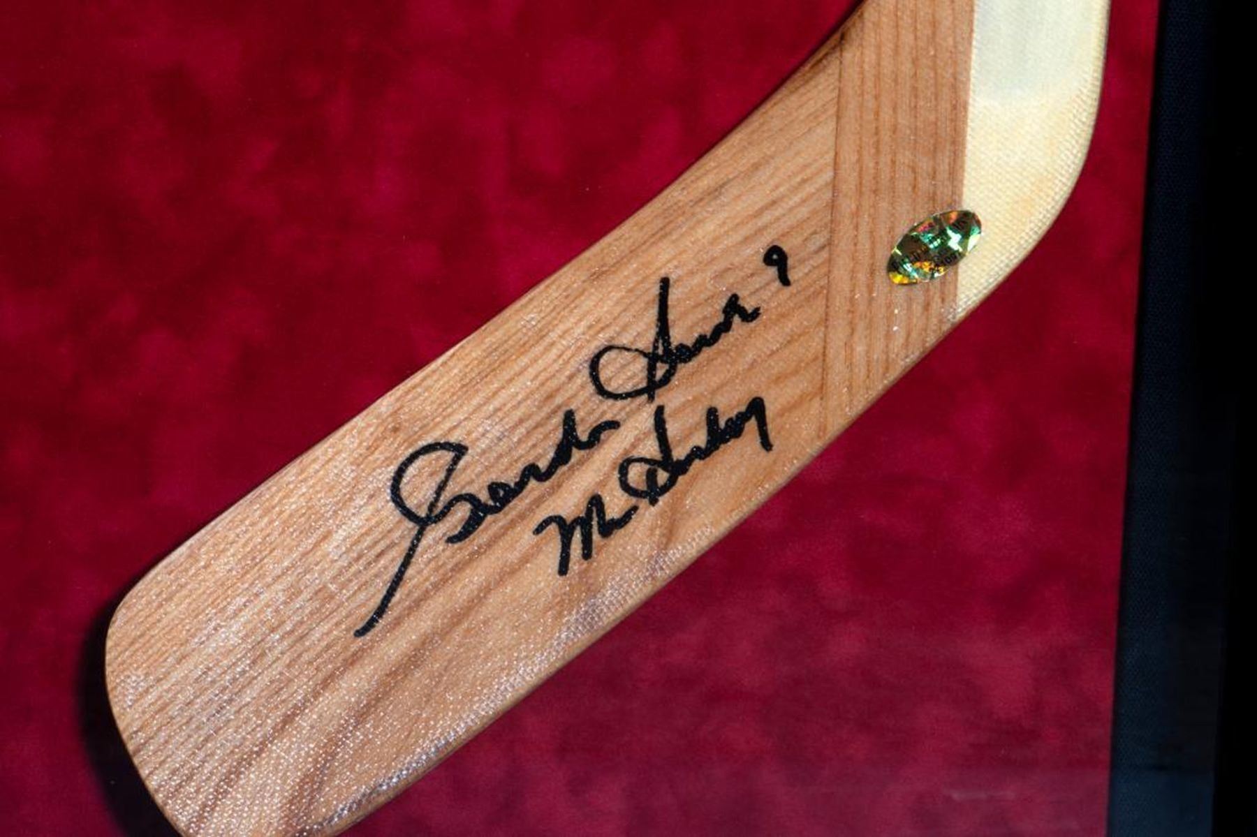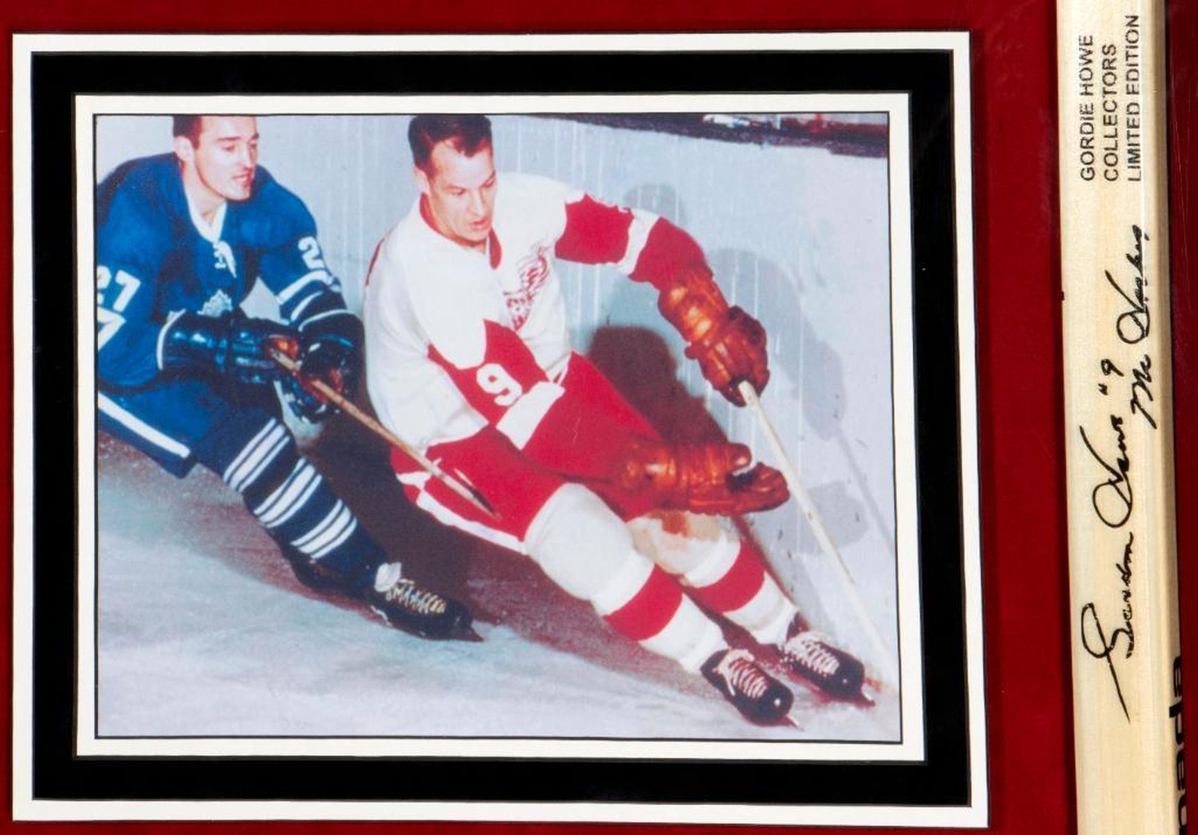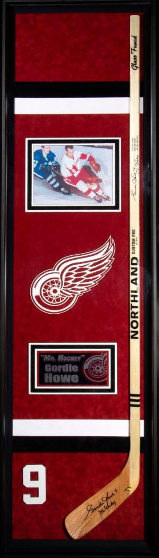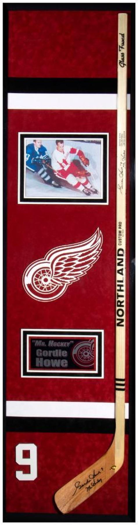 Framed Gordie Howe signed hockey stick. Height: 71 inches. Width: 19 1/2 inches. Depth: 3 inches.