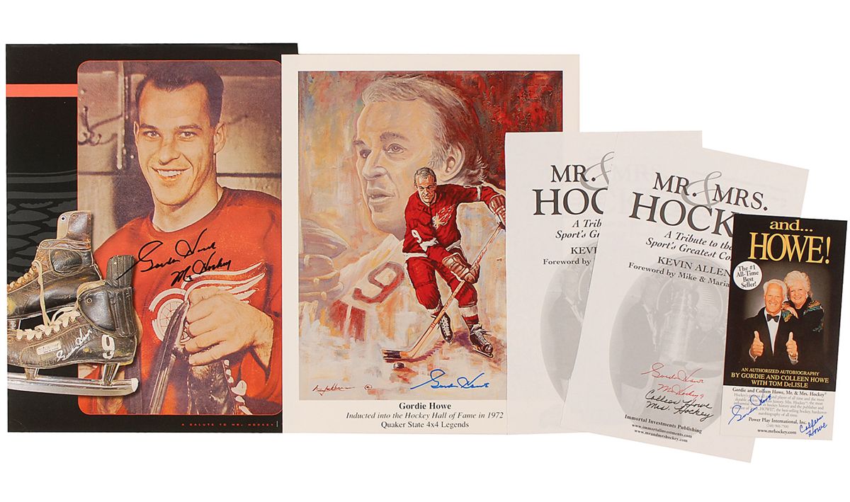 Five items: two title pages from Mr. & Mrs. Hockey, each signed by Gordi and Colleen Howe; a color promotional flyer for Howe’s book, signed in blue felt tip by both Gordie and Colleen; a color 8.5 x 11 print, signed in blue felt tip; and a color book photo, signed in black felt tip. In fine condition.